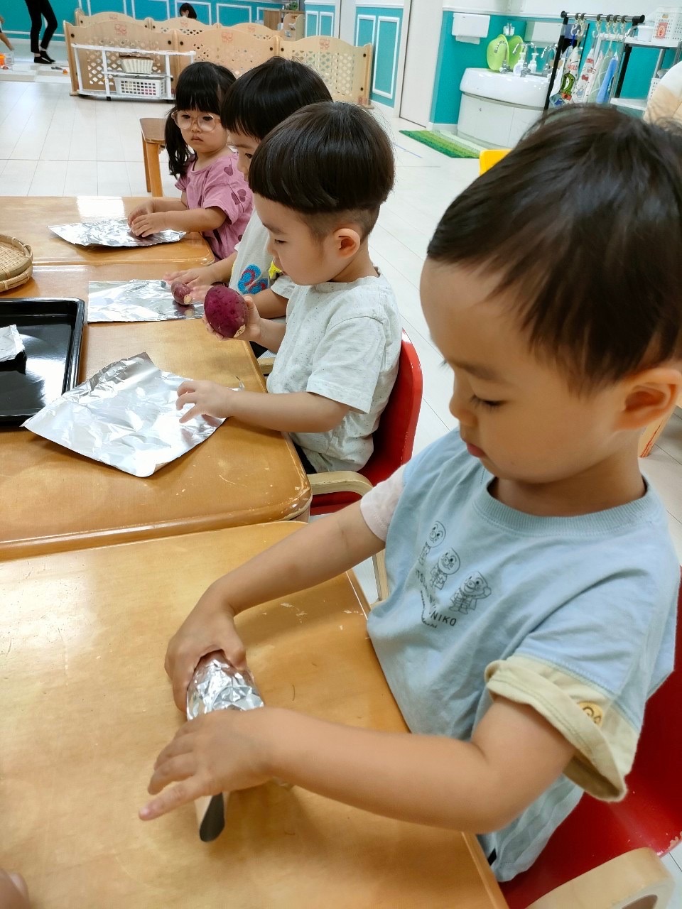 焼き芋にしてもらうためにアルミホイルを巻きました!