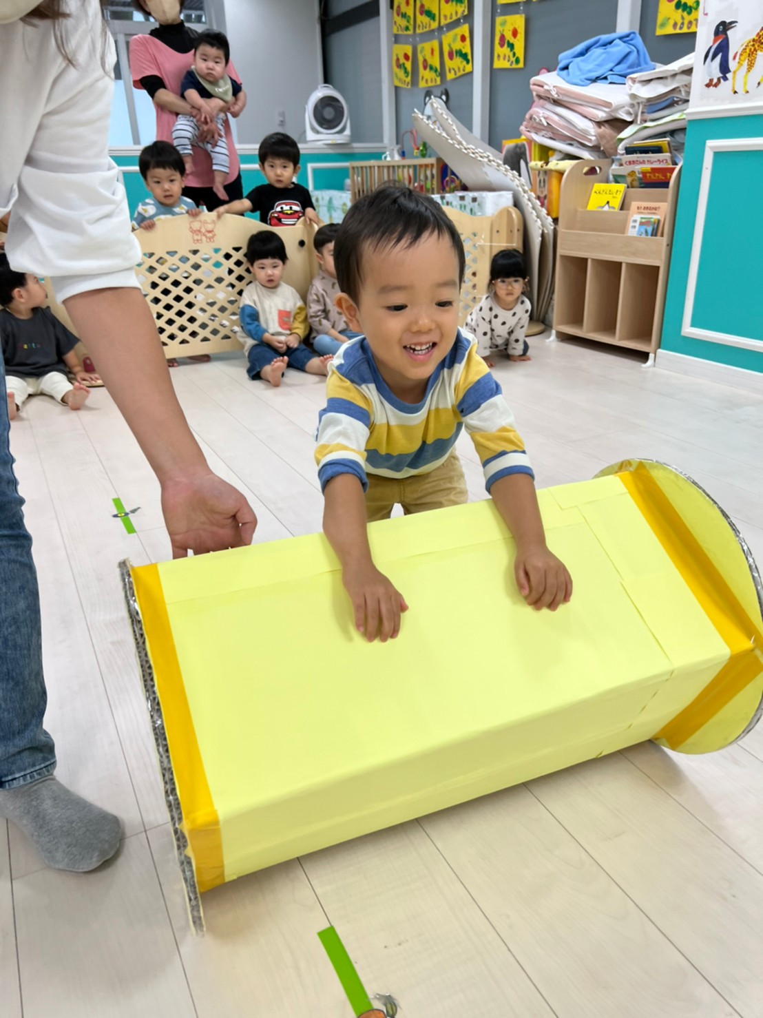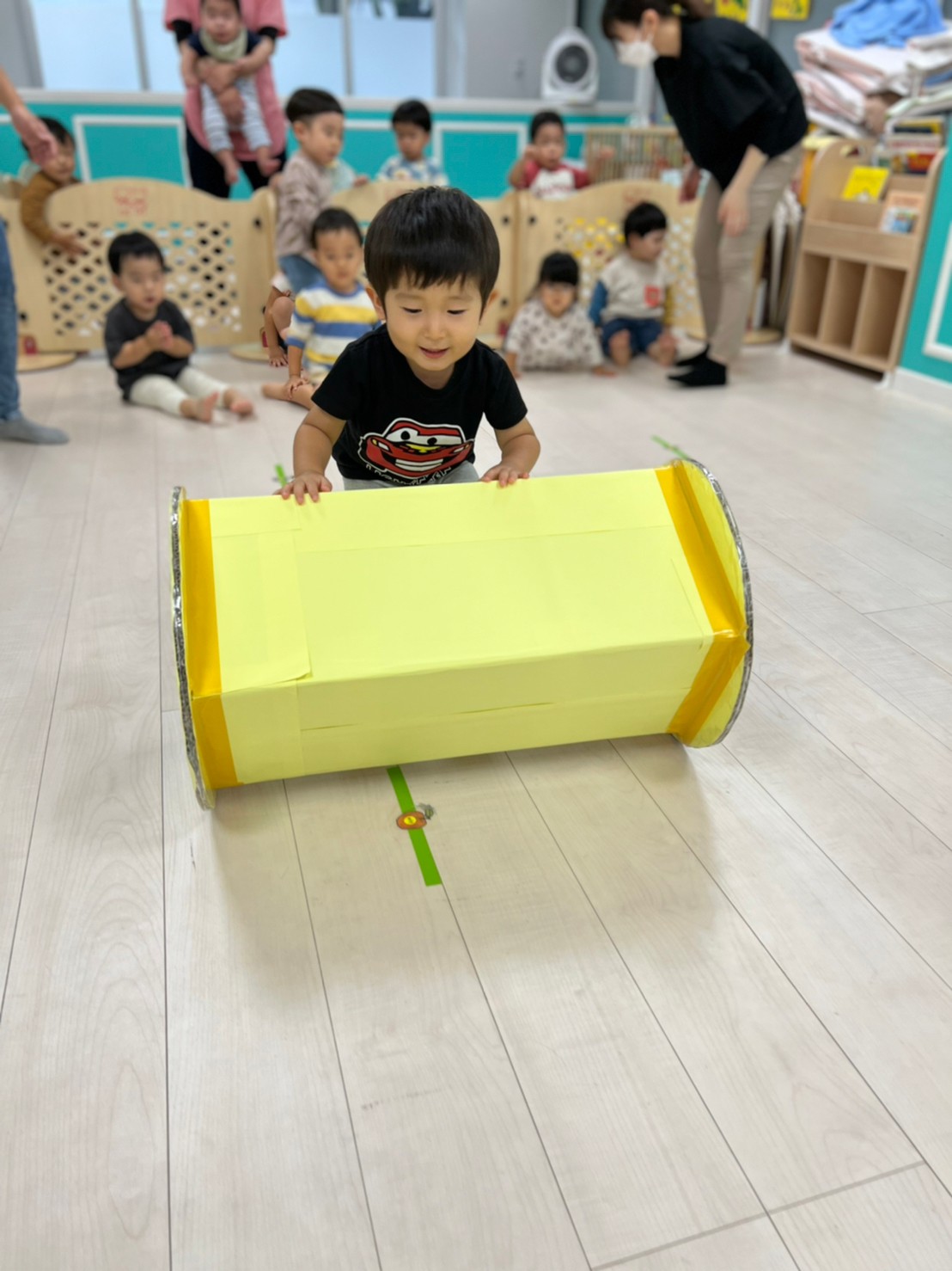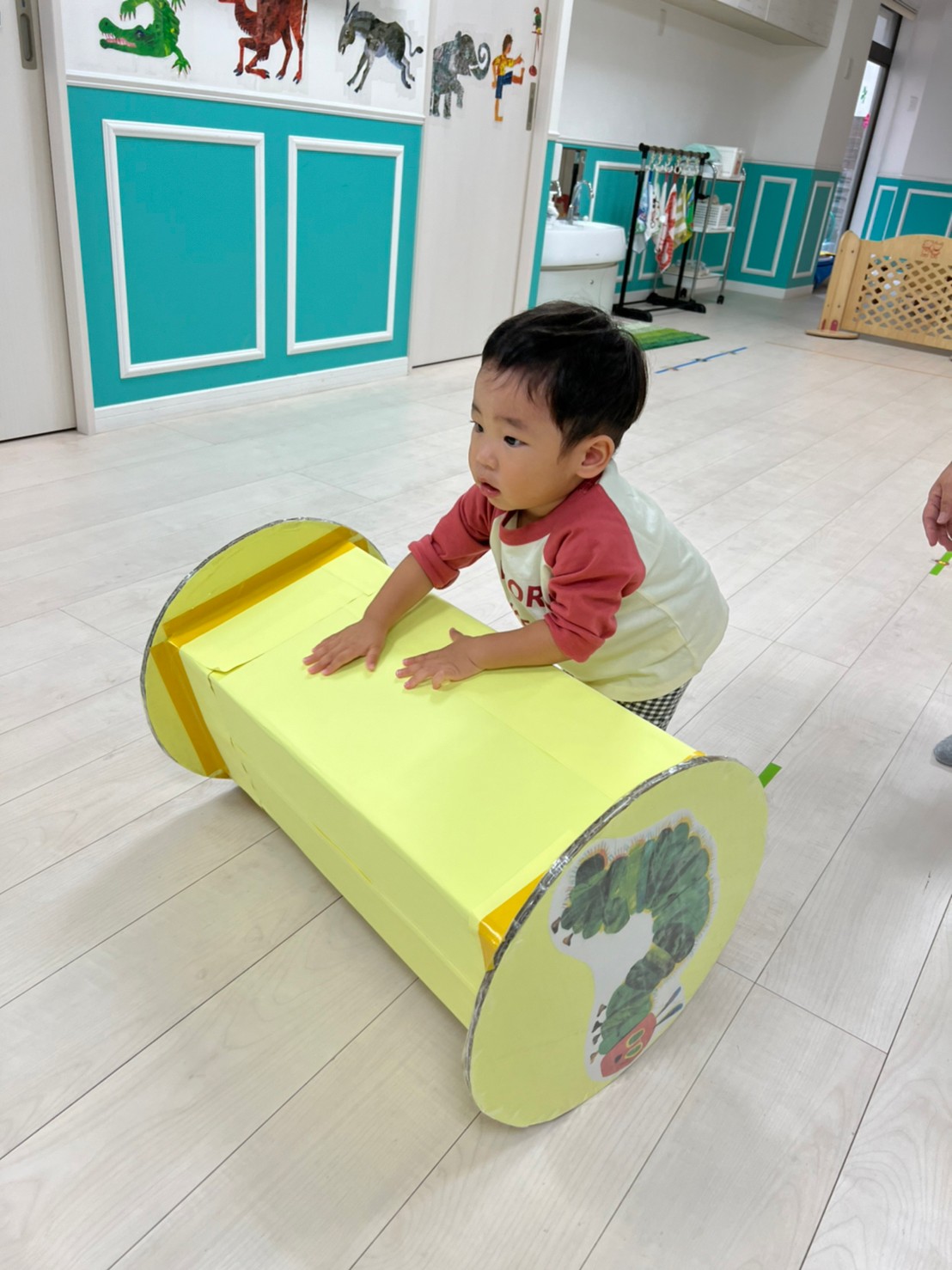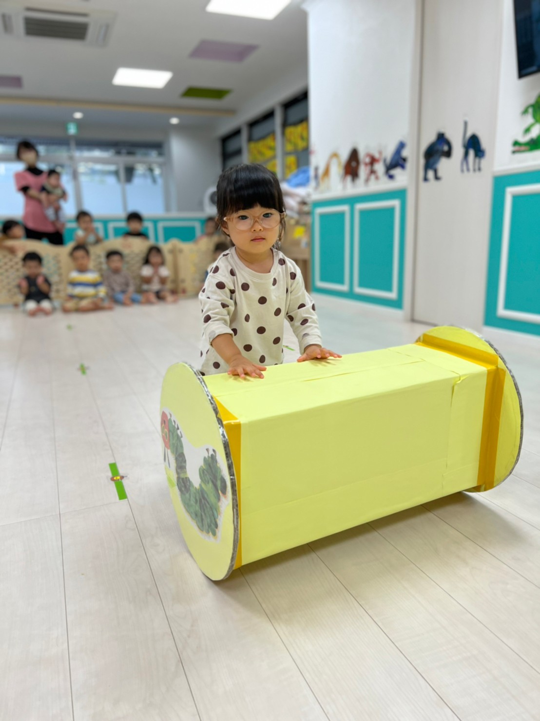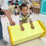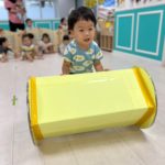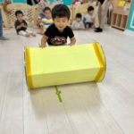あおむし転がしの練習をしましたよ!!手作りなので不安もありましたが(笑)手を動かして転がしていきます!バランスが難しいので、練習していきます😉次はりんごマークをつけて転がしてみます🍎みんなの応援もステキでした🙌