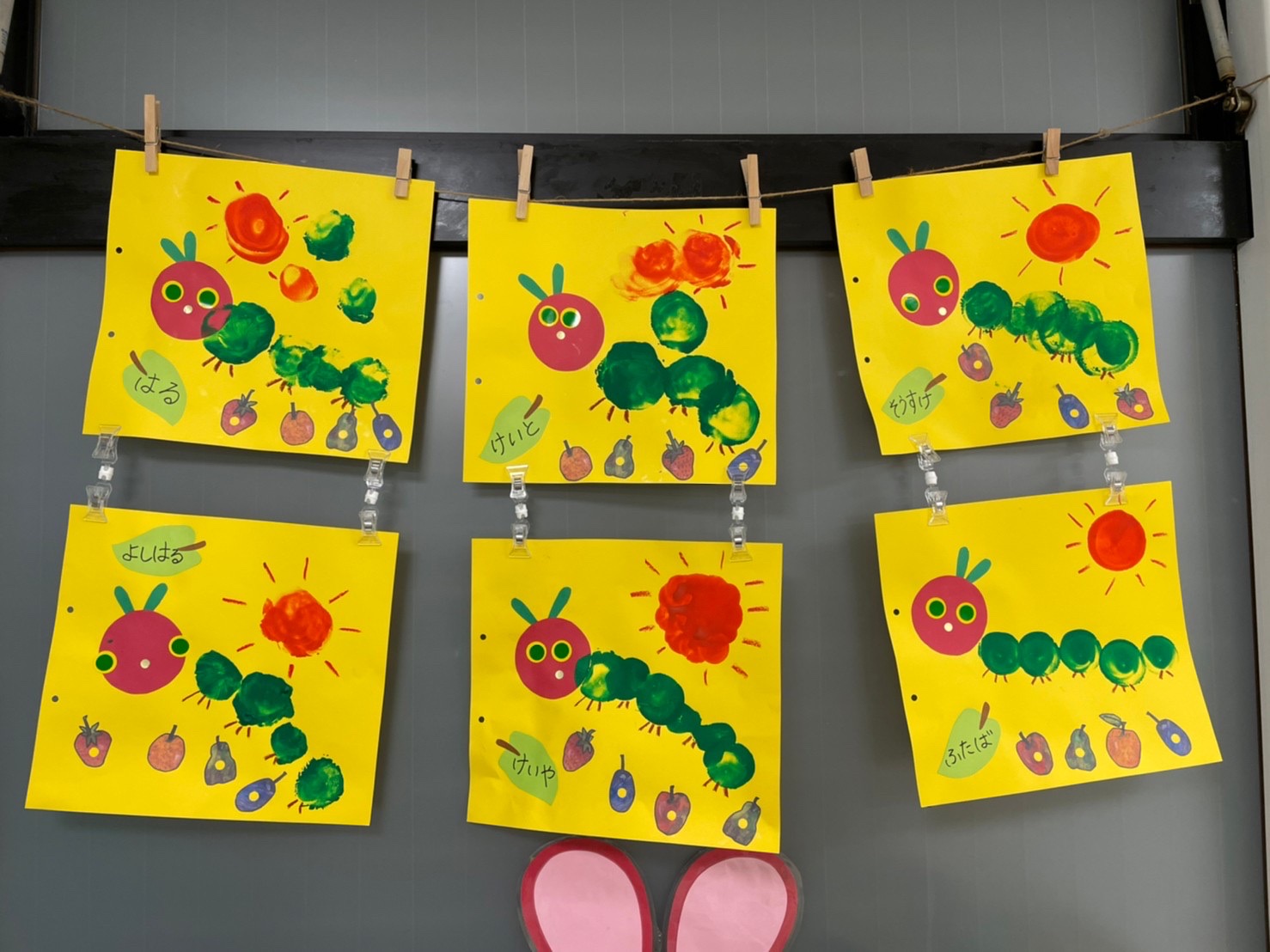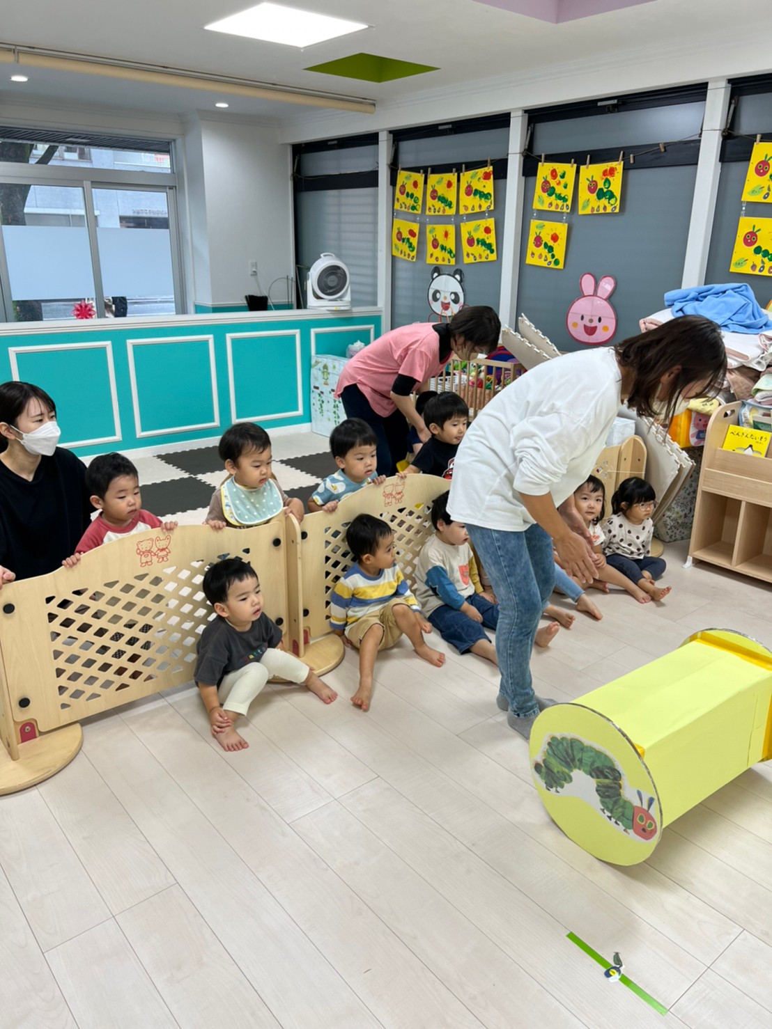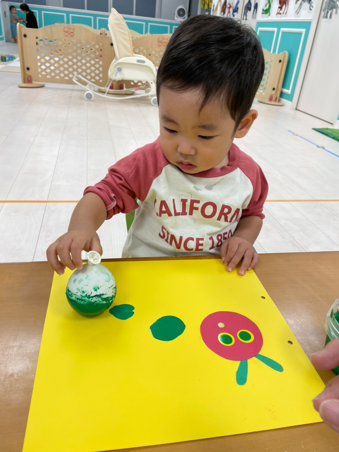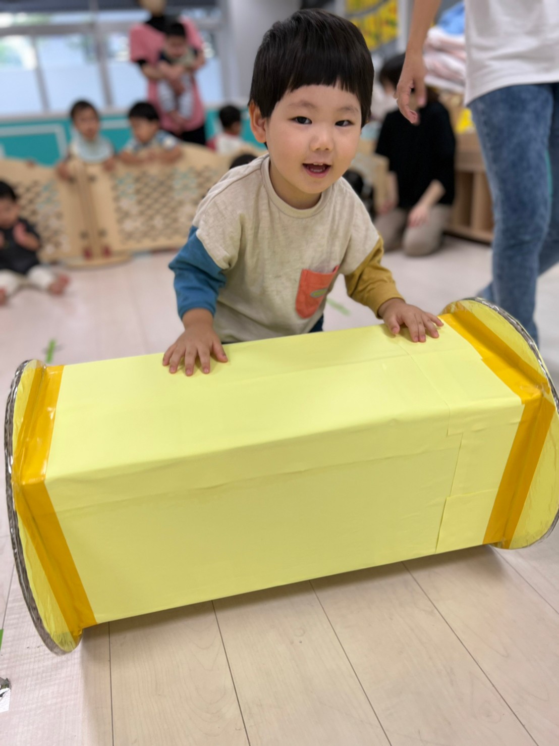 あおむし転がしの練習をしましたよ!!手作りなので不安もありましたが(笑)手を動かして転がしていきます!バランスが難しいので、練習していきます😉次はりんごマークをつけて転がしてみます🍎みんなの応援もステキでした🙌