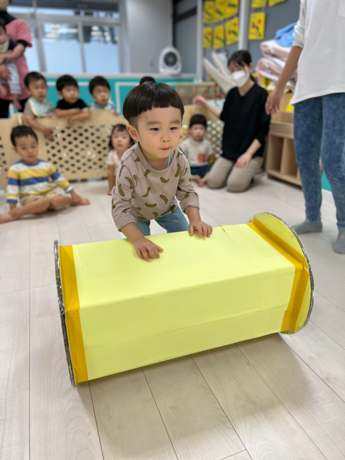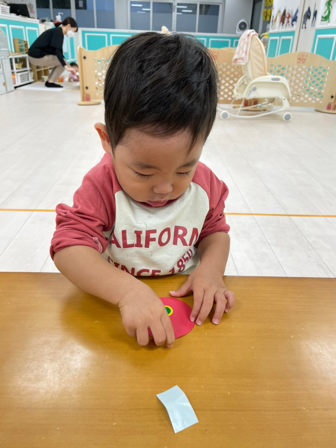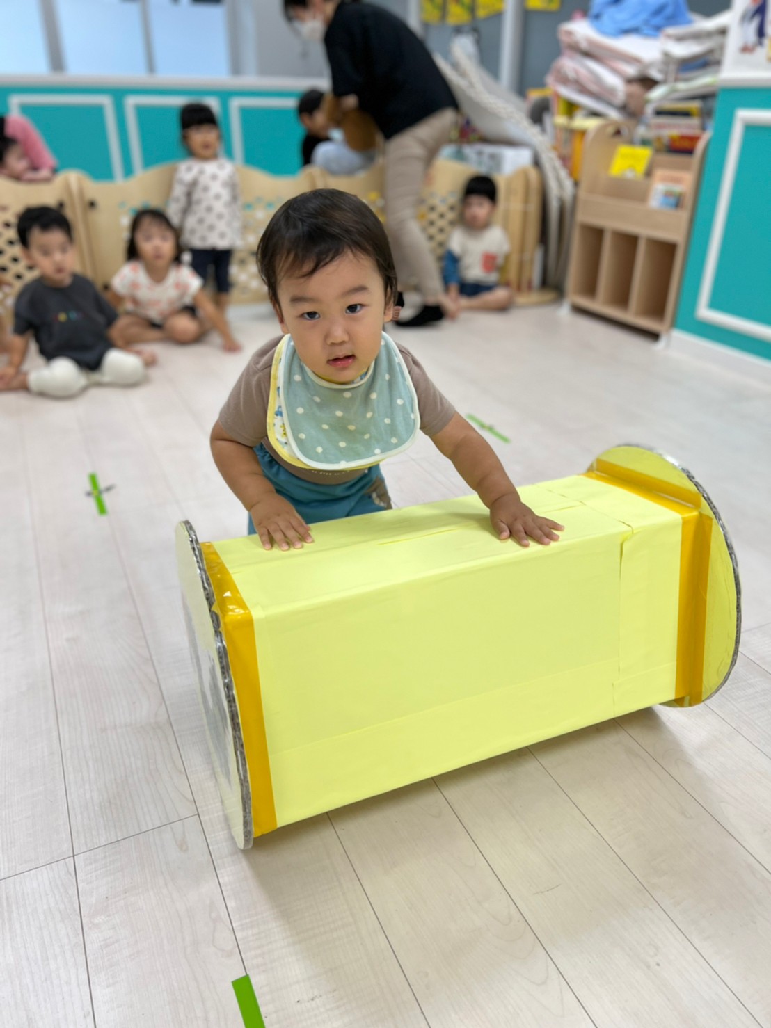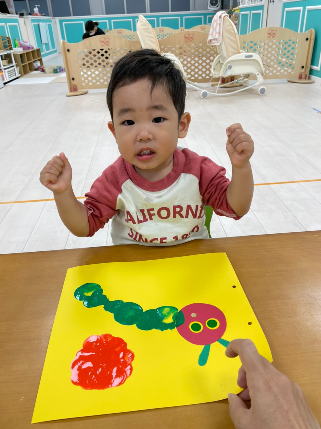 あおむし転がしの練習をしましたよ!!手作りなので不安もありましたが(笑)手を動かして転がしていきます!バランスが難しいので、練習していきます😉次はりんごマークをつけて転がしてみます🍎みんなの応援もステキでした🙌
