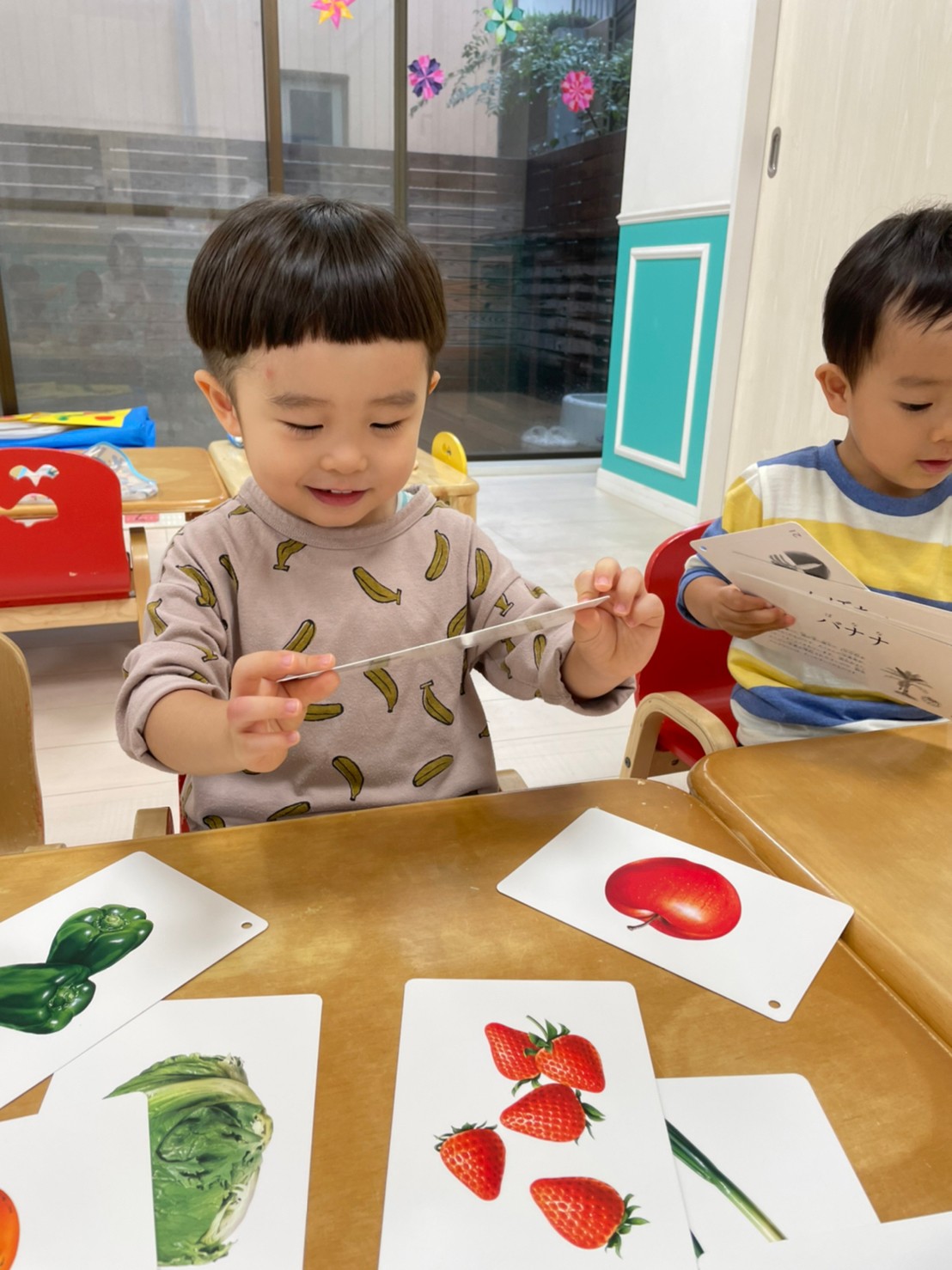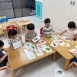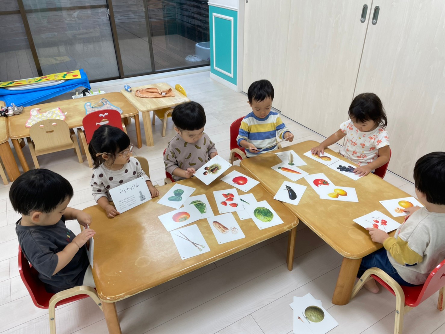 フラッシュカードを使って、秋の果物、野菜を知りましたよ🍅🧅🥦🍇🍌🍋🍎