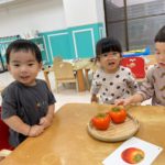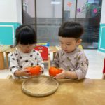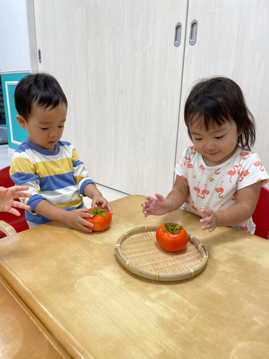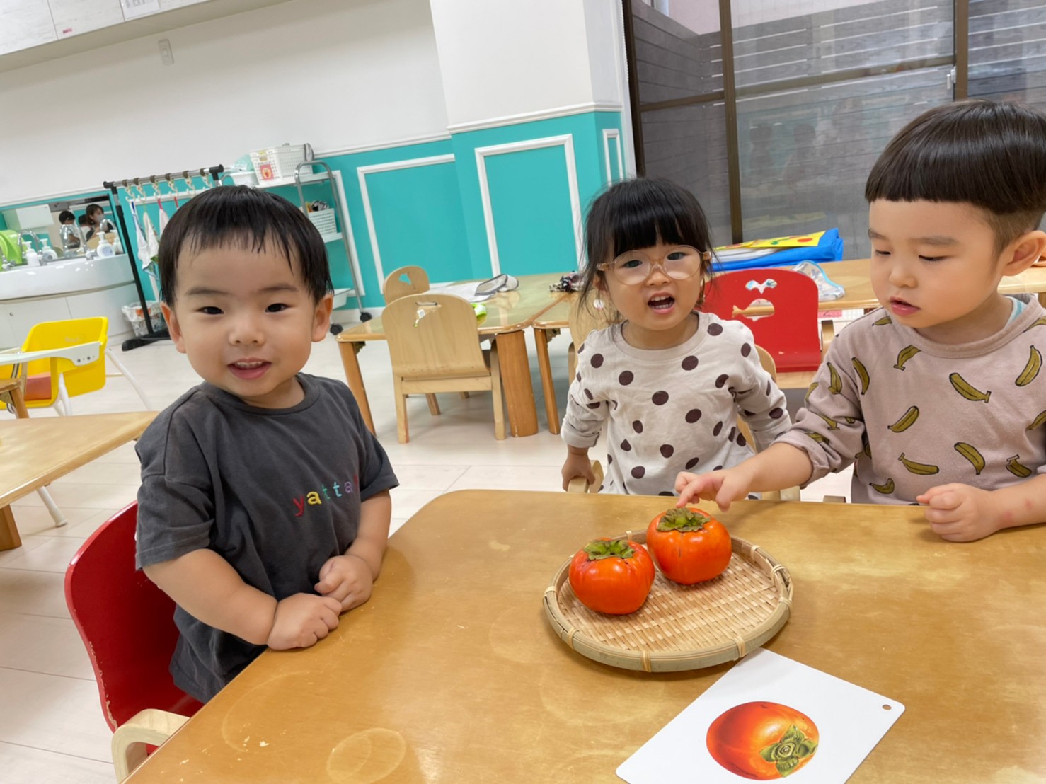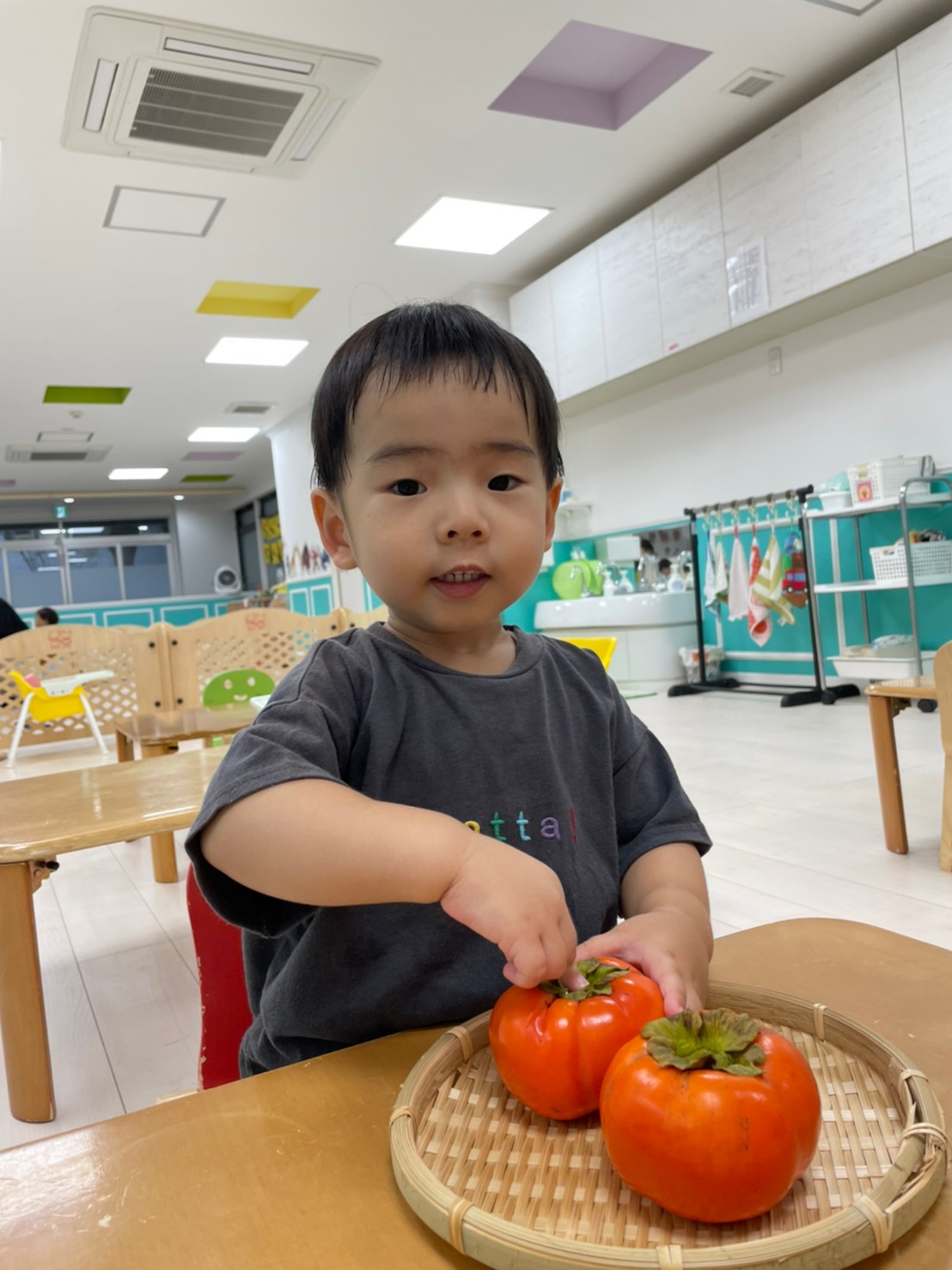 2歳児さんは、食育をしました!柿に触れました。「おもいね~かたいね~」と話してましたよ!