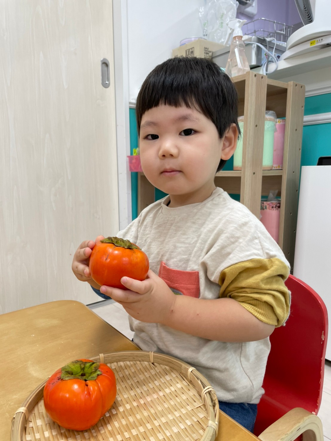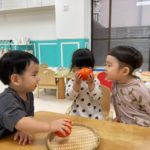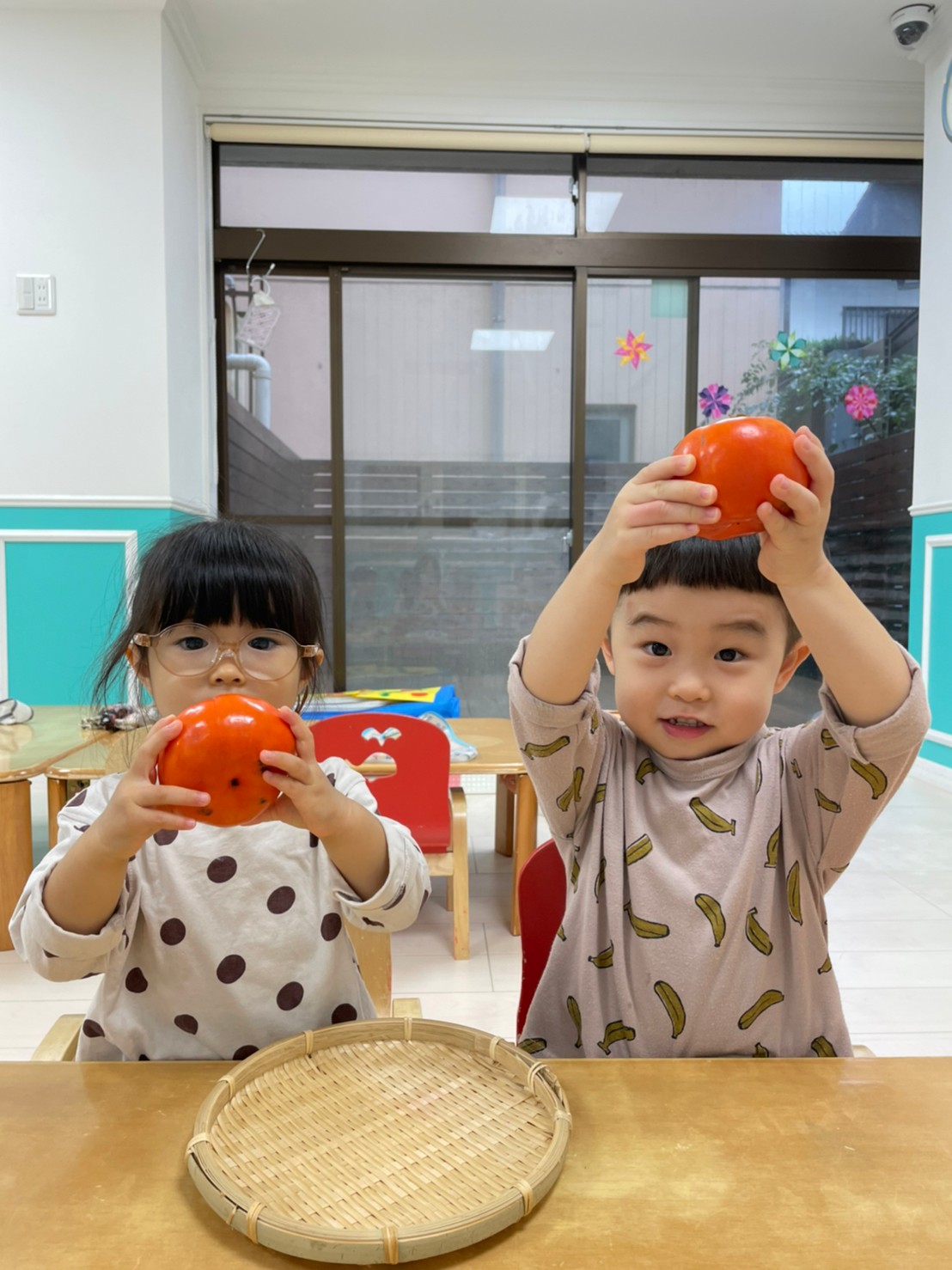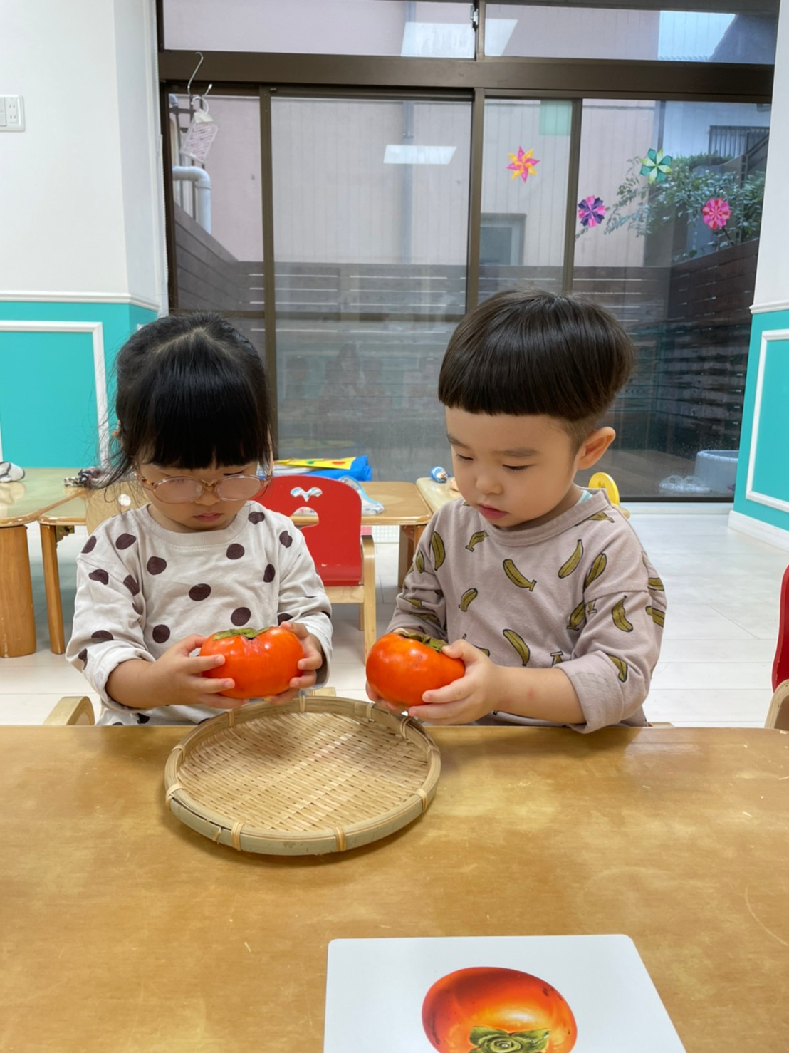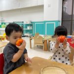 2歳児さんは、食育をしました!柿に触れました。「おもいね~かたいね~」と話してましたよ!