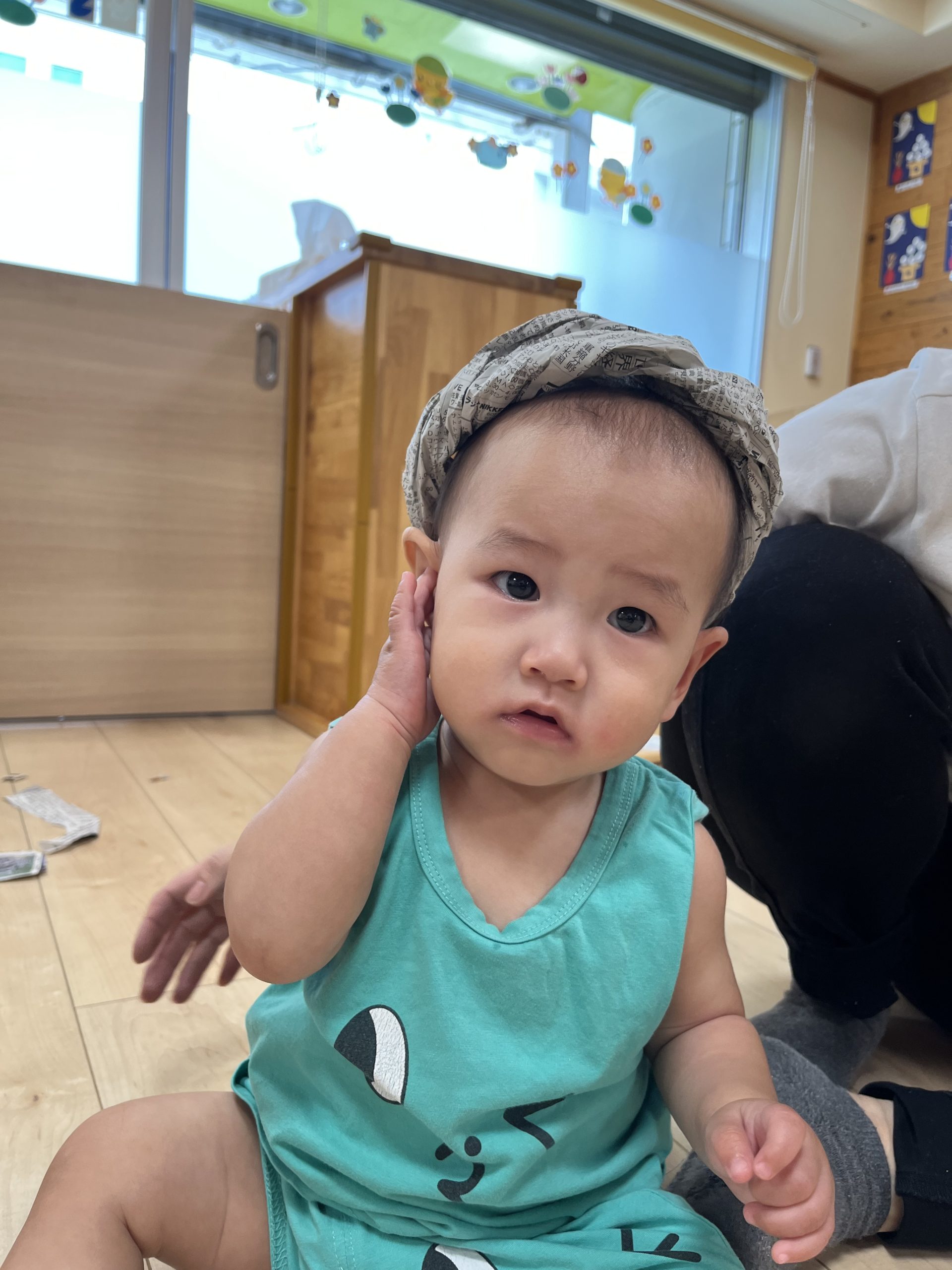 ちぎった新聞を頭に乗せてみたり☺️