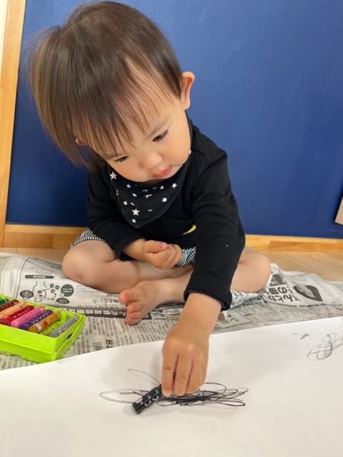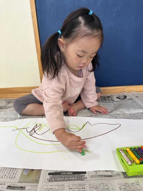 クレヨン、ペン、絵の具、スタンプ、それぞれ使いたいものを自分で選び、好きなように模造紙にお絵描きしましたよ😊✨
