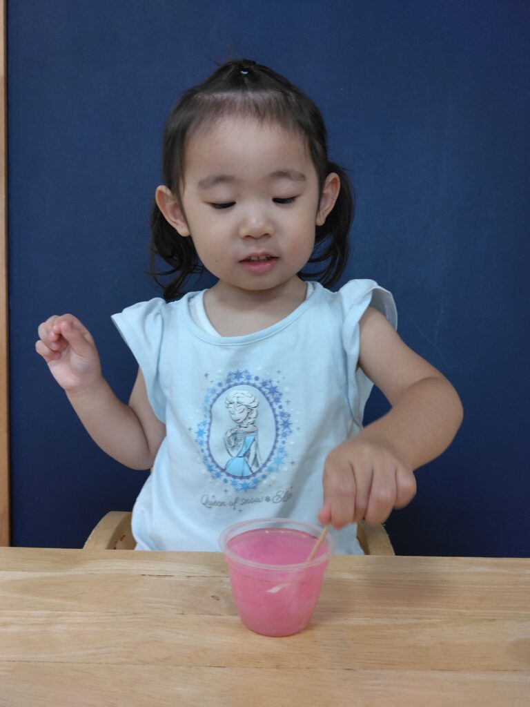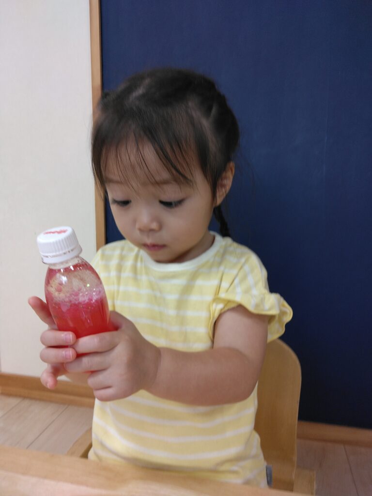 今日は2歳児さんがみんなで遊ぶおもちゃセンサリーボトルを作ってくれました。