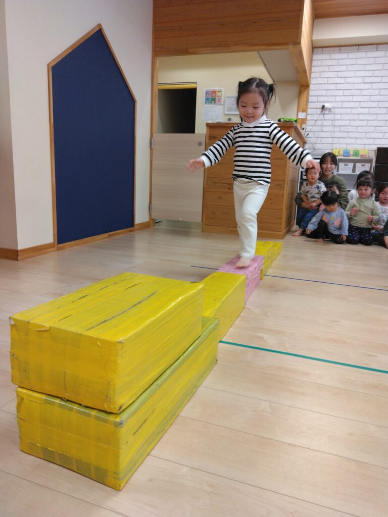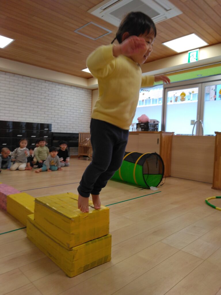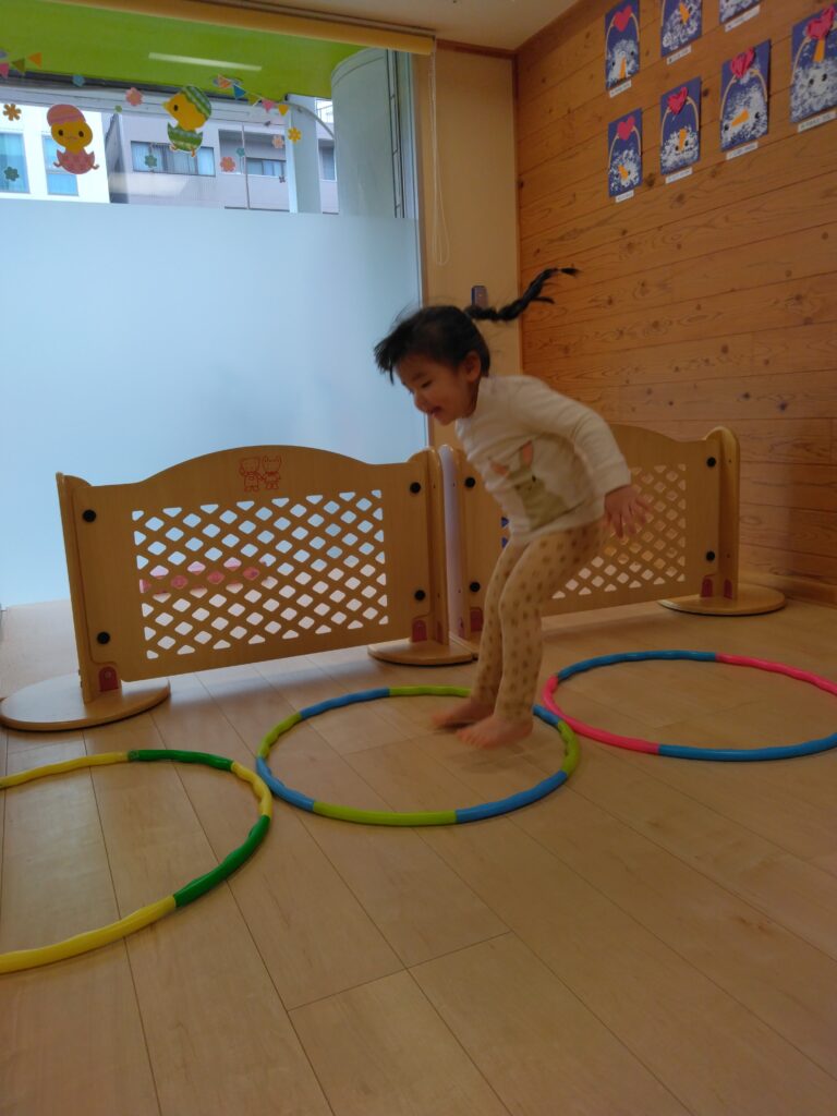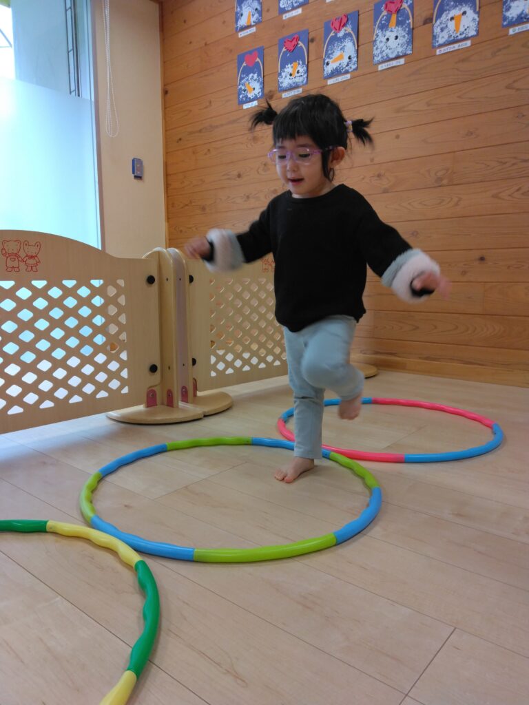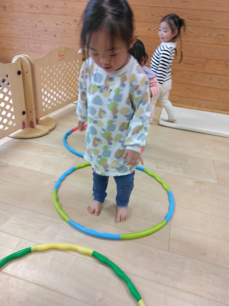 運動遊びでは平均台やフープジャンプに挑戦!