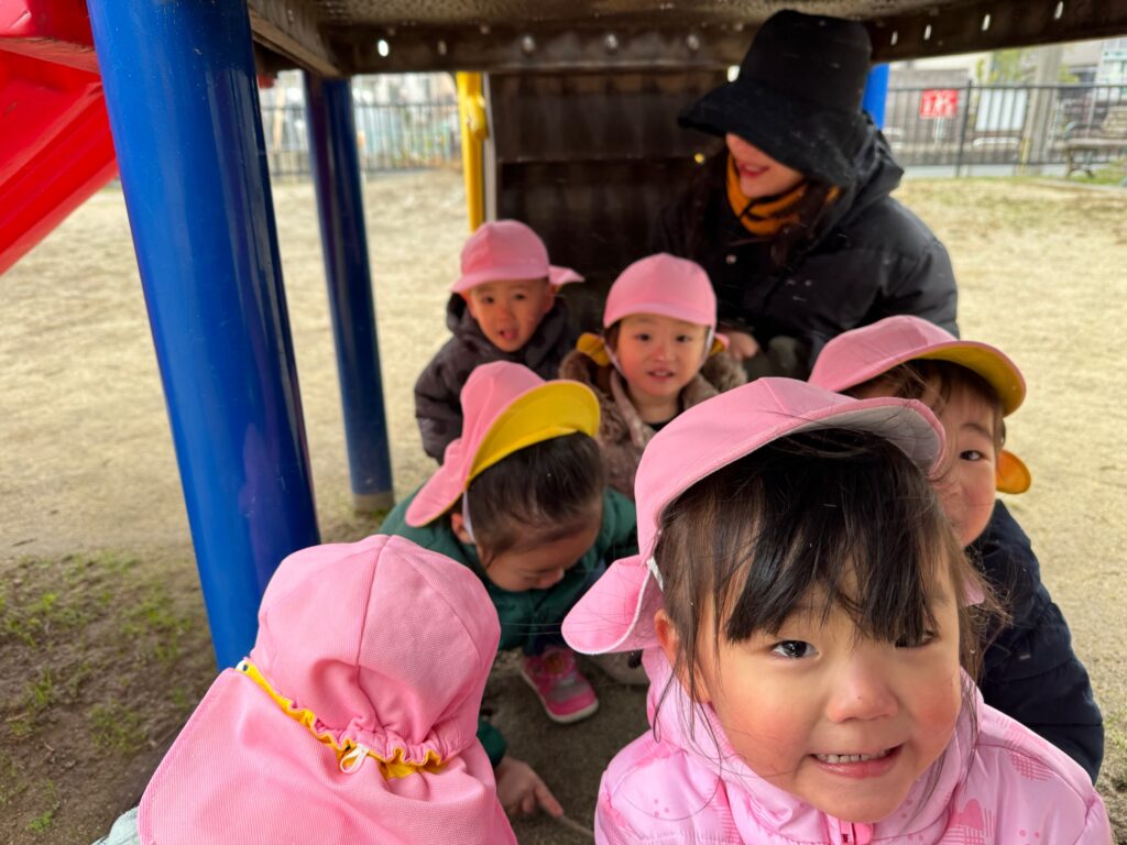 途中で雪が降り始めたので、みんなで遊具の下にかくれんぼ🤭