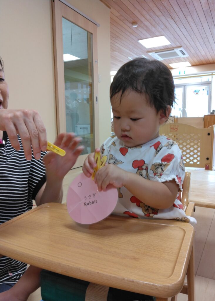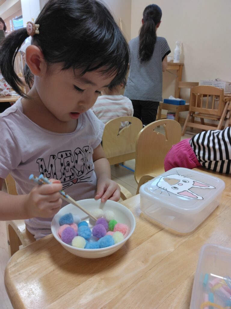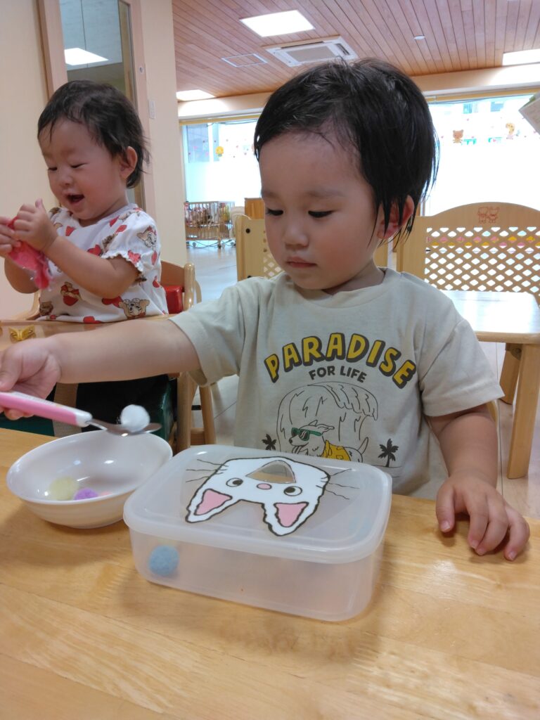 スプーンでスポンジをすくい、ノンタンのお口へ運んであげました😁2歳児さんはお箸にも挑戦していますよ🎵