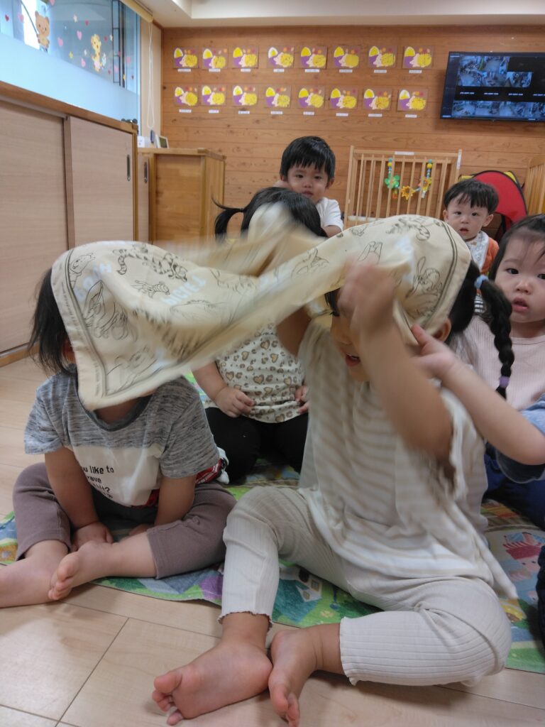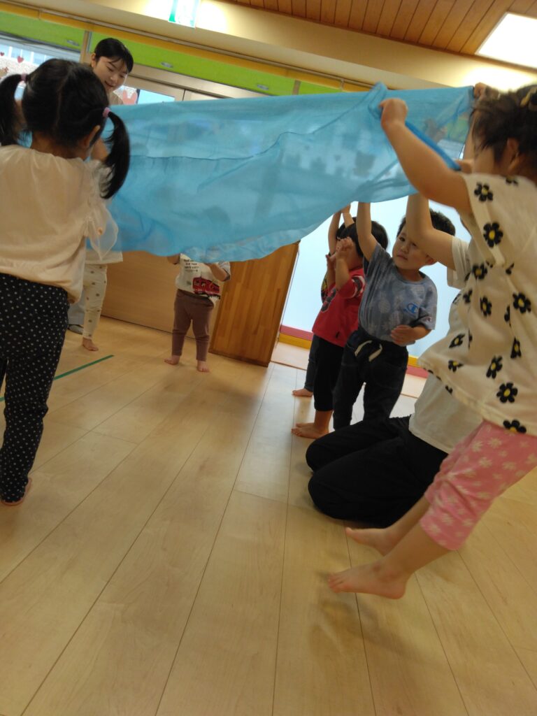ハンカチやオーガンジーを使ってわらべ歌遊びをしました🎵