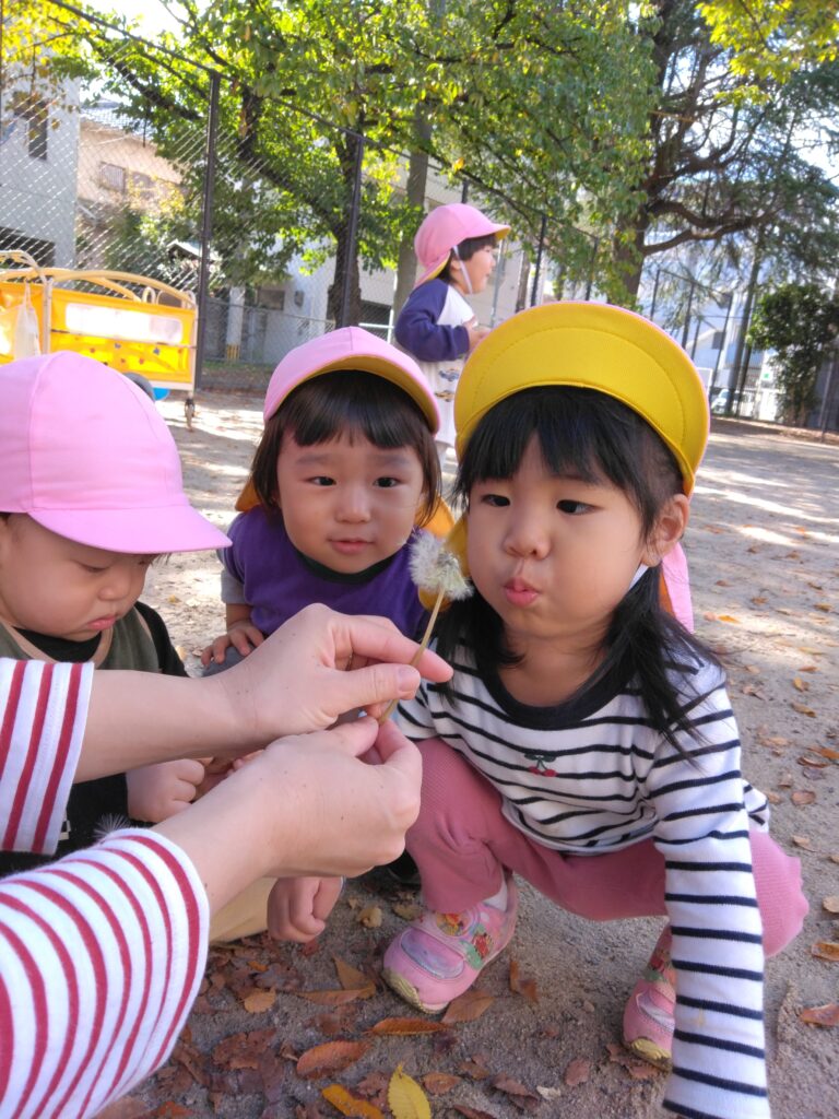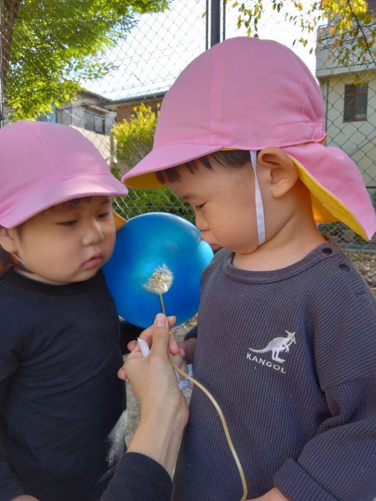 タンポポの綿毛を見つけました。みんなで「ふぅ~」と飛ばしました🌬