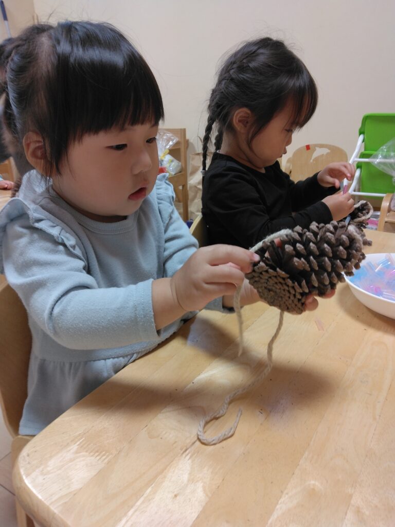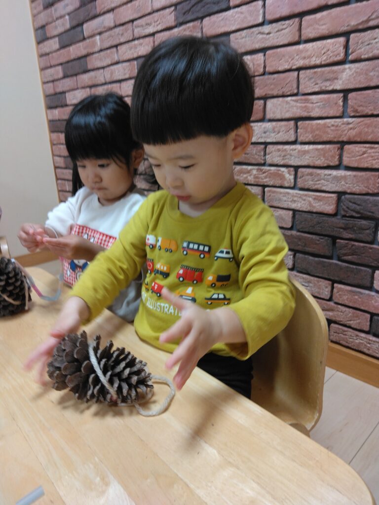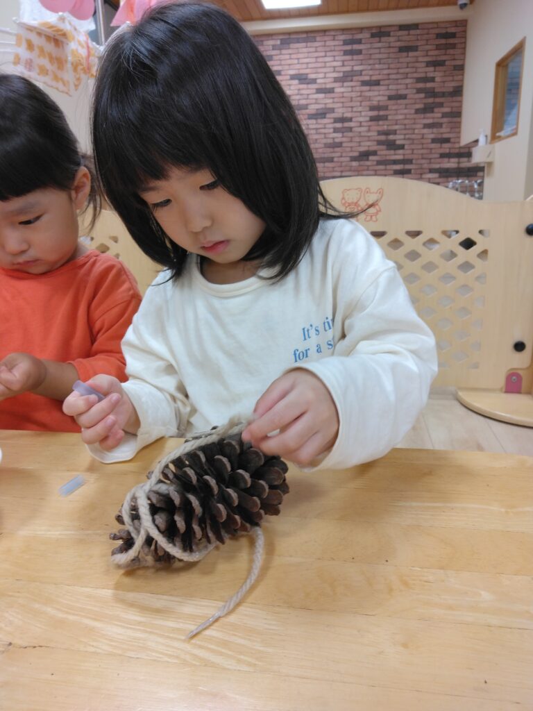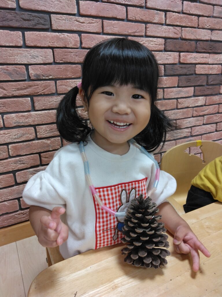 今日はまつぼっくりペンダントを作りました。大きなまつぼっくりを観察する子どもたち!