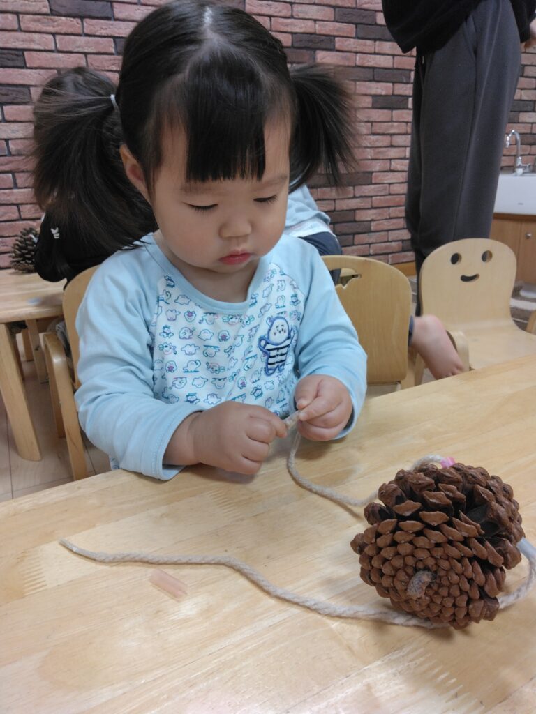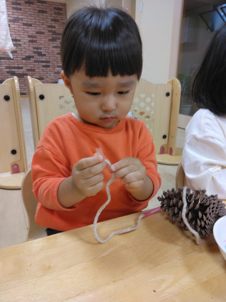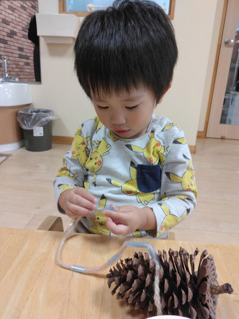 どの子たちも、ひもを通せたら喜び、「もう一回、もう一回」と繰り返し通していましたよ。