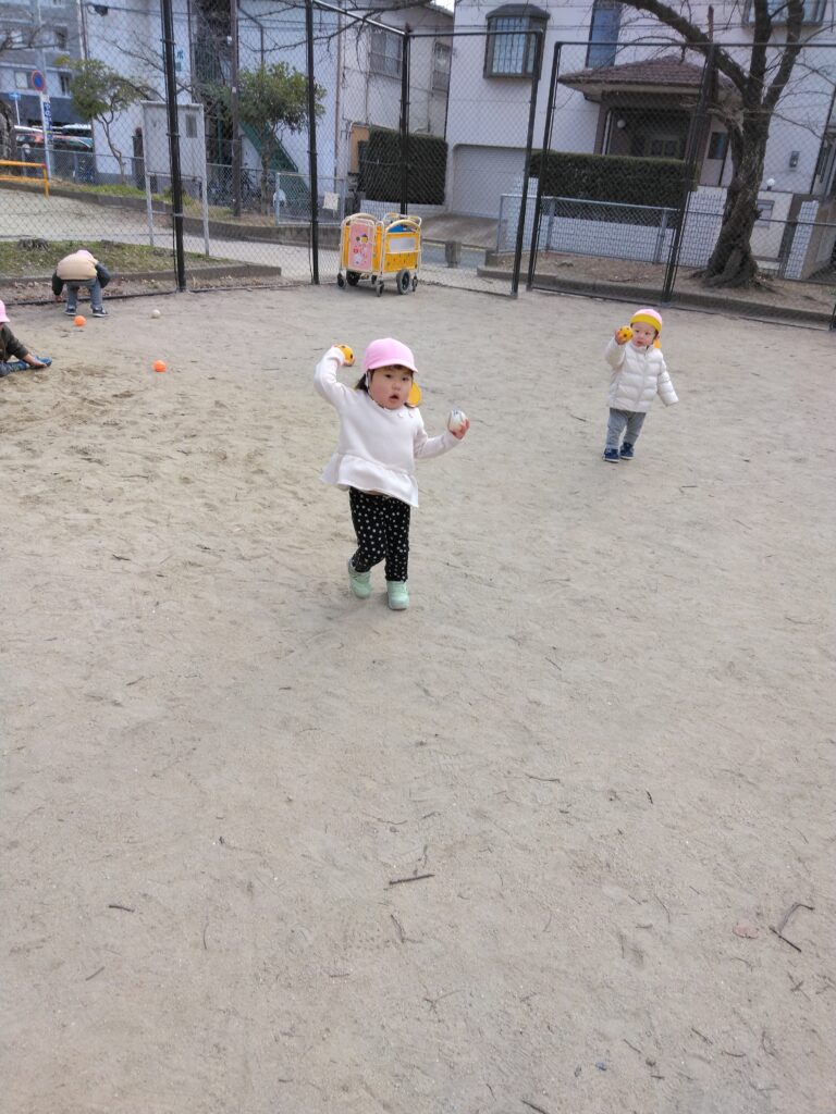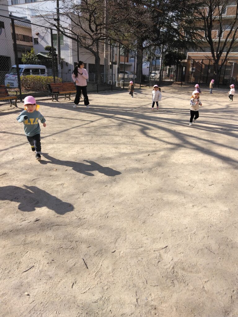 今日は磐瀬公園に行きました。少し寒かったのでマラソンで体を温めます!真剣な表情で臨む子どもたち。2歳児さんは保育士のペースに着いてこれるようになりました😆