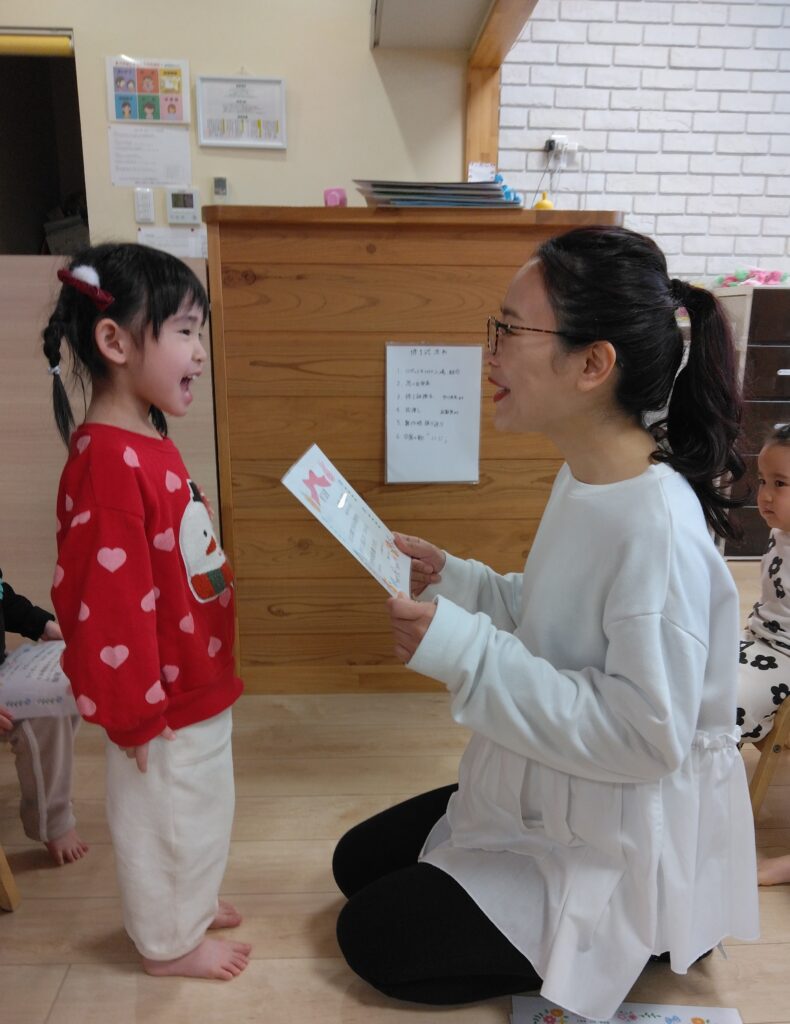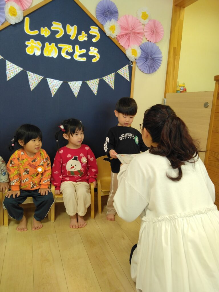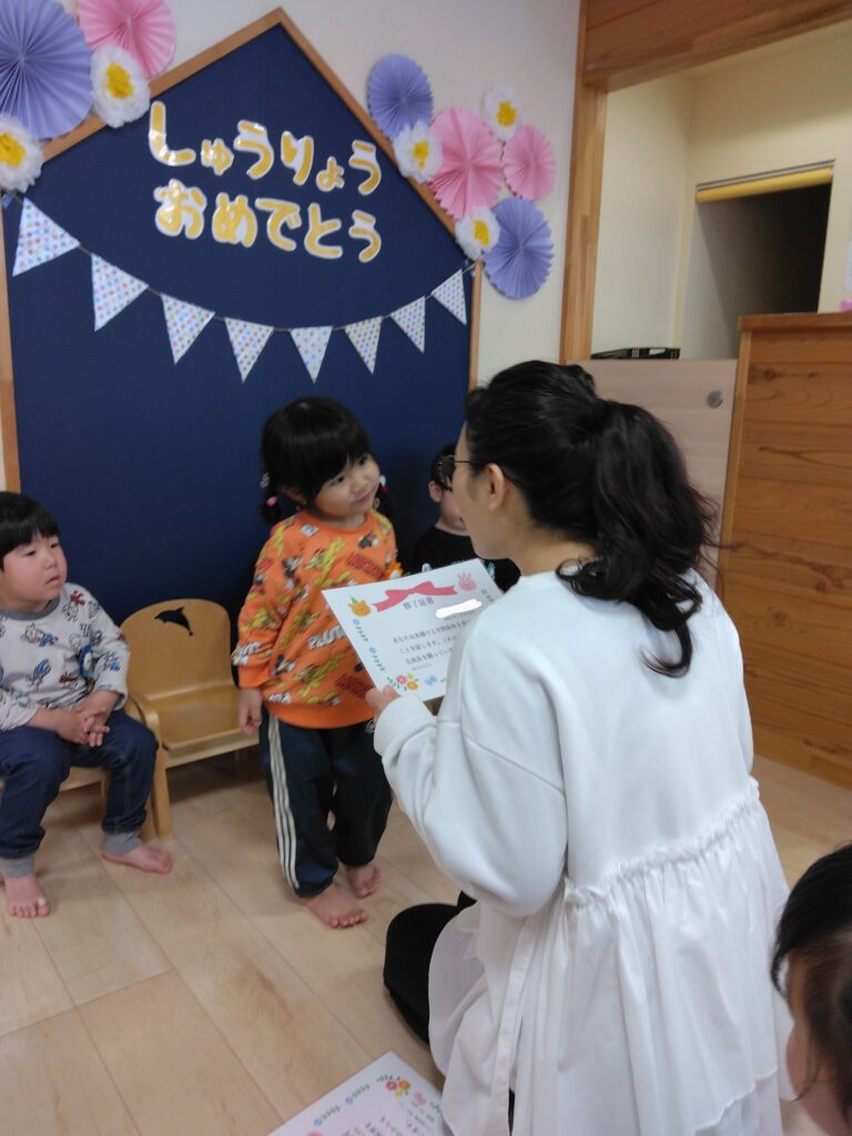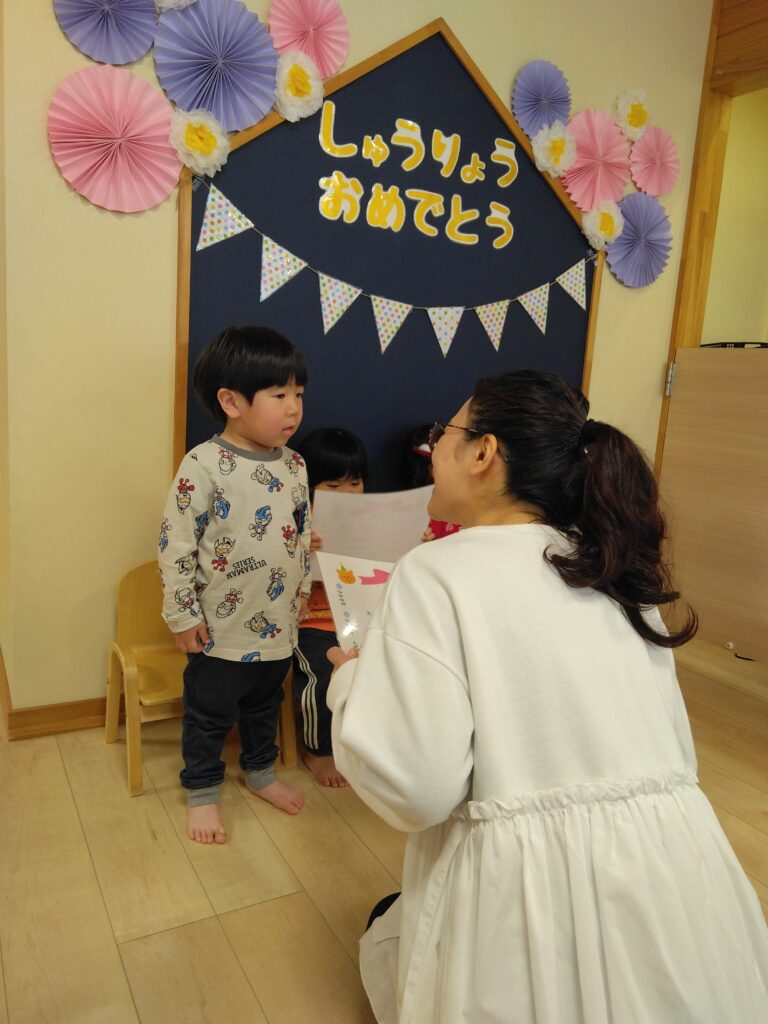 修了証書を園長先生からいただきます。「ありがとうございます!」と恥ずかしそうに言っていた子どもたちです。