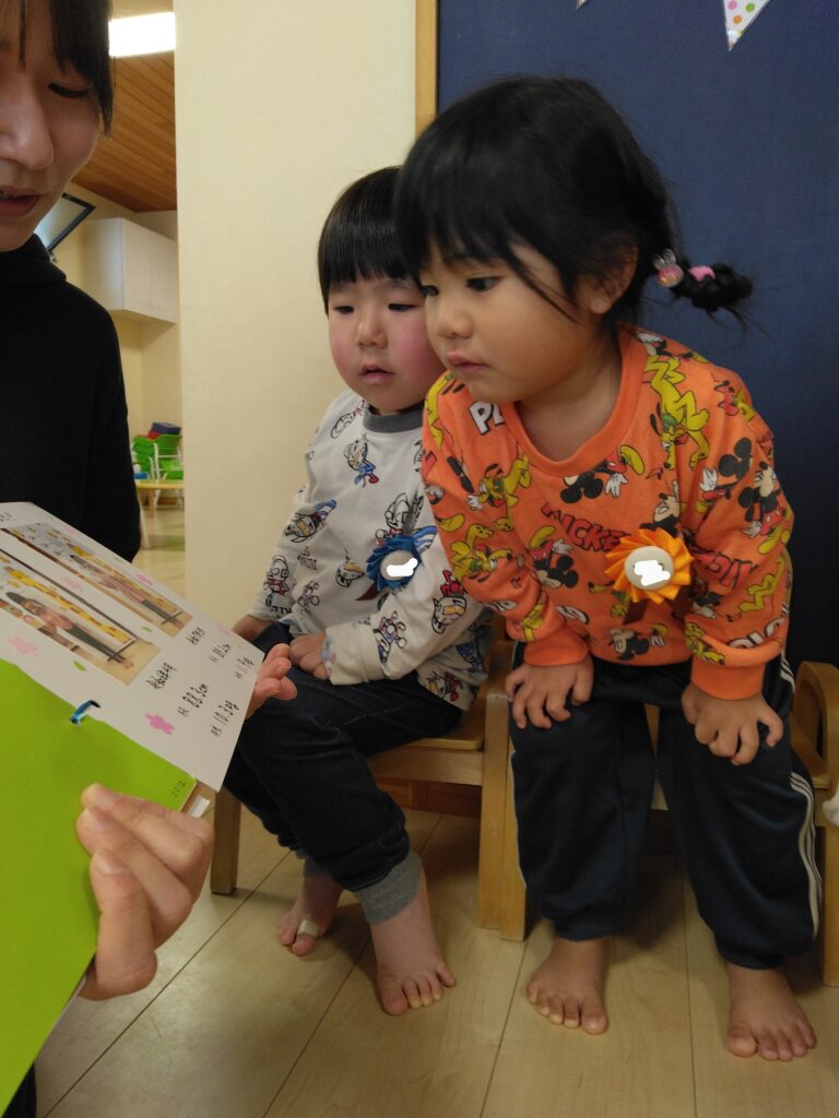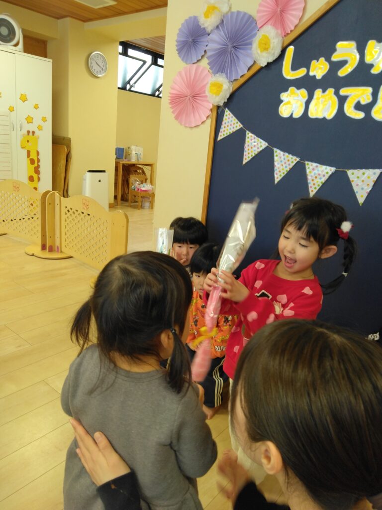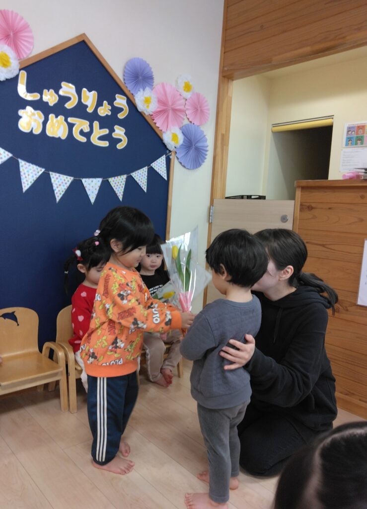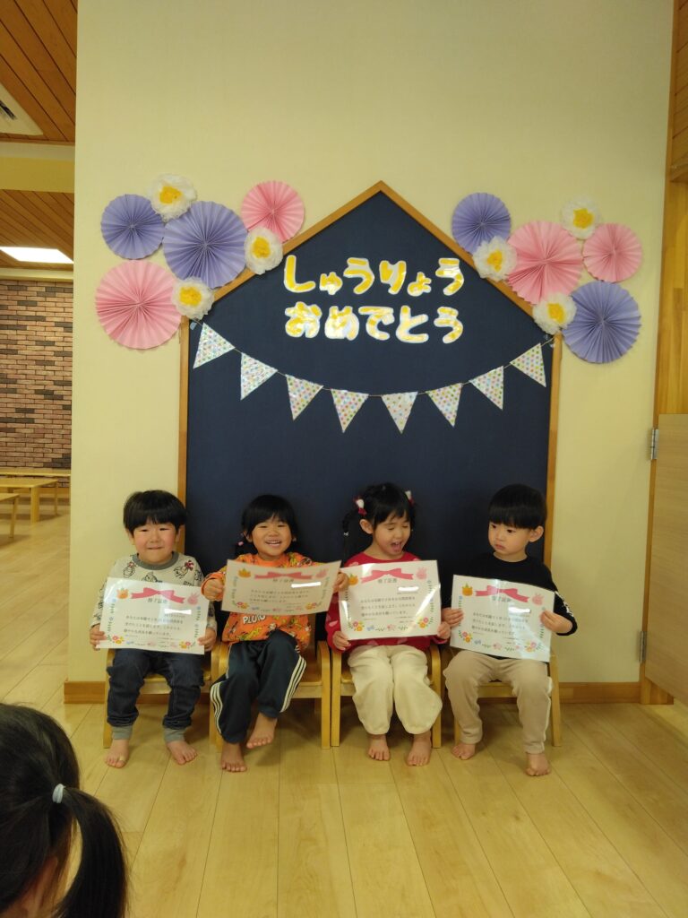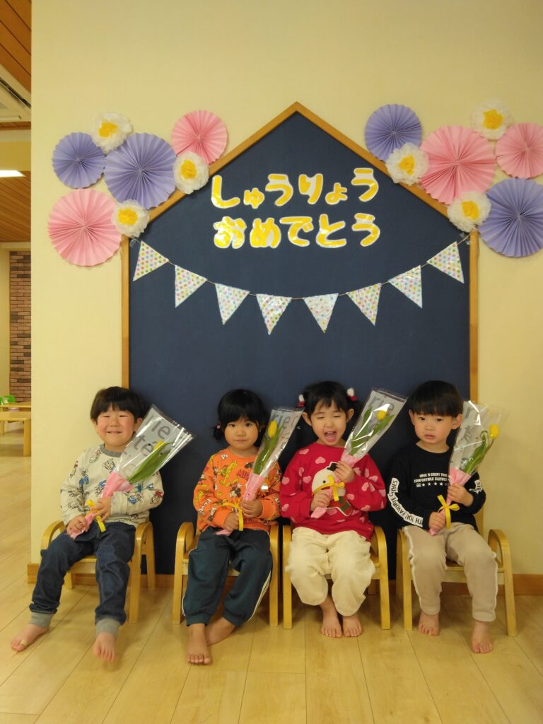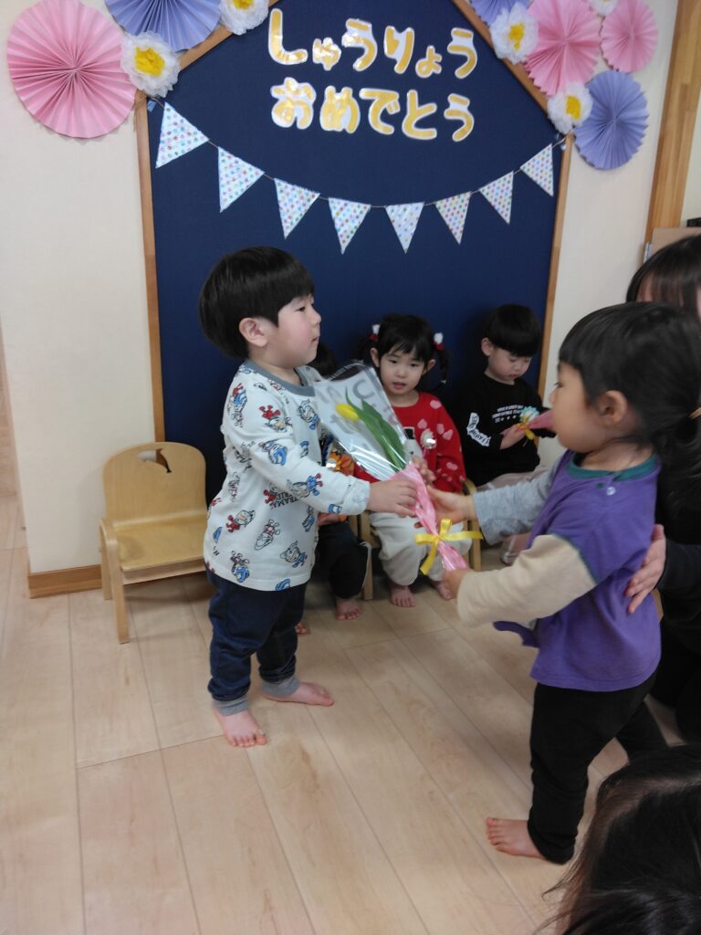 今日は令和6年度修了式がありました。1年間の成長や遊びを振り返ると、「豆まきをしたこと」「車で遊んだこと」などが楽しかったそうですよ✨そして、卒園式も一緒に行いました🌸