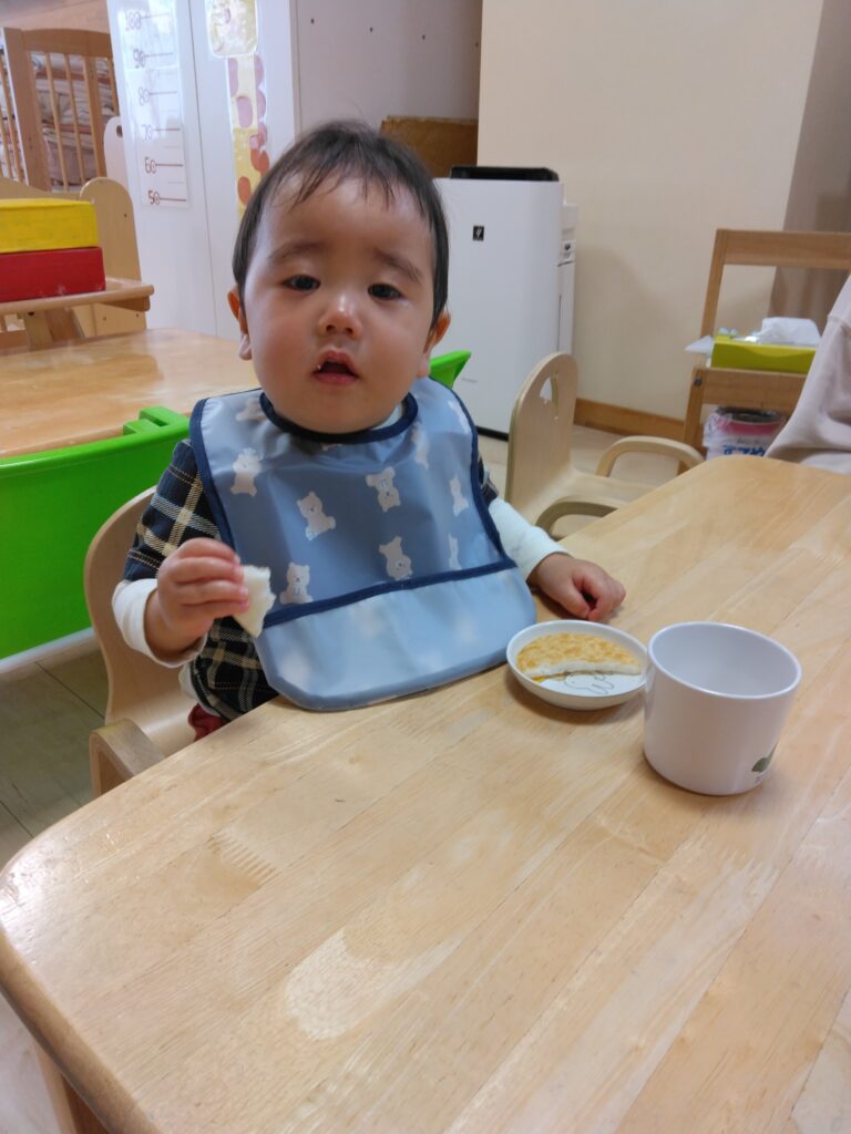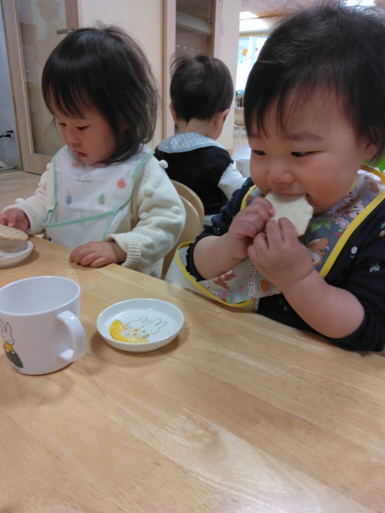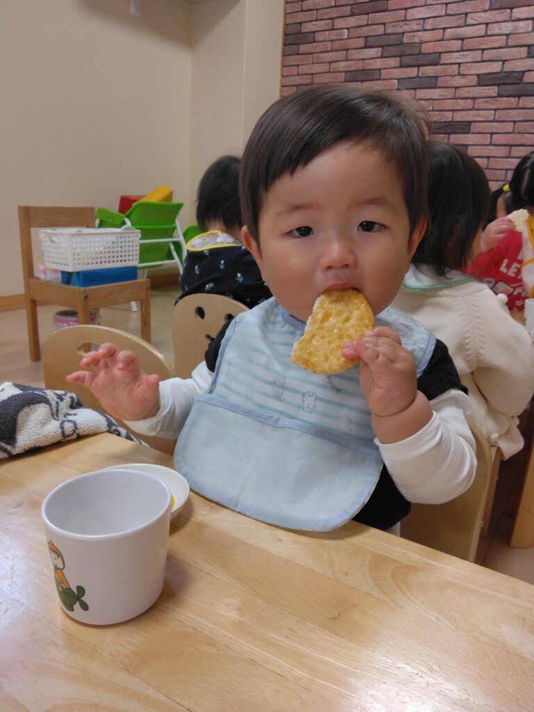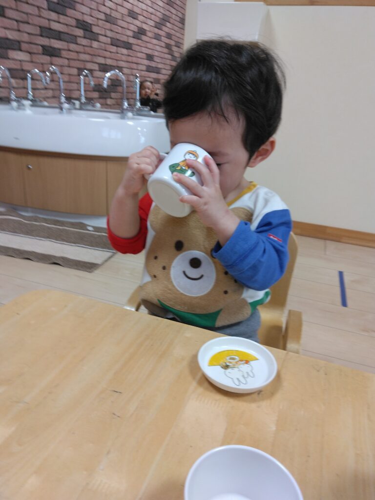 泣いているお友達もおやつを見つけると落ち着き、パクパク😋コップも上手に持っていました。