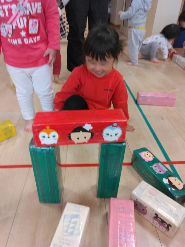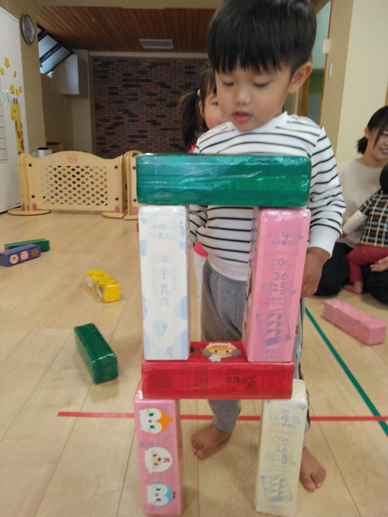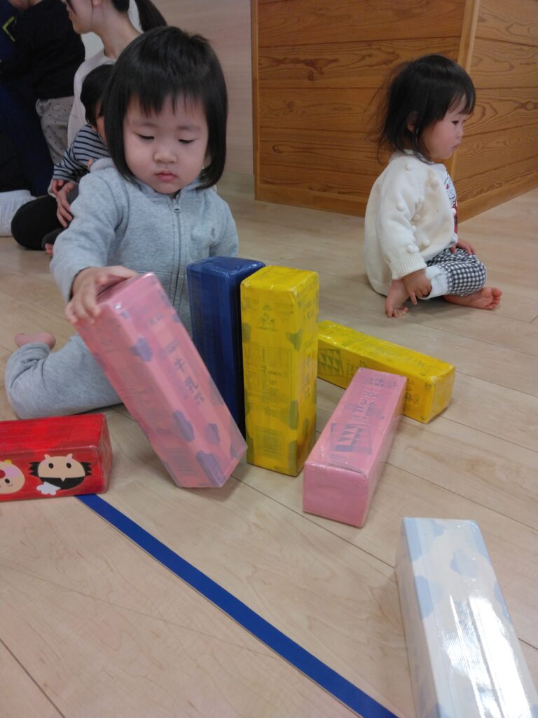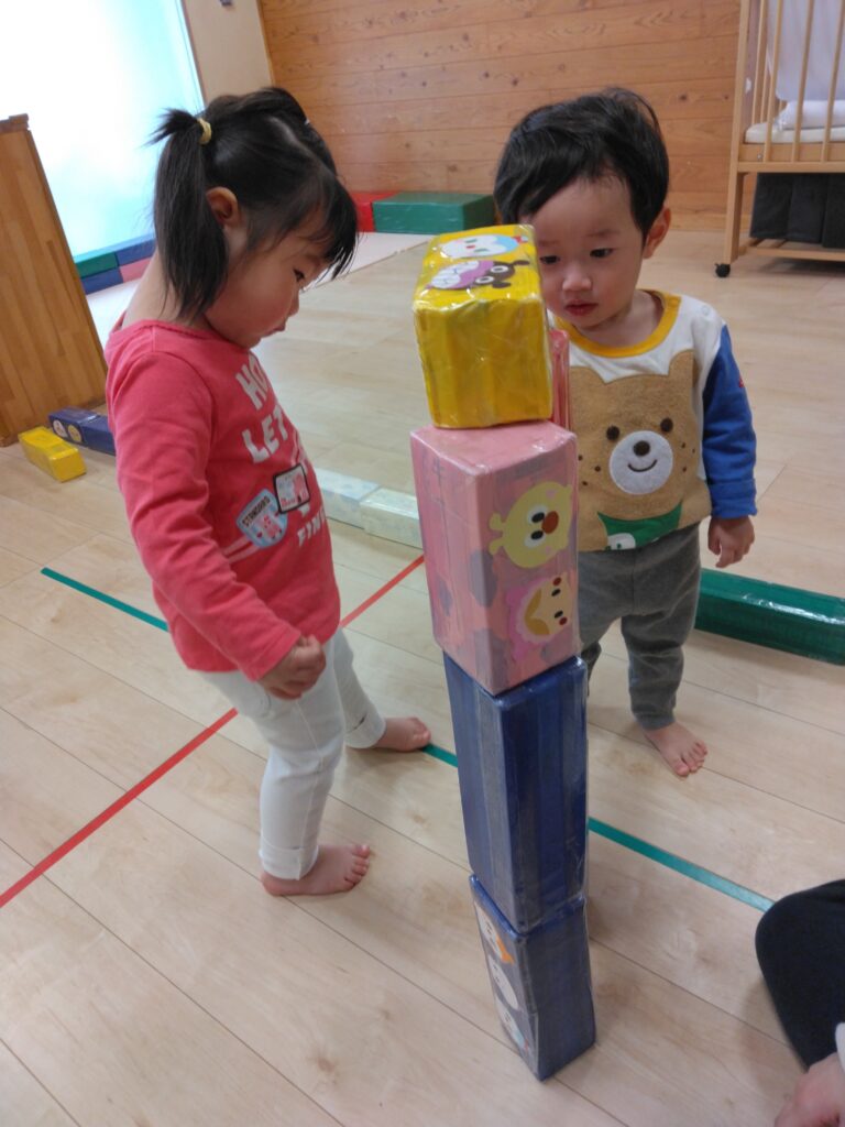 保育士が作るタワーに興味津々。「これは何?」「倒していい??」ワクワクした表情です😄