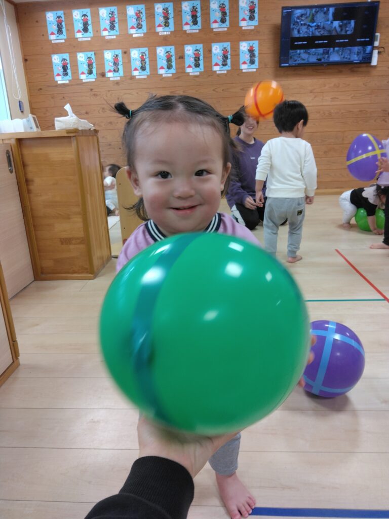 風船を上に高く上げたり、床にバウンドさせて跳ね返ってくるのをとても楽しそうに何度も繰り返し楽しんでいました😊✨