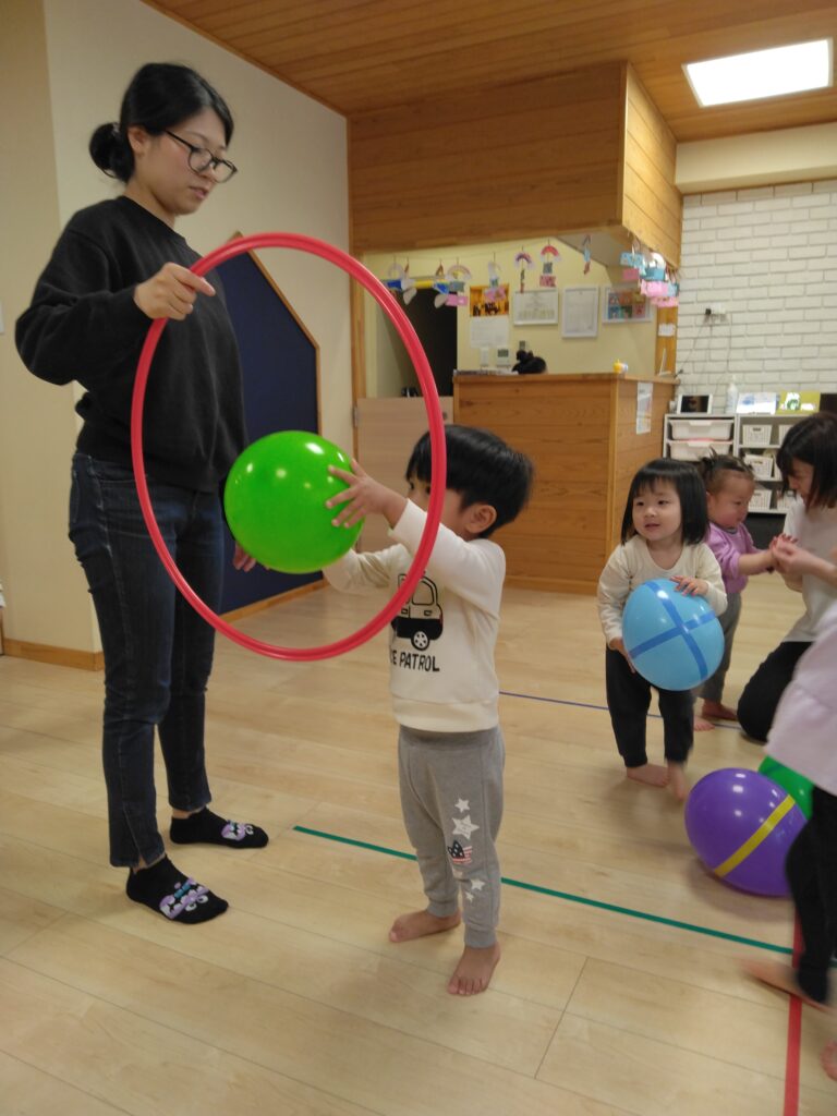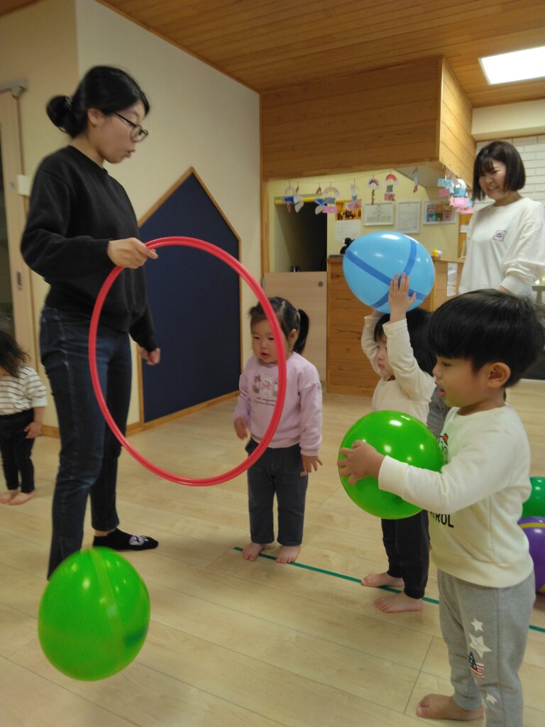 先生がフラフープを持ってくると、輪っかの中に風船をポーンと通して楽しみました🎵