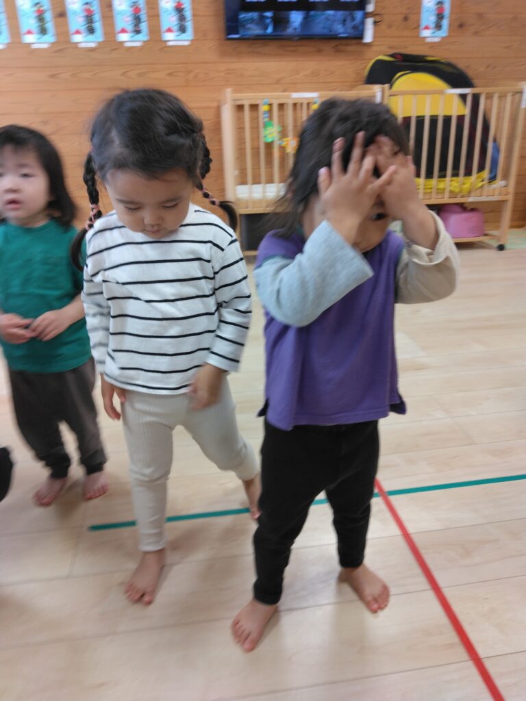 まずは、日本でもお馴染みの「あたま かた ひざ ぽん🎵」顔のパーツを指差しています。りか先生の真似をして楽しむ姿もありますよ。