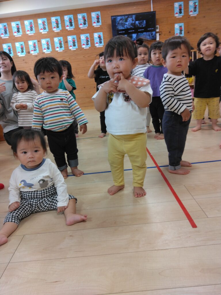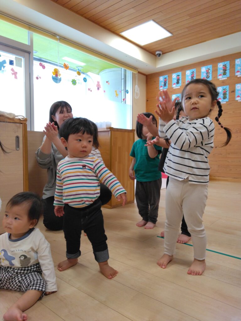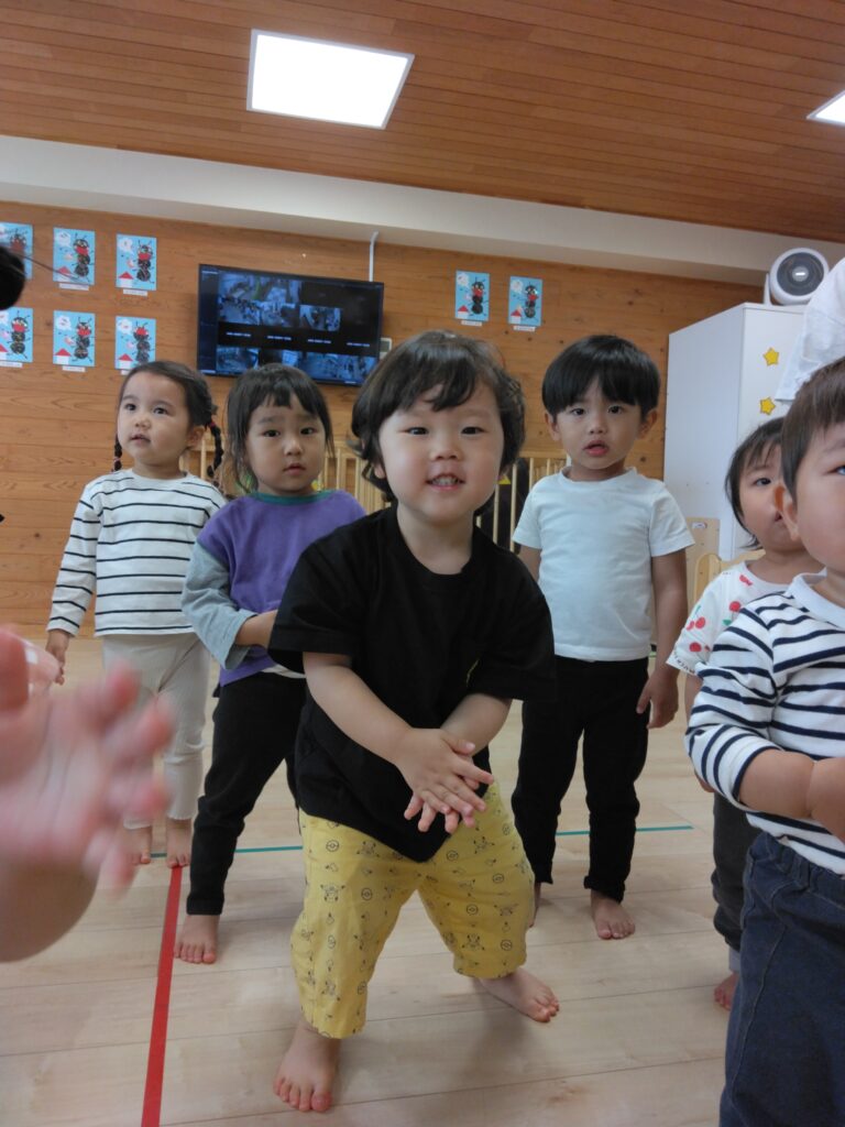 歌遊びが大好きで曲が流れると笑顔で立ちあがる子どもたち。