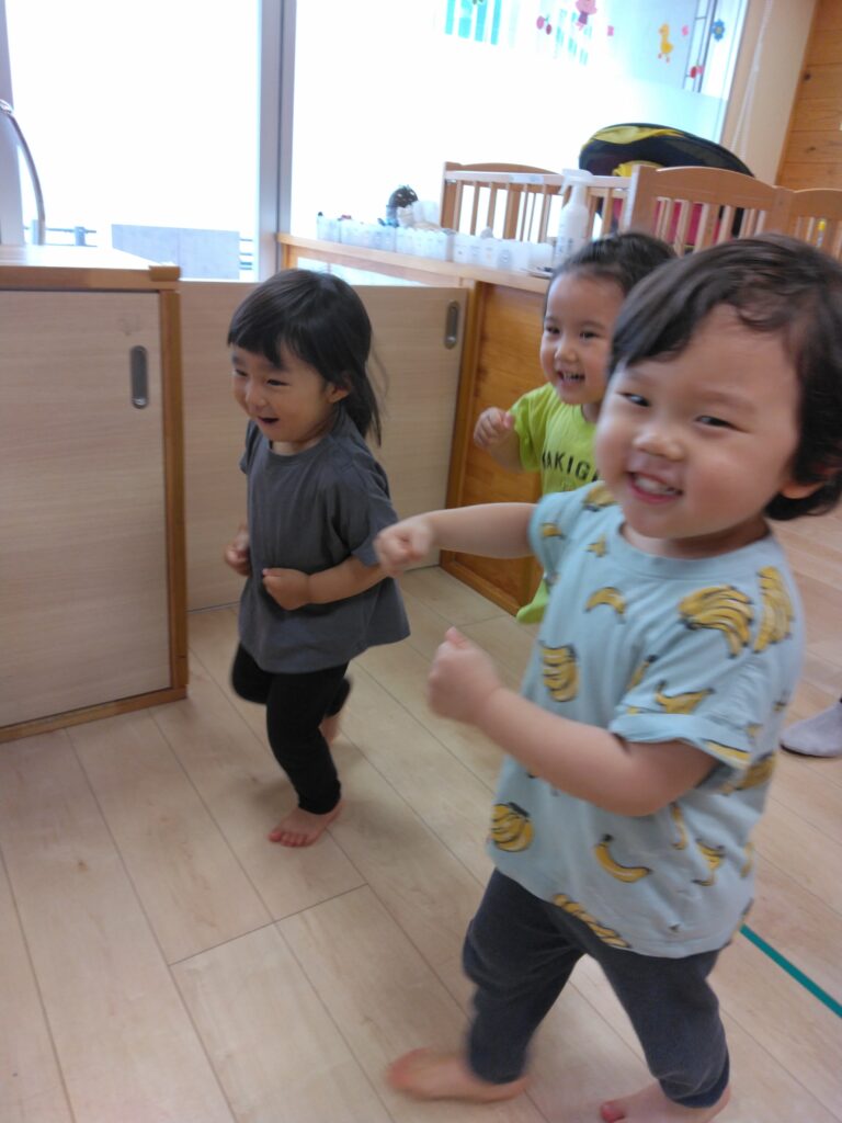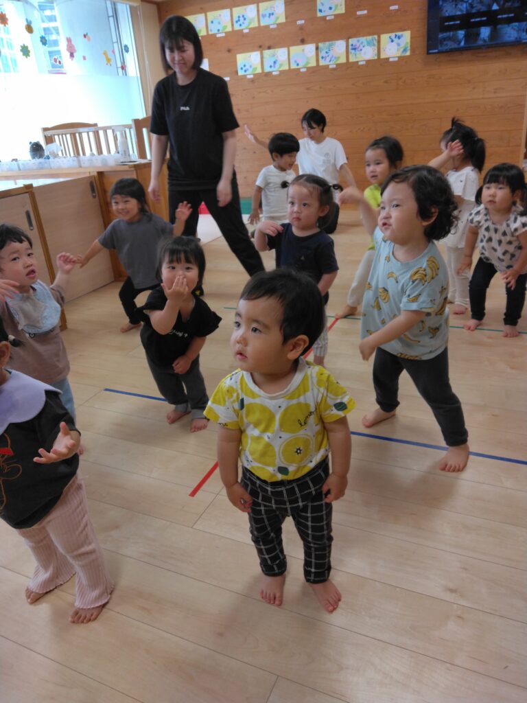 今日は保育室で模倣遊びをしました。遊ぶ前に準備体操。曲はみんなの大好きな「カラダ⭐ダンダン」です🎵
