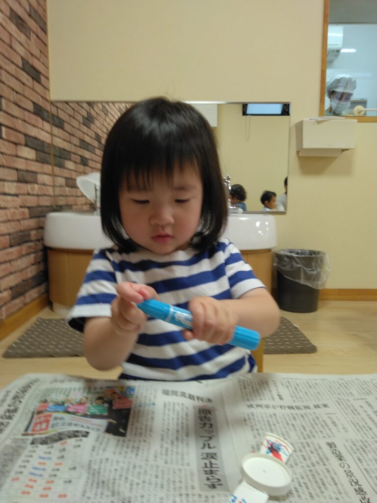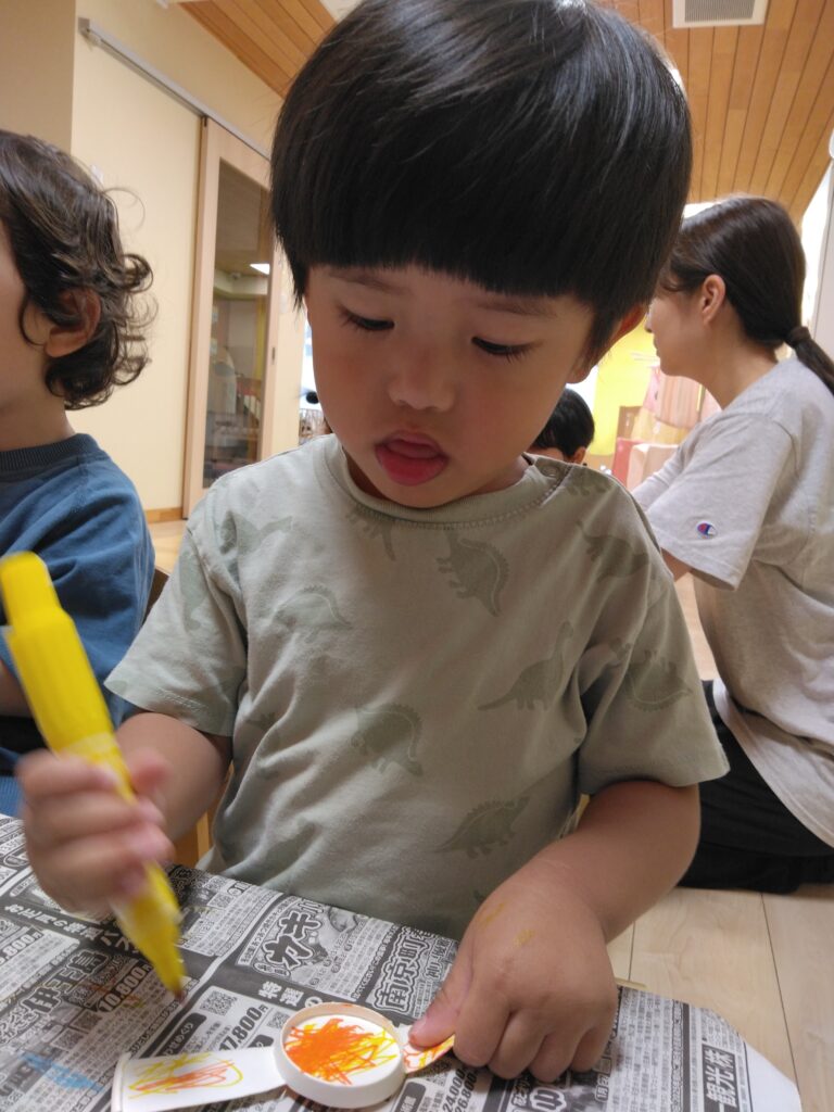 2歳児さんは、ベルト部分に好きな色のペンで絵を描きました!「アンパンマンかくー」と好きなキャラクターを描いたりとオリジナルの時計が完成し、とっても嬉しそうにしていました✨