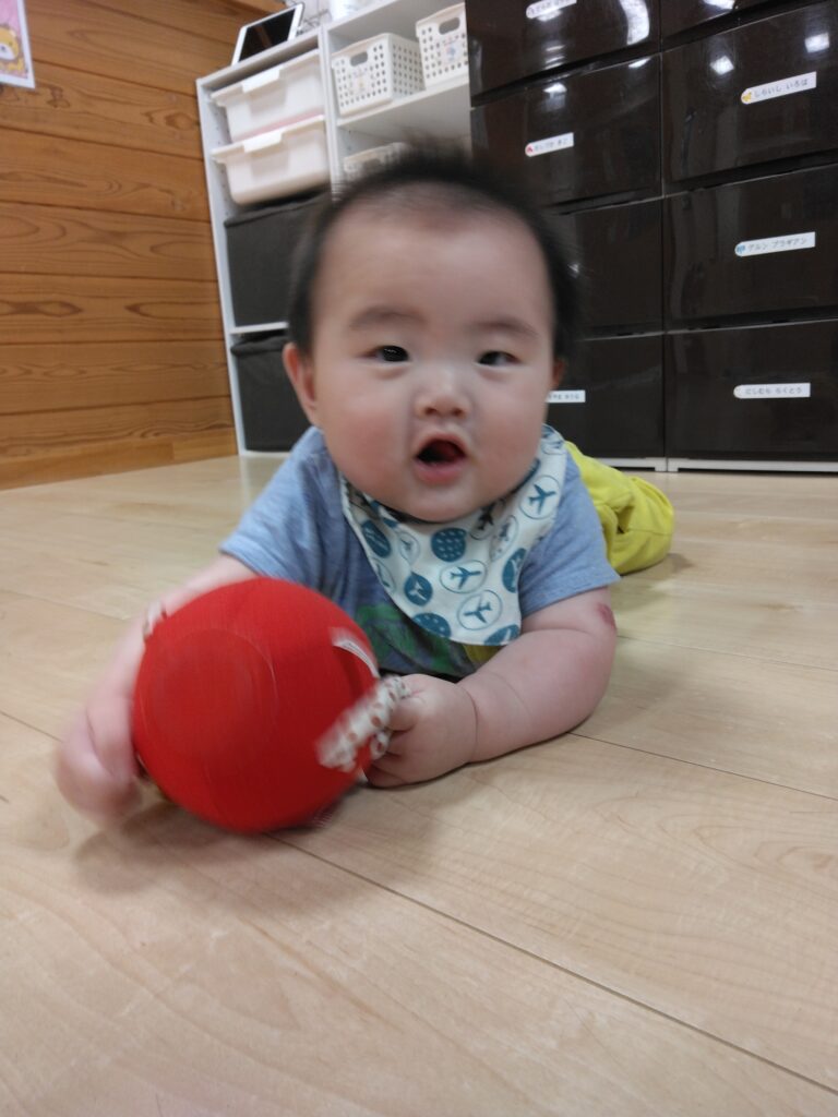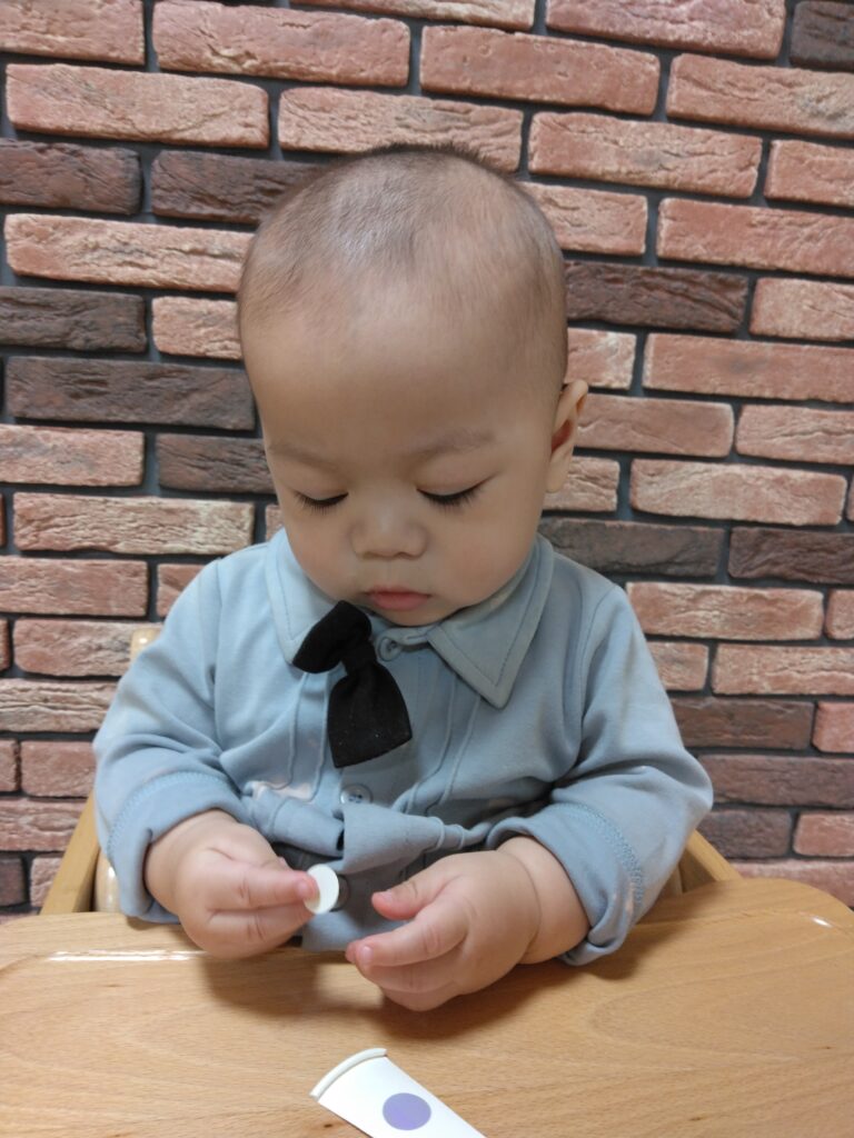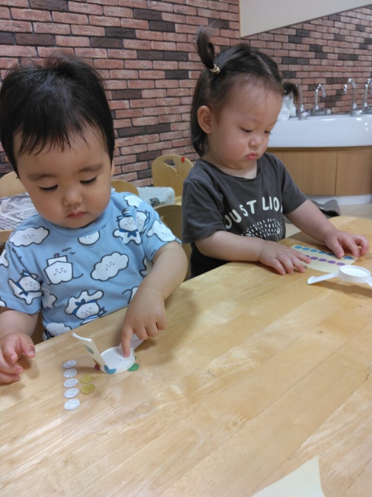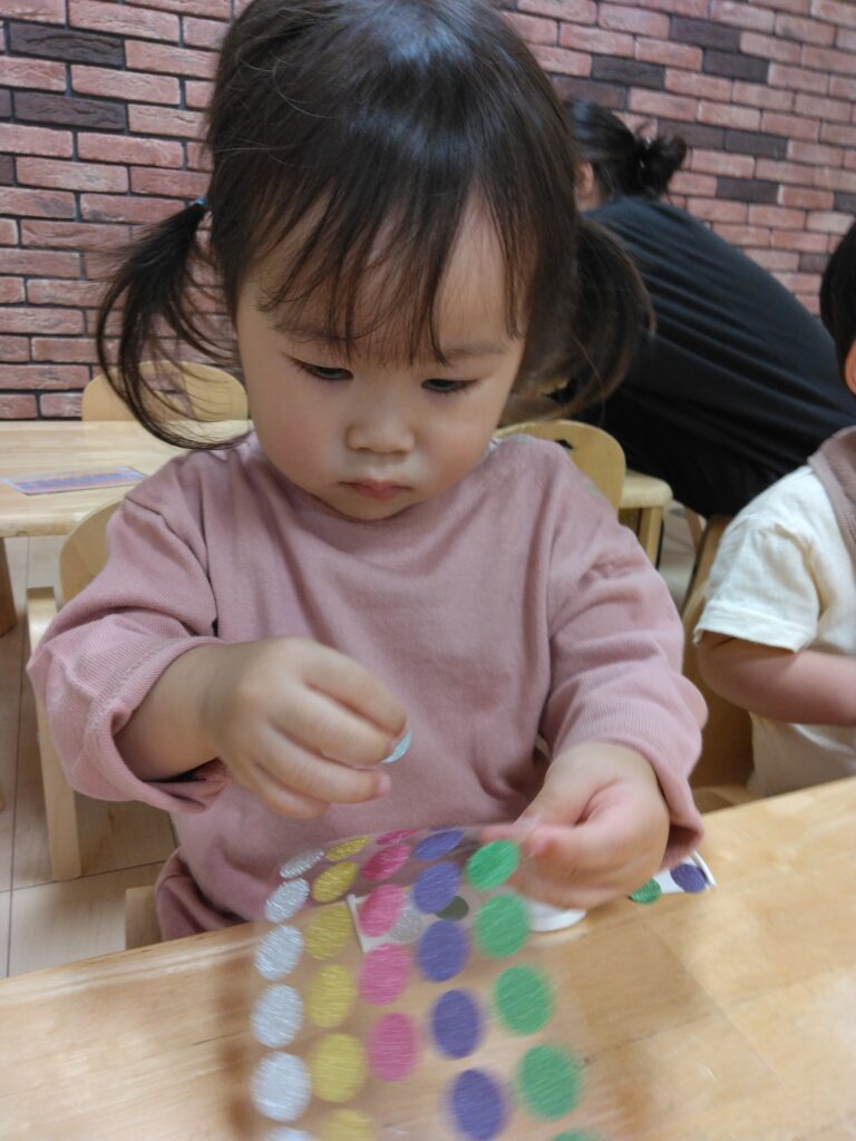 0歳児さんは保育者に手伝ってもらいながら、シールを一生懸命貼ろうとしてました!