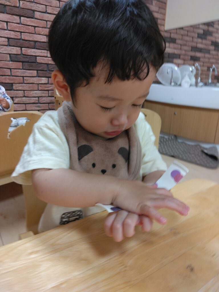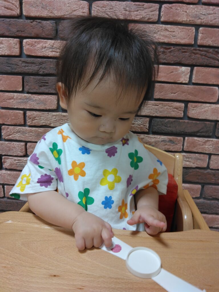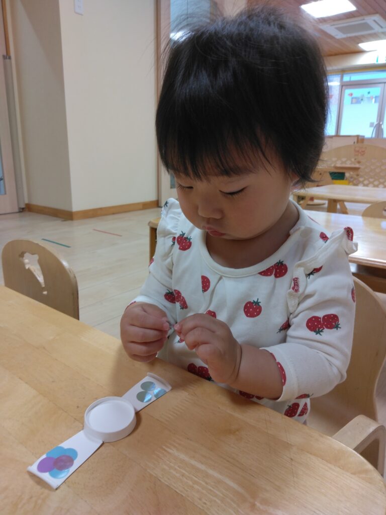 1歳児さんは、自分でシールを取って手にくっつくのを一生懸命とりながら貼っていました✨保育者が腕に付けることをお話していたので、自分の腕に付けて試している姿もありとっても可愛かったです😊💕