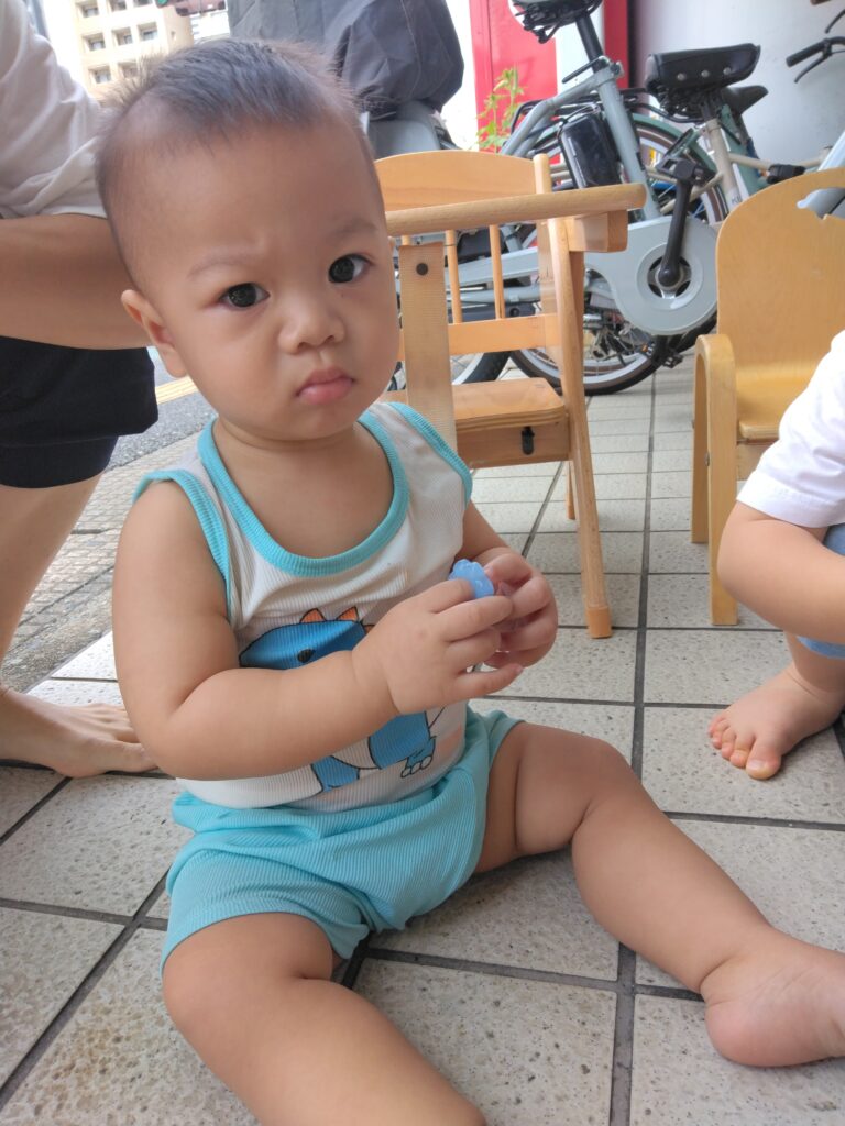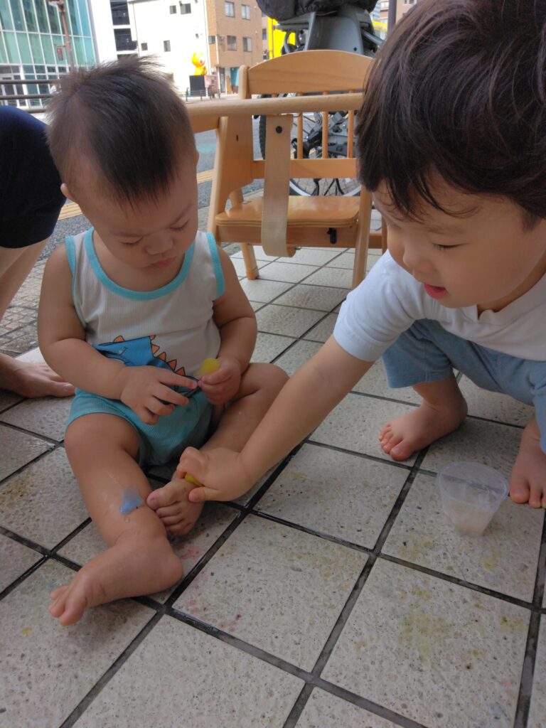 カップを振るとカチャカチャと音が聞こえます。「先生見て」と音が出る事に気づいたお友達もいました🎵お友達の足に乗せてたくさん話しかけながら楽しむ姿もありましたよ🥰