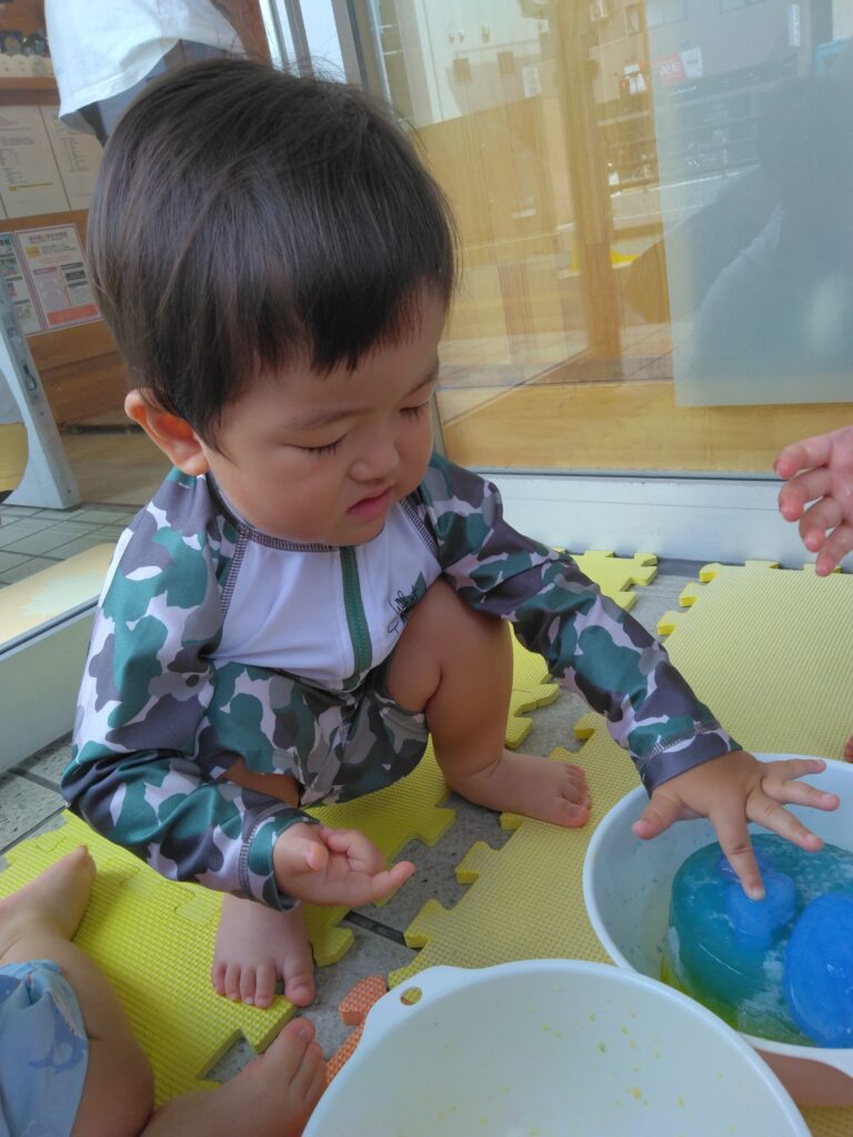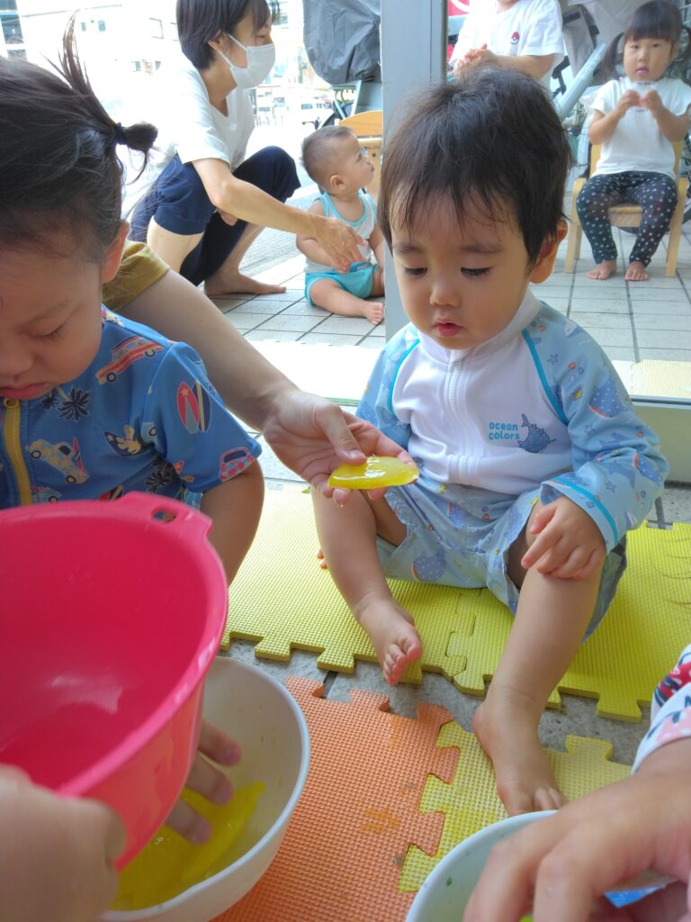 輪っかの氷を指にはめて指輪にしたり、ボウルの溶け出した氷に手を付けてみたりと色がついた氷にみんな興味津々でした👀✨