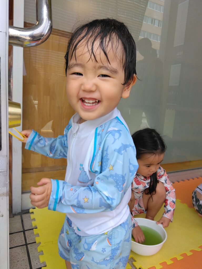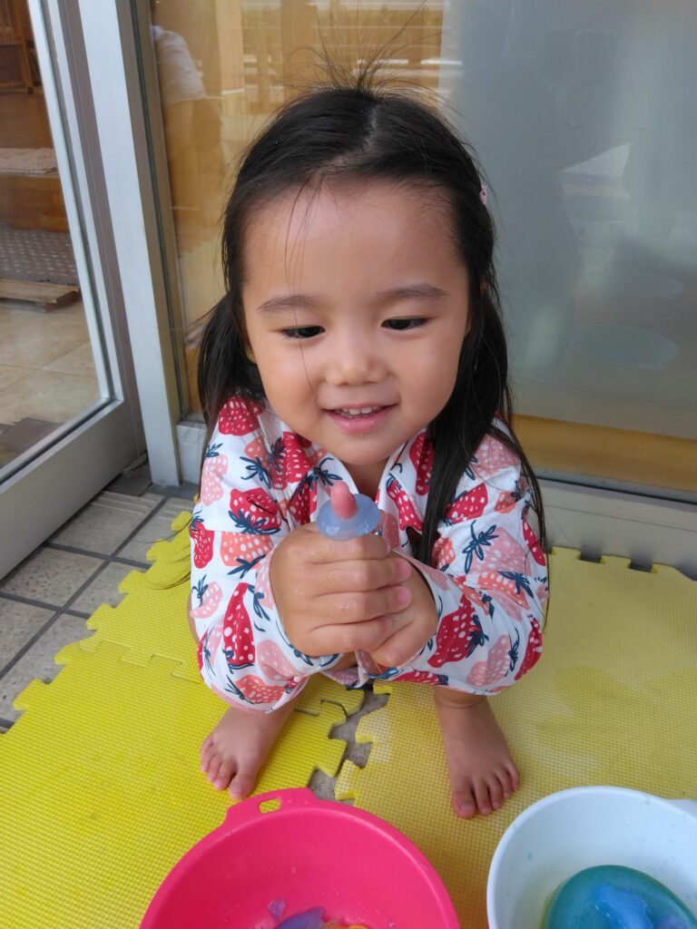 溶けた氷水を使って、次はクッキングです🌟青と黄色の氷水をまぜまぜ。「グリーンになった!」と色の変化にも気づきました🤩プールの水も足すなどして、思い思いにクッキングを楽しんでいます。
