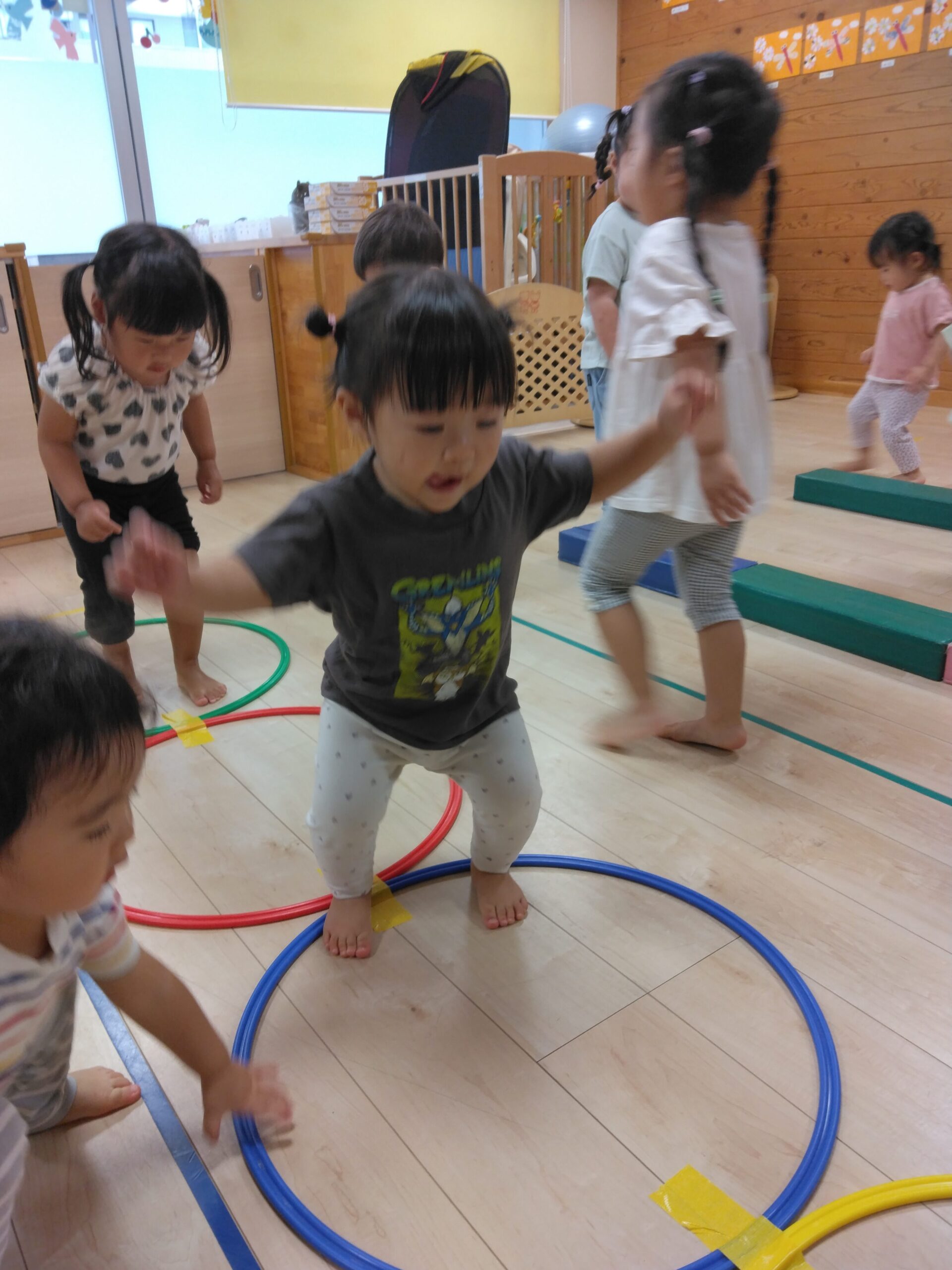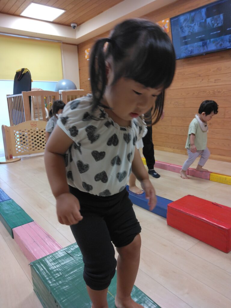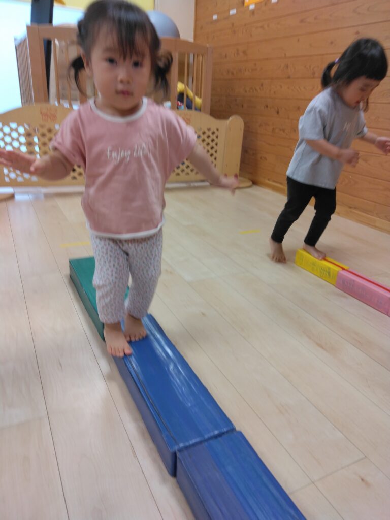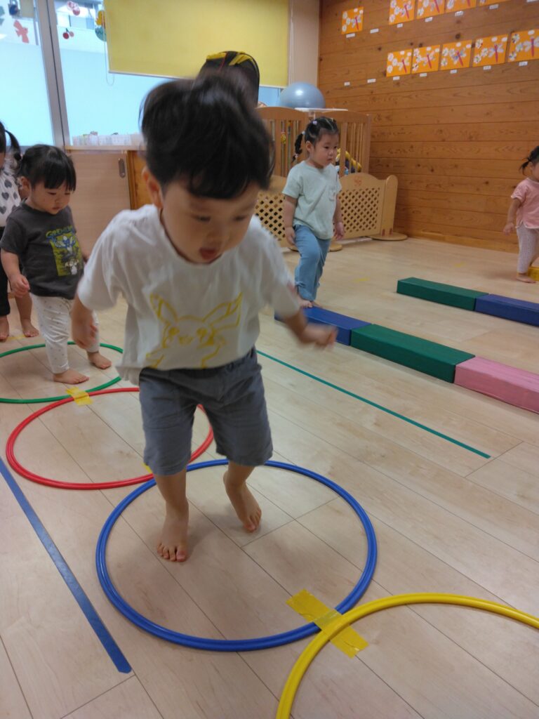 今日は平均台やフープジャンプなどの運動遊びをしました。