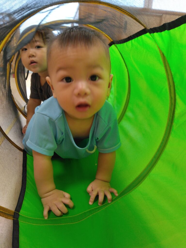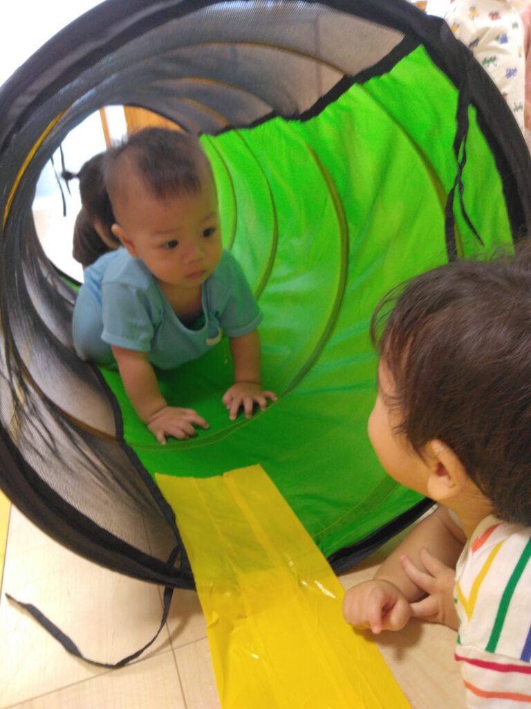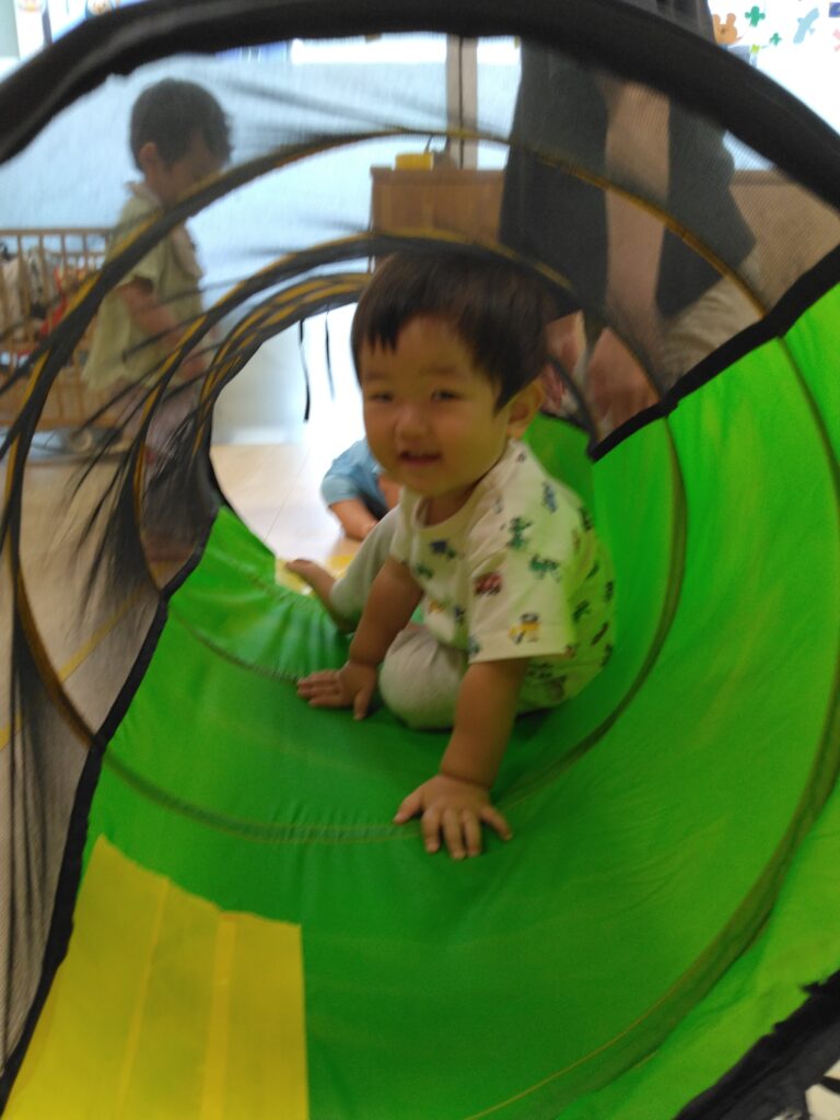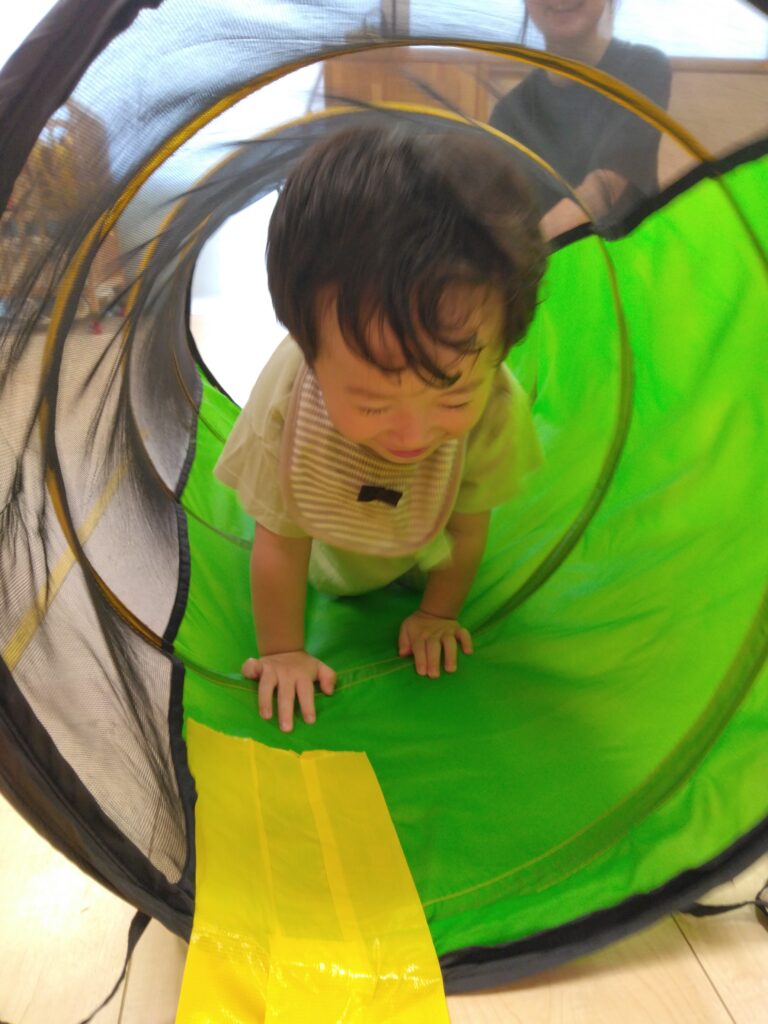 トンネルはハイハイで進みます。「こっちだよー」「お顔見せて」と言われると、ニコッと笑って嬉しそうでした🤩