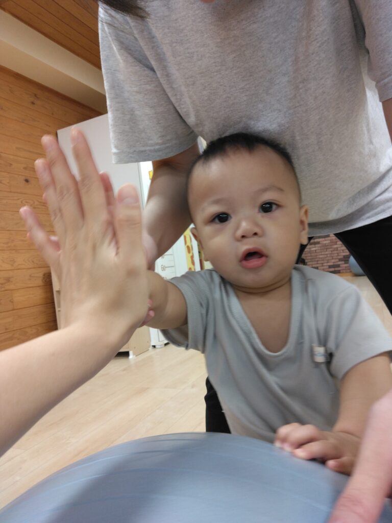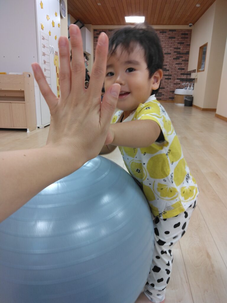 大玉転がしもしています。折り返し地点の保育者に嬉しそうにタッチしています🤭💓
