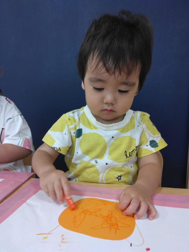 これから旬になる果物の“柿”と“林檎”の模様をクレヨンで描きました🖍🎵