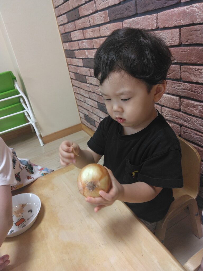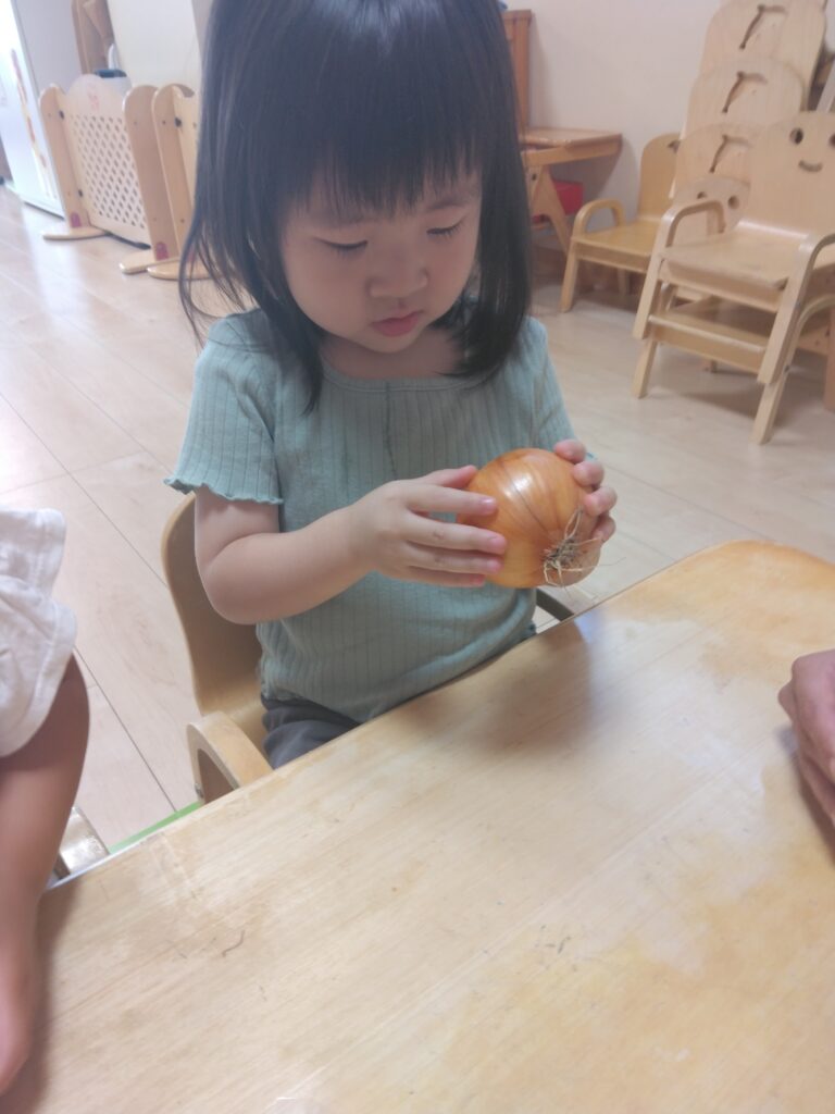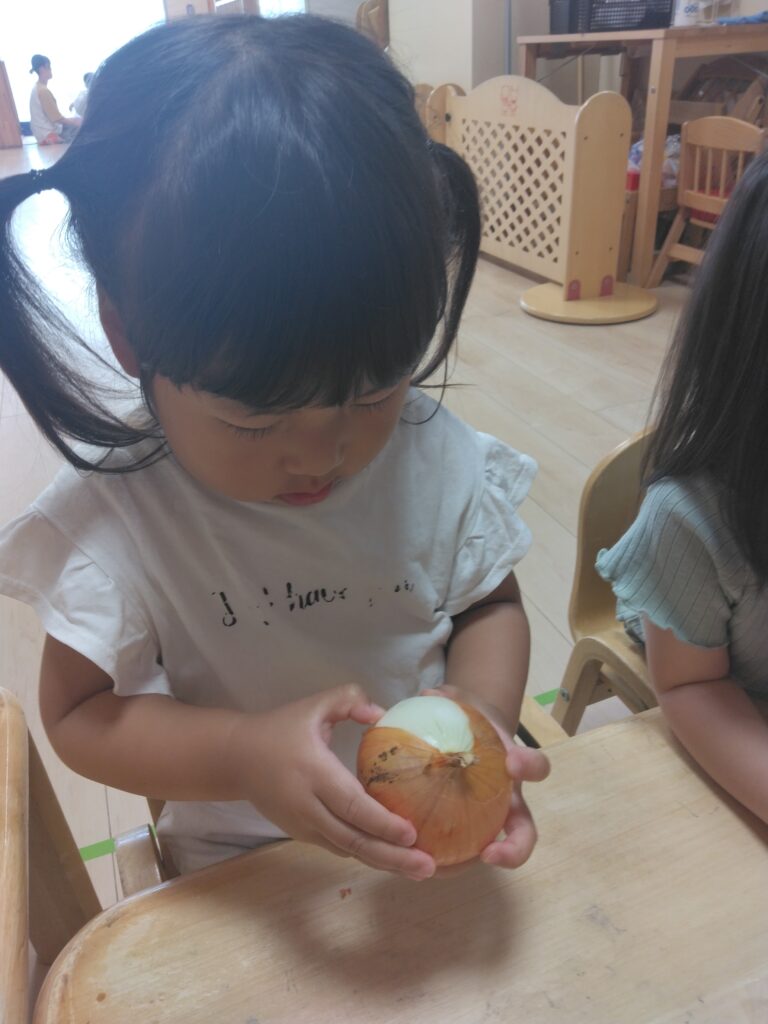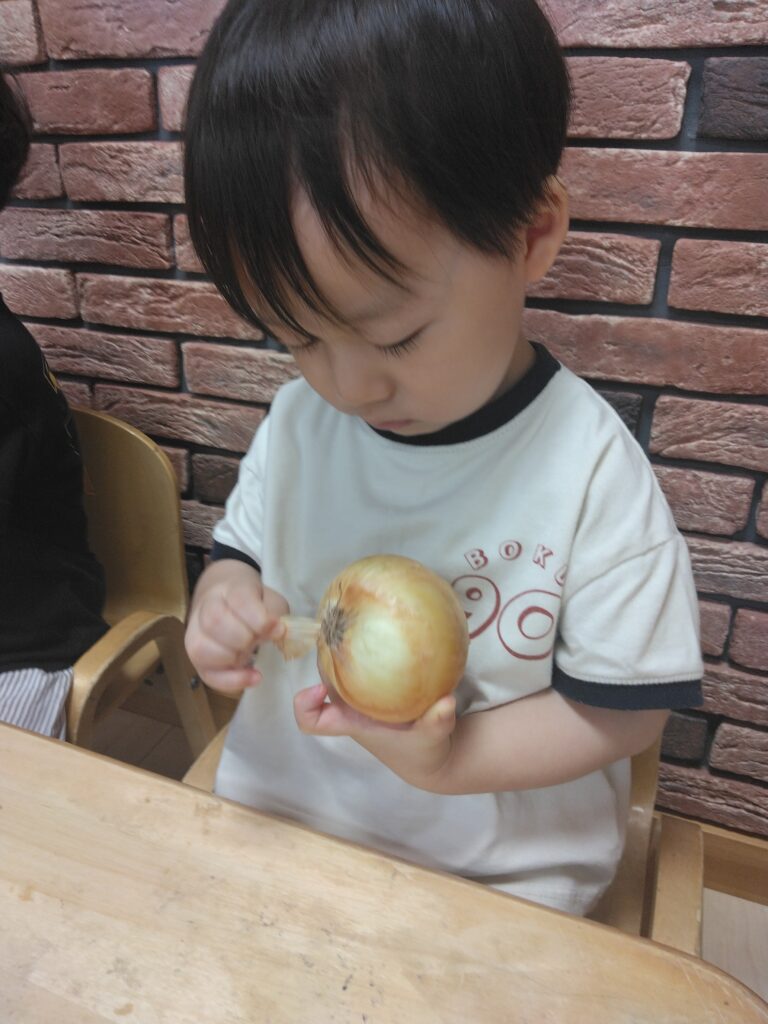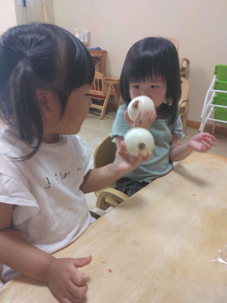 今日は食育で、2歳児さんが玉ねぎの皮剥きに挑戦しました🧅