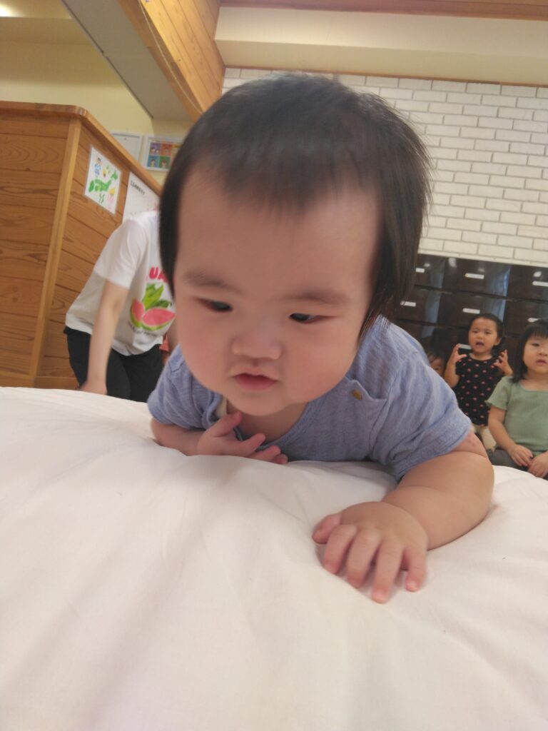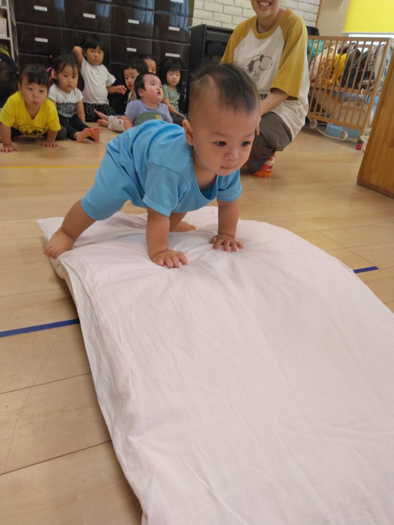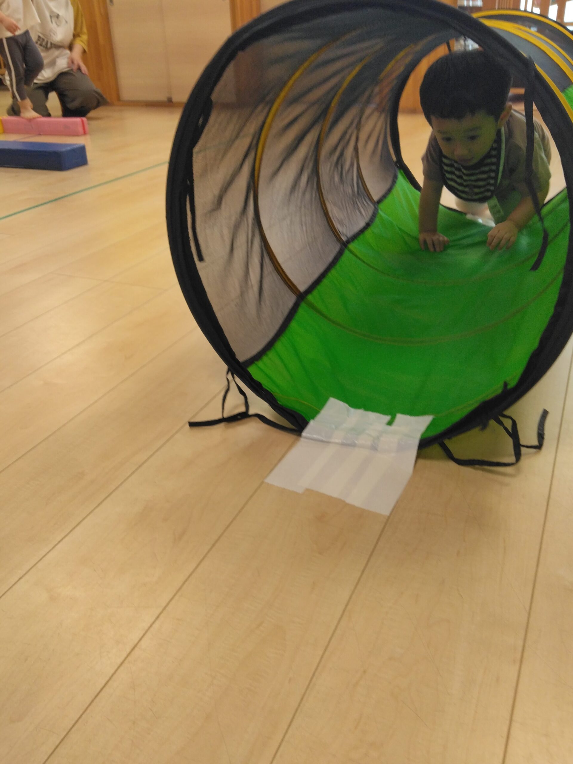障害物競走では0歳児さんからスタートです。1,2歳児さんの大きな声援の中布団のお山を乗り越えて行きます!