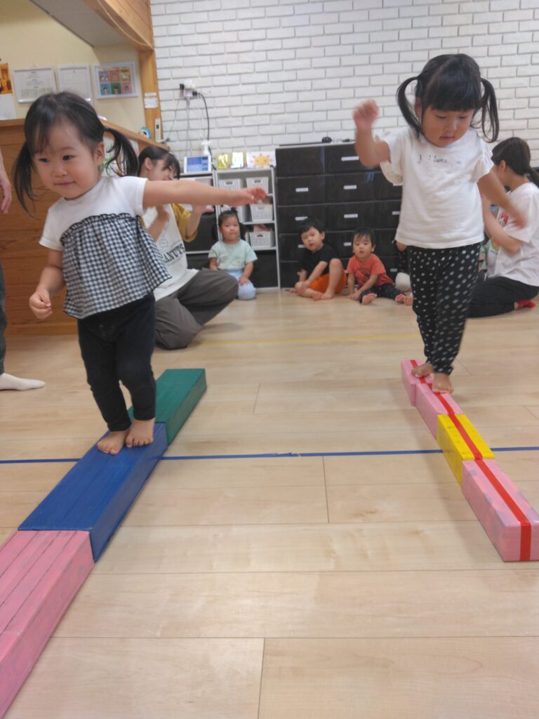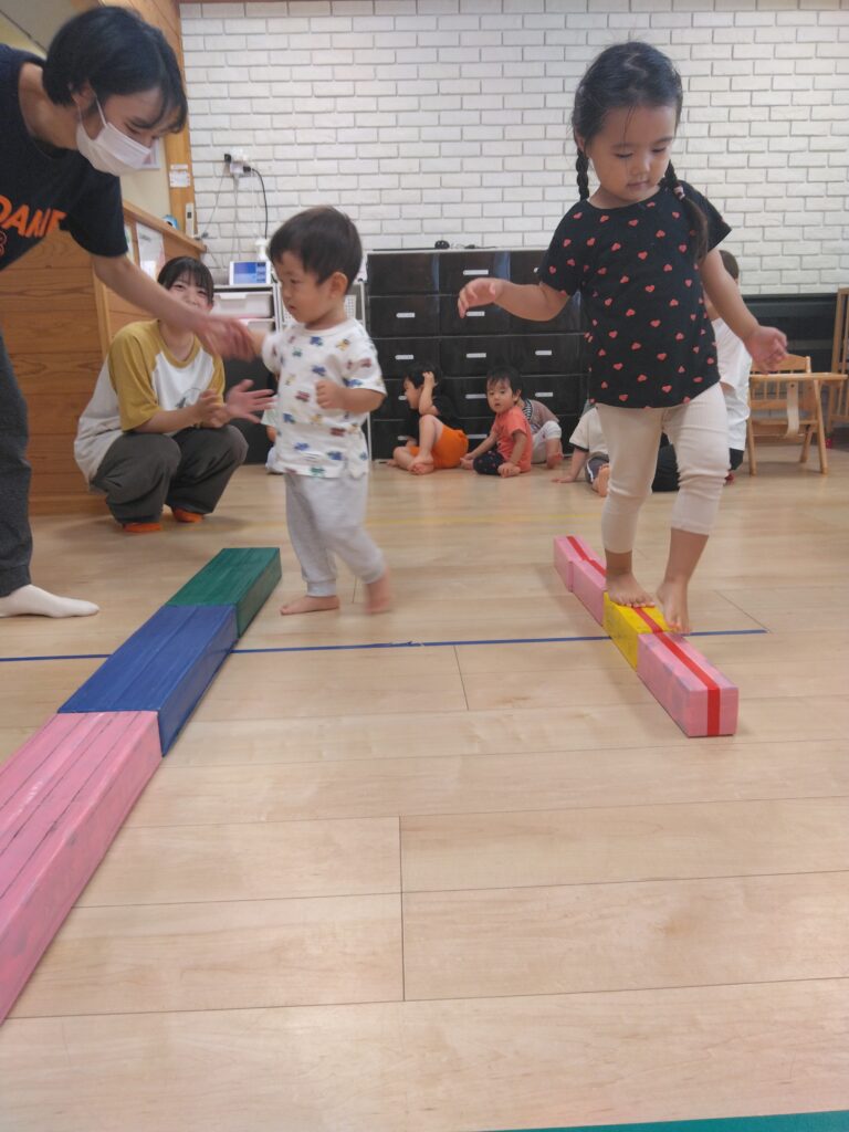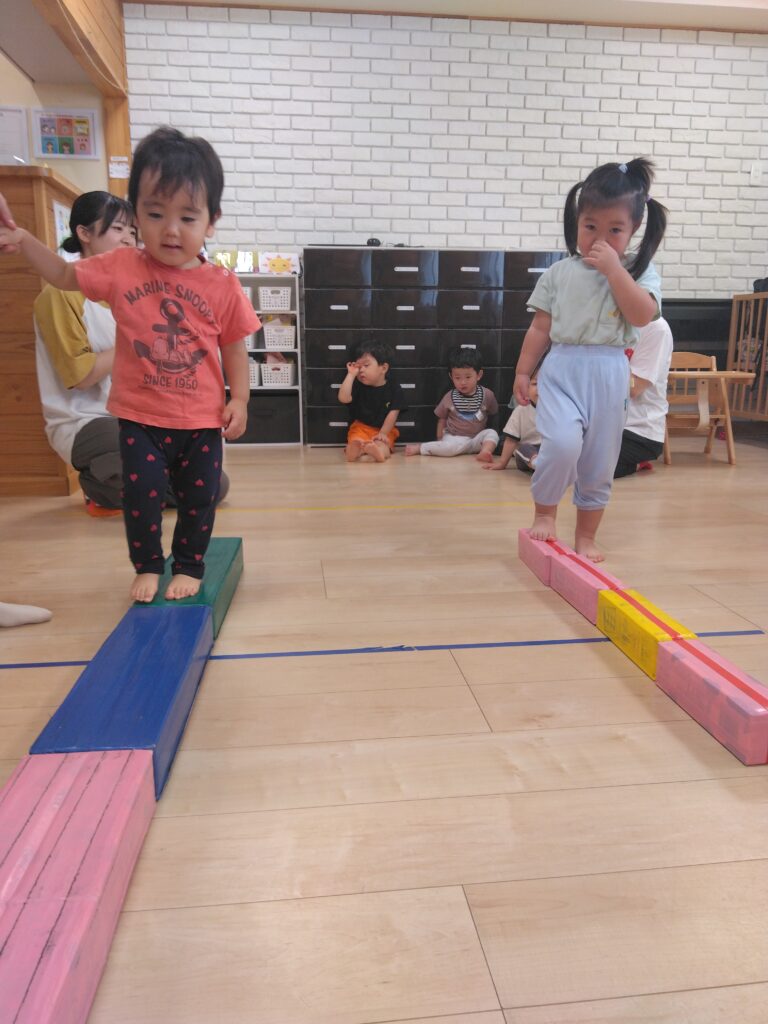 1,2歳児さんは平均台からスタートです。バランスを崩しても再挑戦!両手を広げたり、保育者の手を握ったりして渡っています🤗