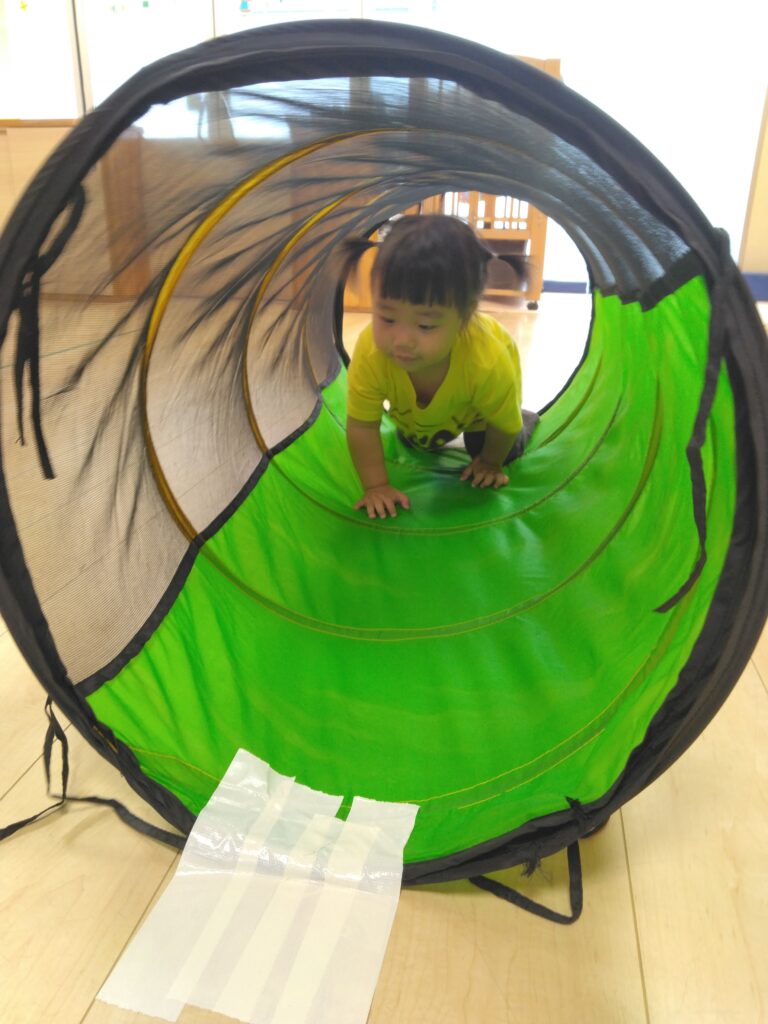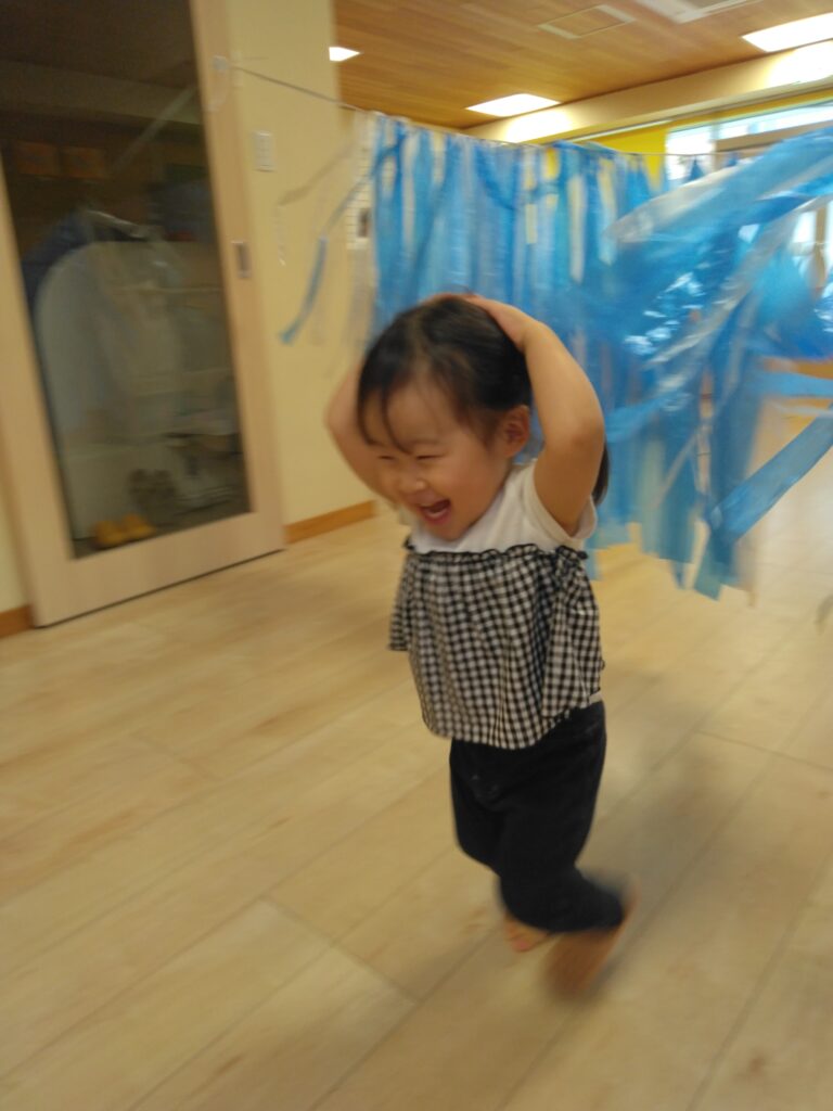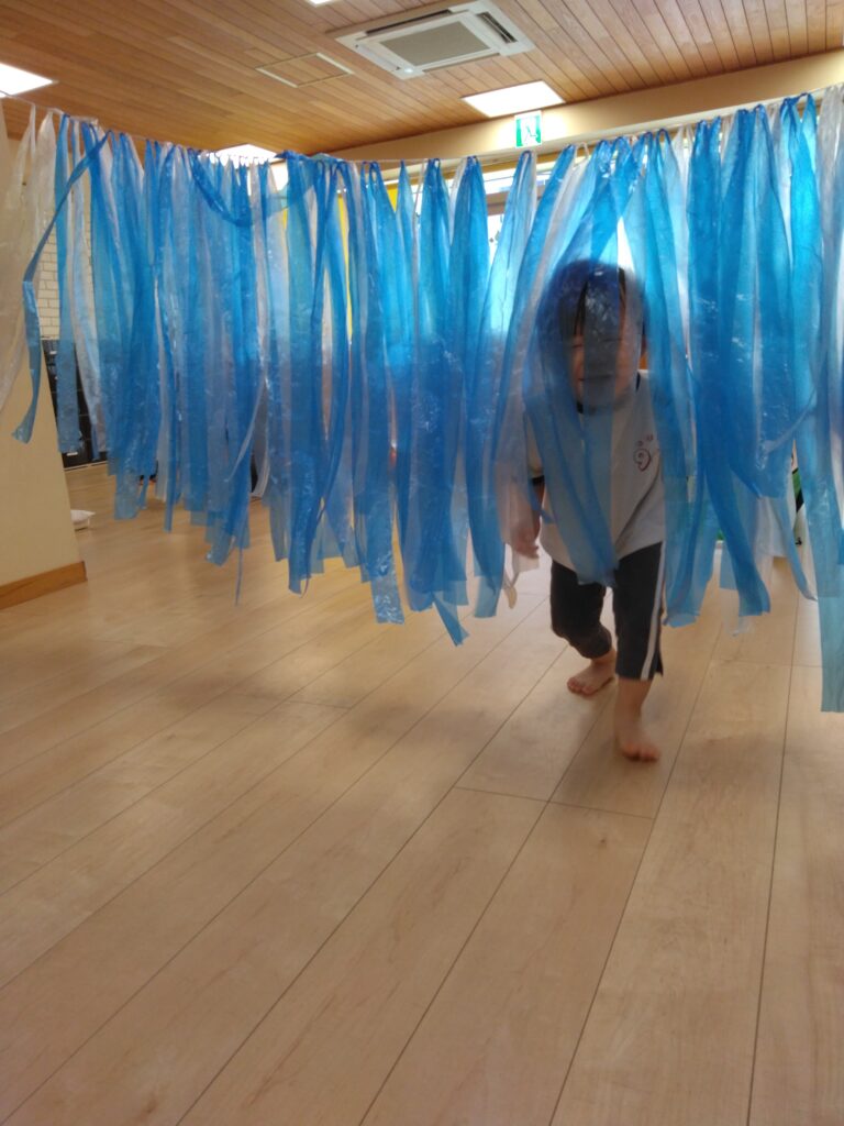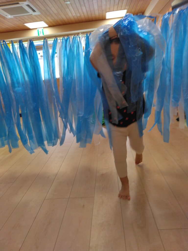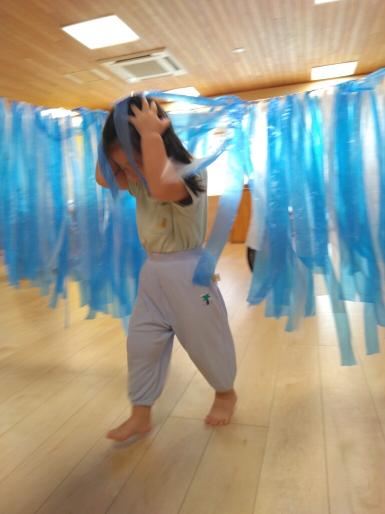 大雨が😆☔濡れないよう頭を守る子、感触が楽しくお顔からくぐっていく子と様々です。感触が面白いですね😉