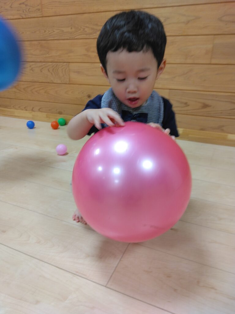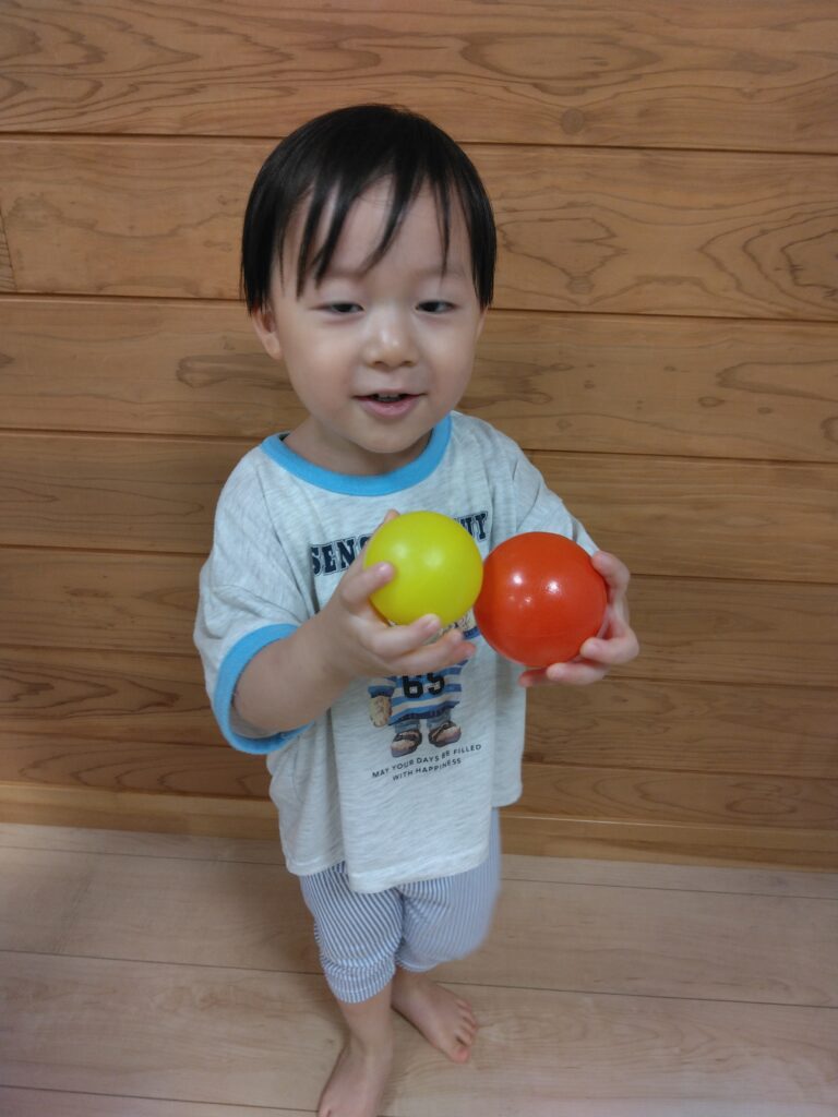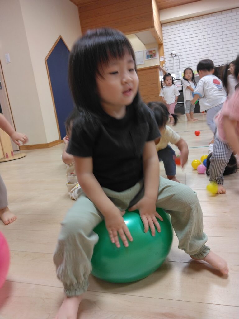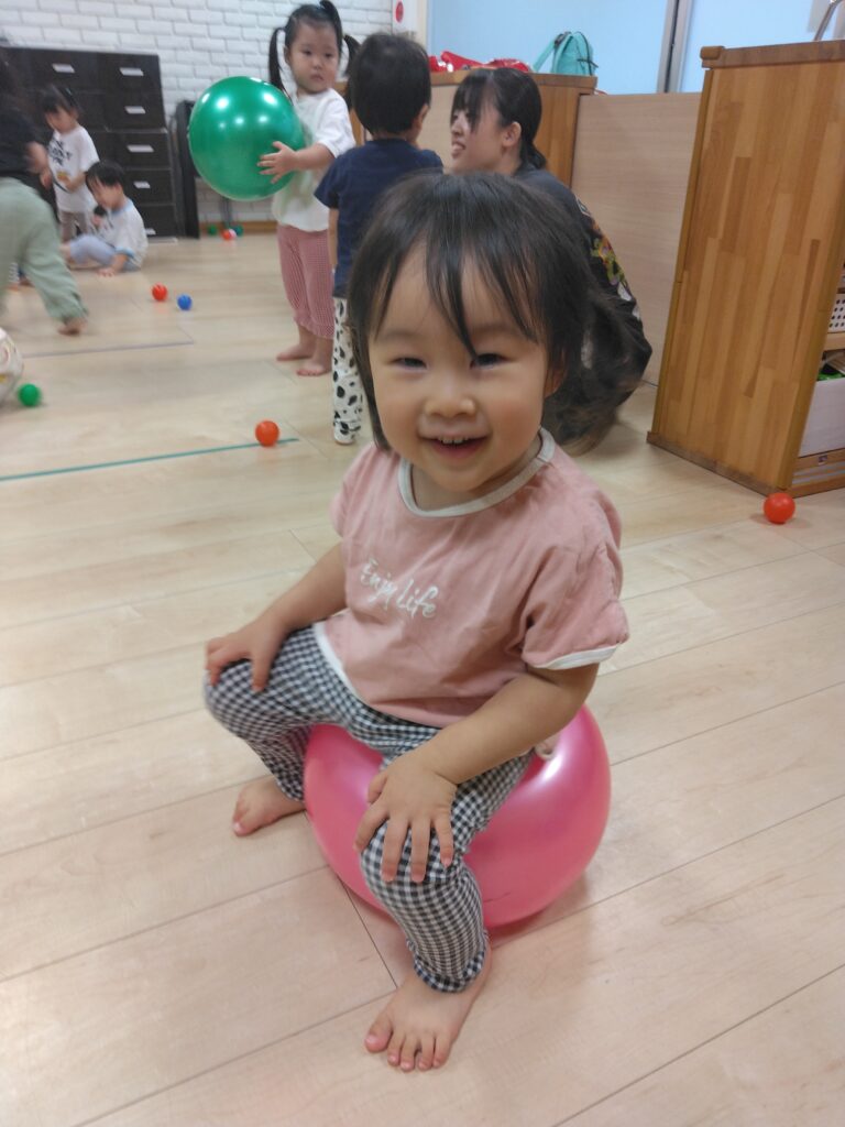 2歳児さんが上手にお尻を弾ませたり投げたりして遊ぶ様子を見て、真似ている1歳児さんです🌟