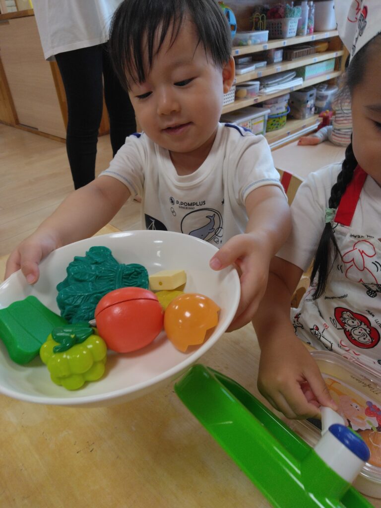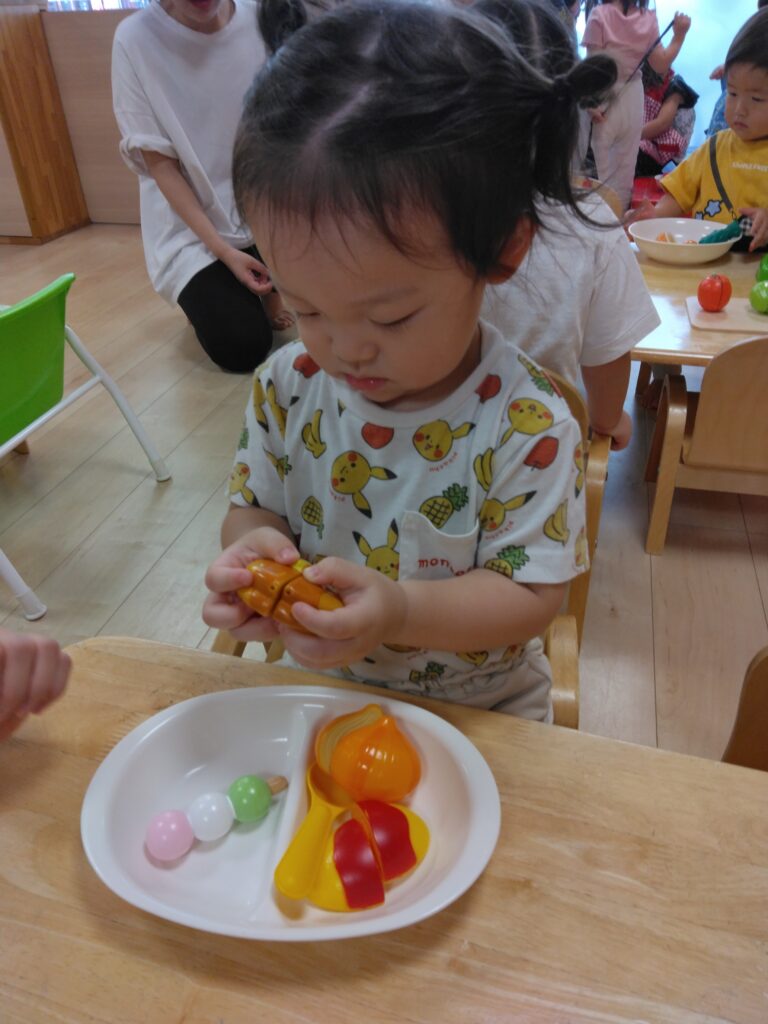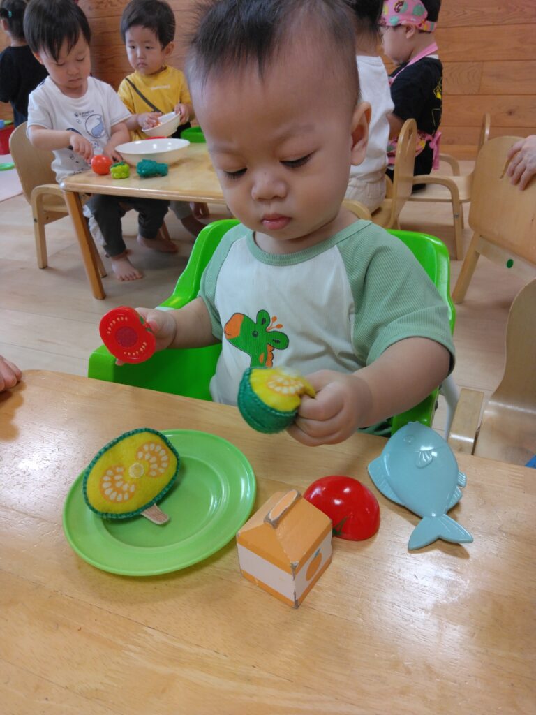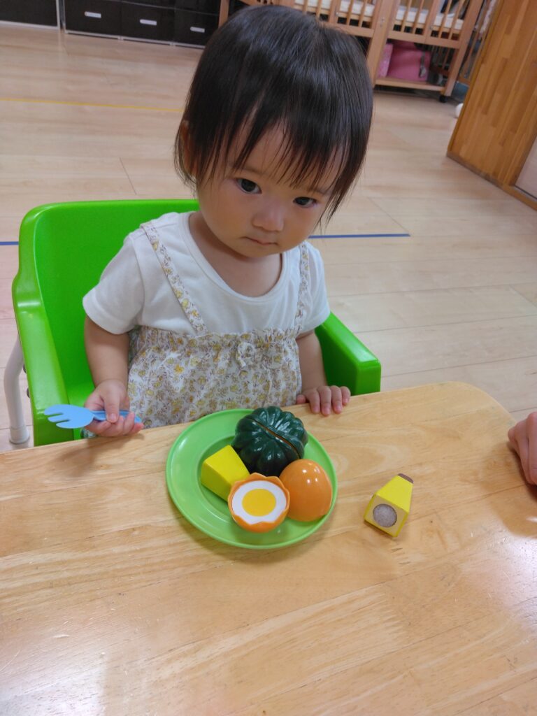 その後はおままごと。0歳児さんも椅子に座って食材に手を伸ばしたり、時々口に入れようとしたりしていましたよ🍅