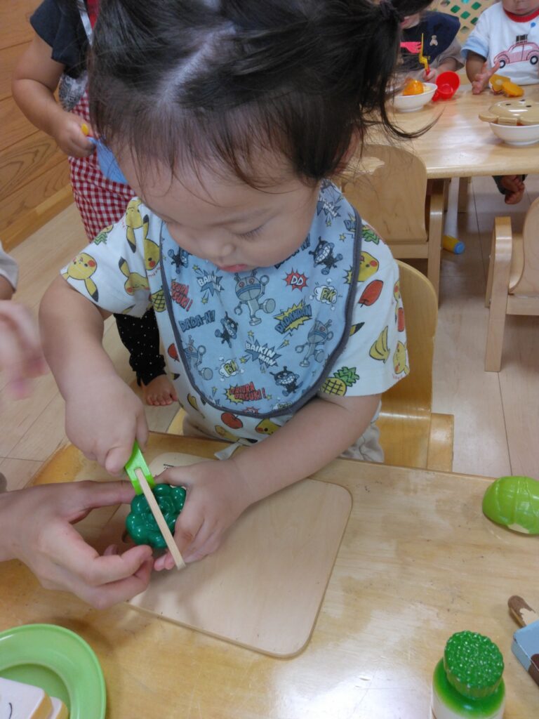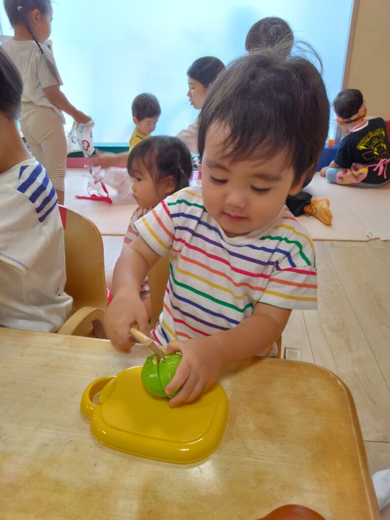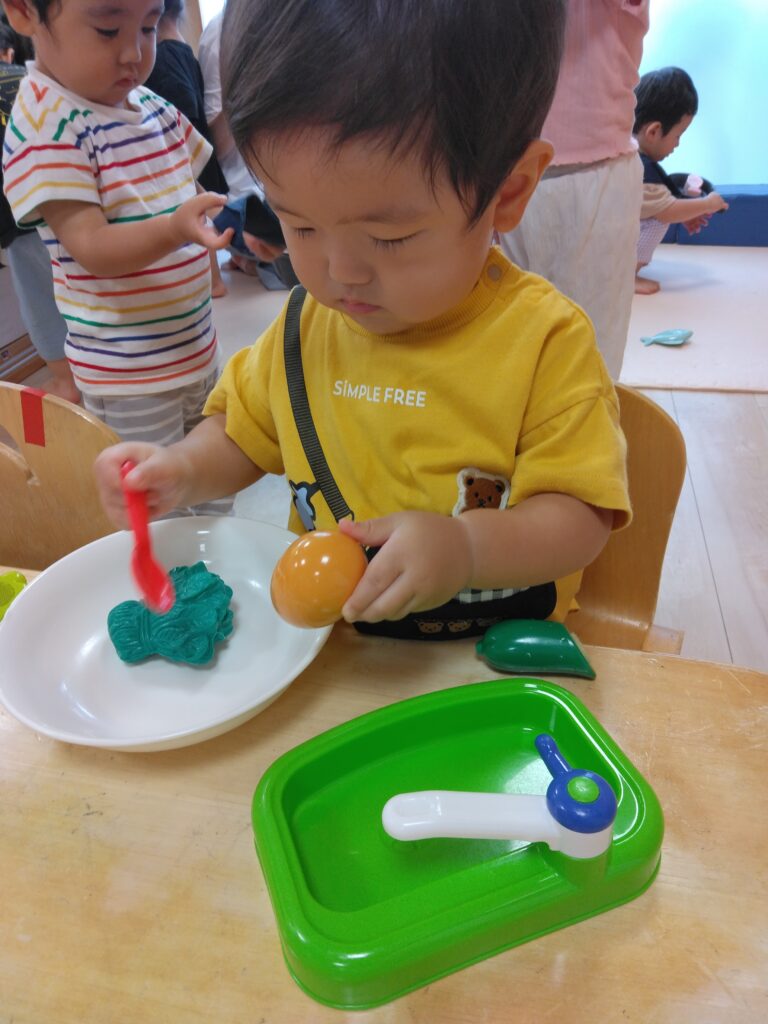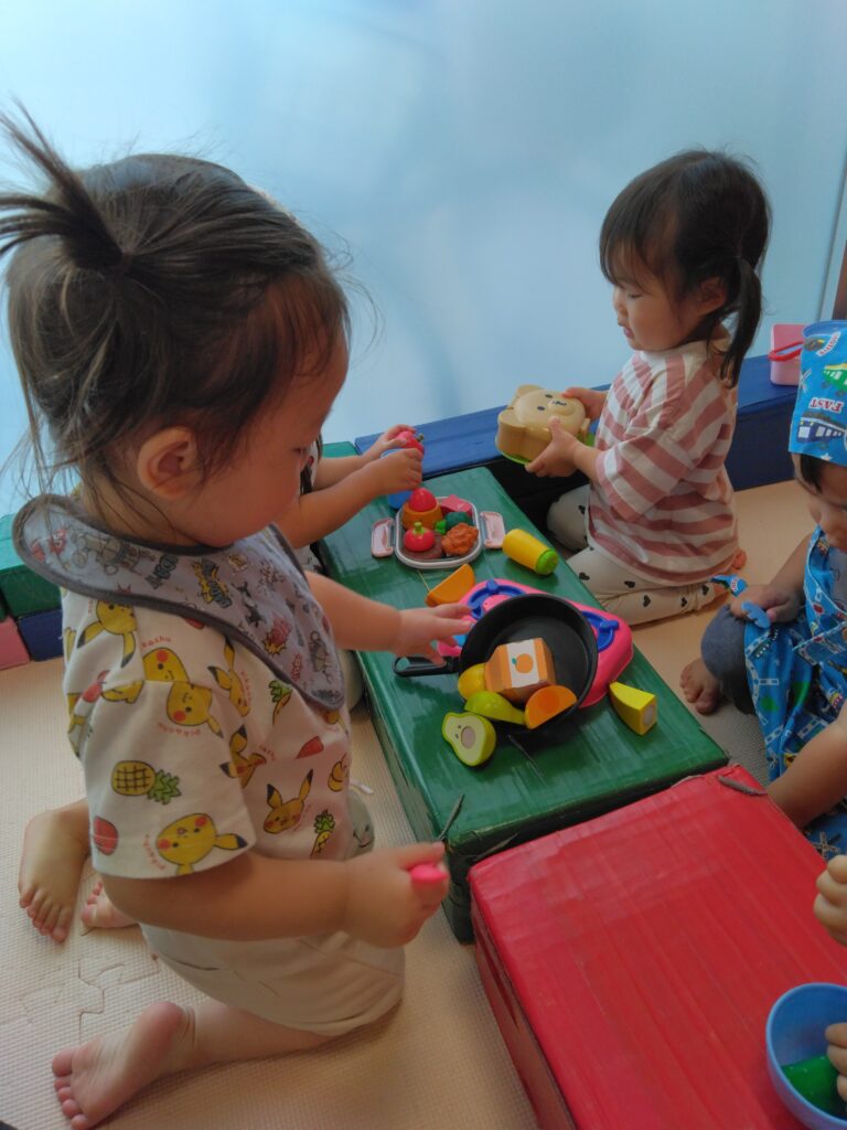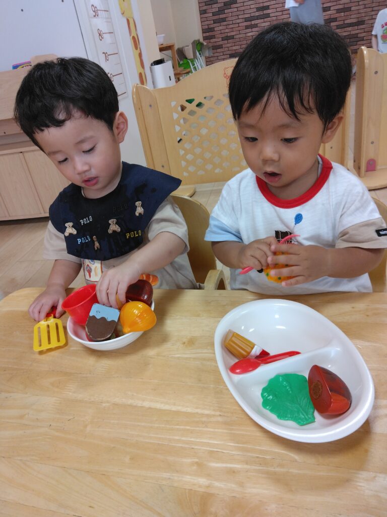 その後はおままごと。0歳児さんも椅子に座って食材に手を伸ばしたり、時々口に入れようとしたりしていましたよ🍅