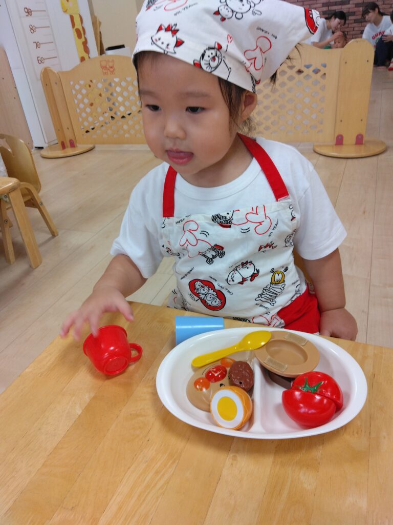 食材を足したりお友達にあげたりしていくうちに、自分好みのプレートに変身。スプーンやコップなど、上手に使っていましたよ。