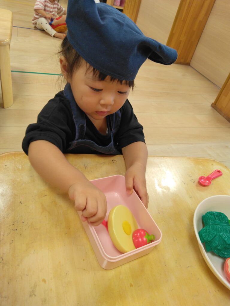 2歳児さんはお皿や弁当箱に食材を詰めて…