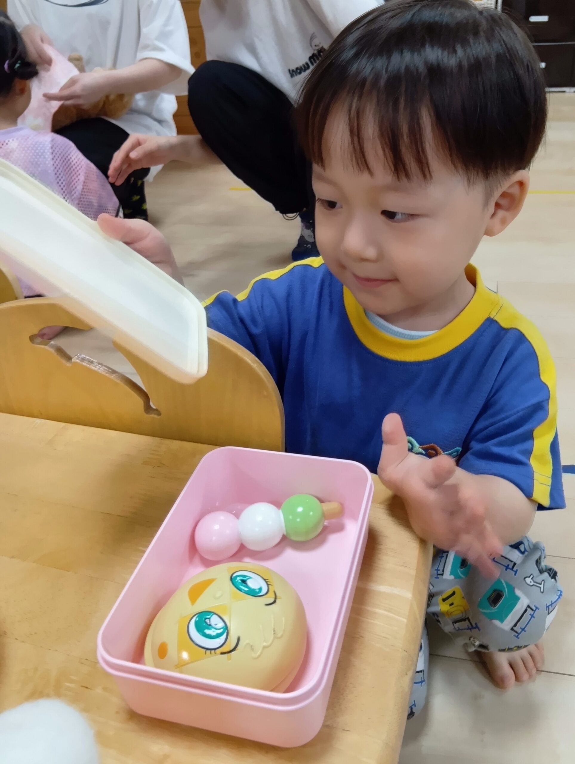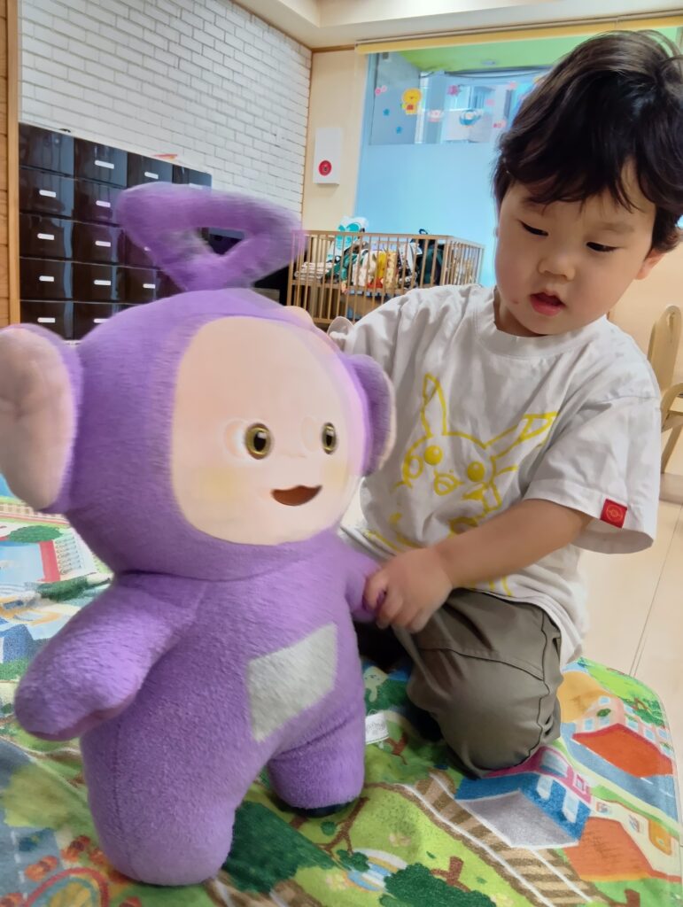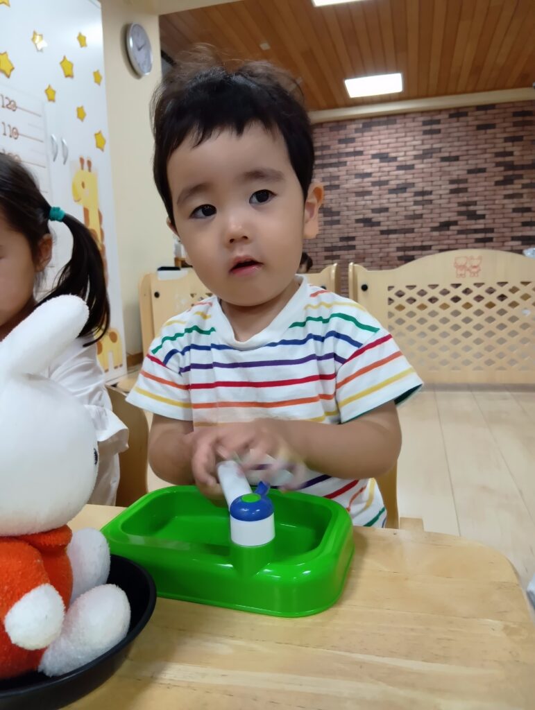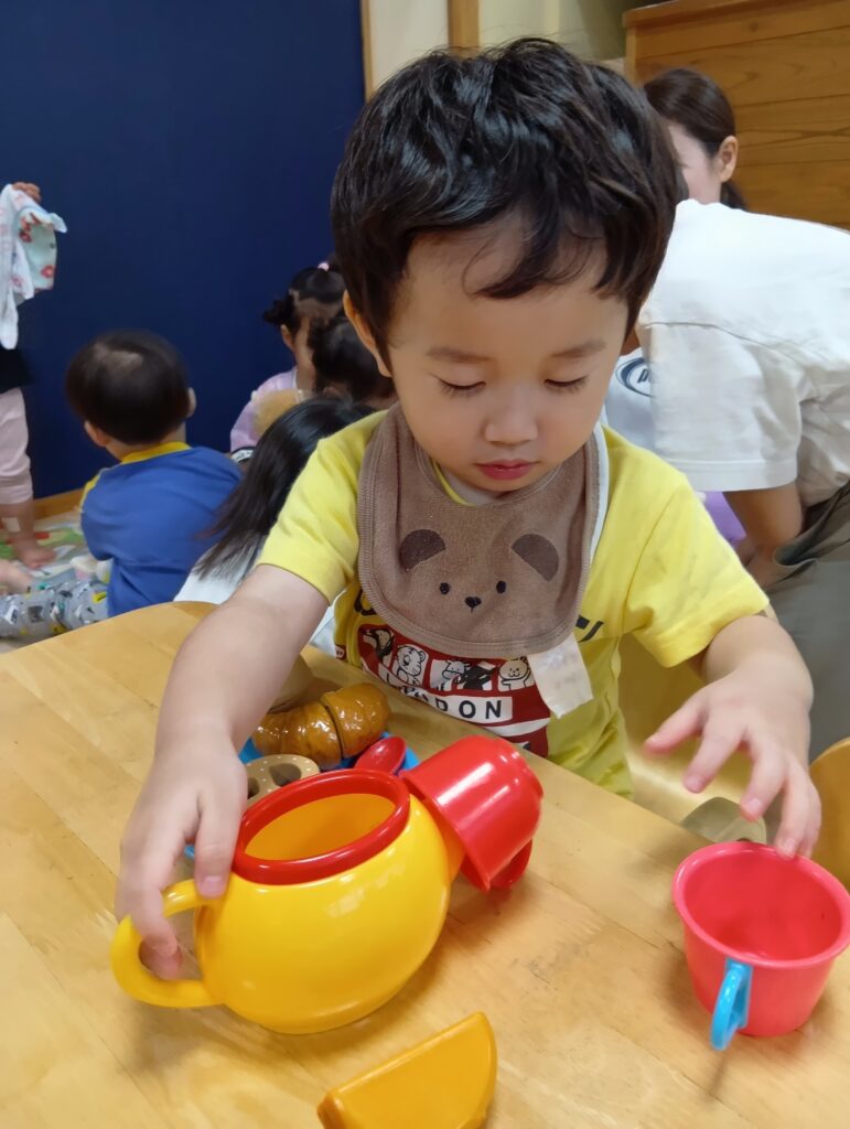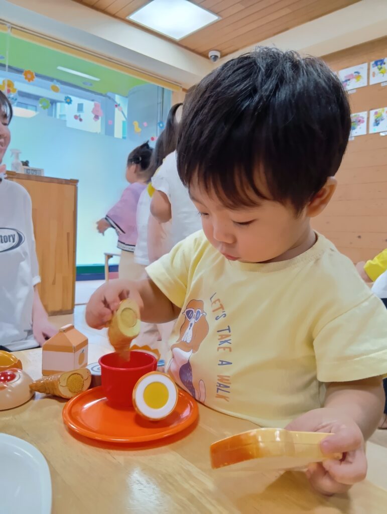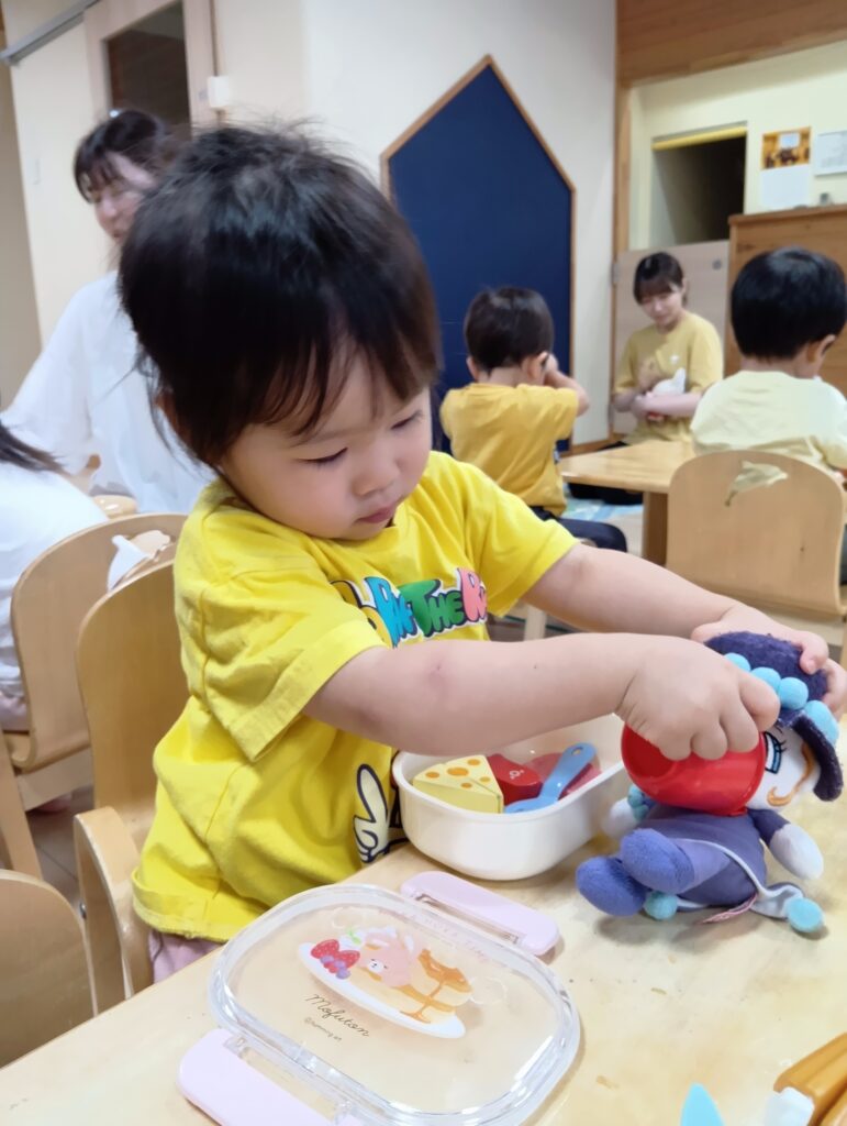 保育者と「かんぱーい」して嬉しそうにジュースを飲んだりお人形にも飲ませたり食べさせてあげていました☺️