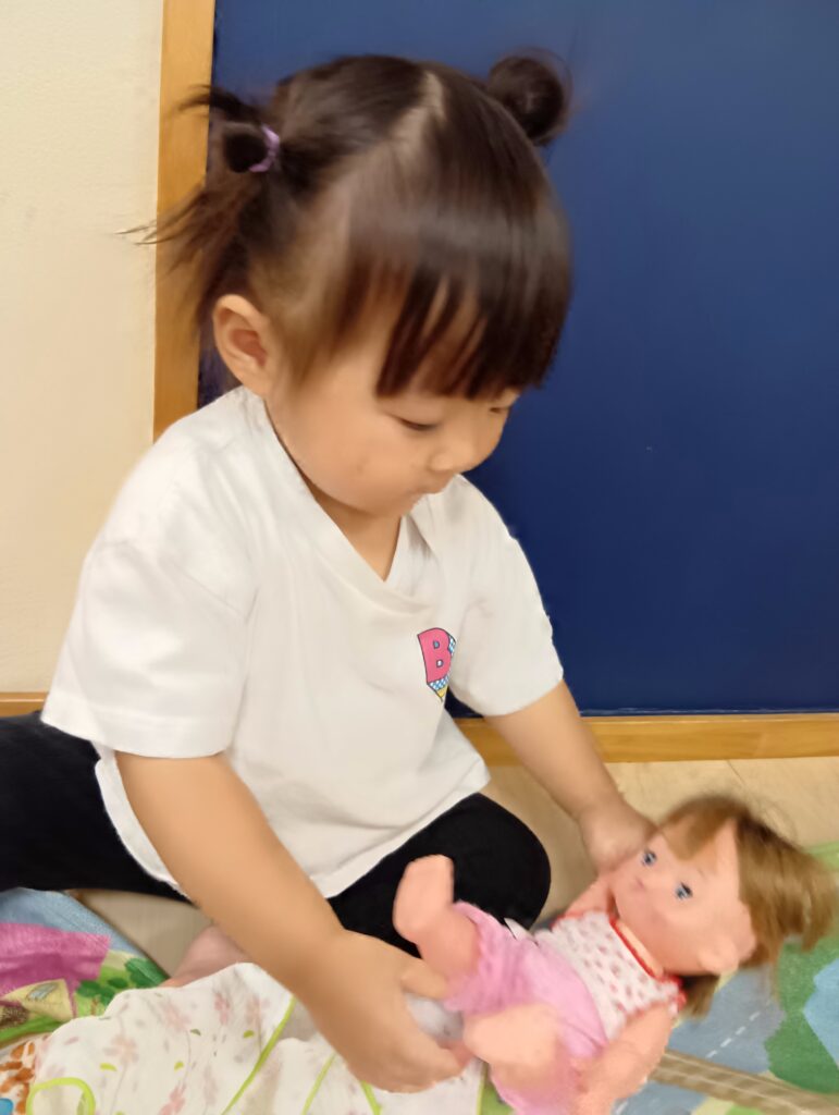 お人形にお布団を掛けて優しくトントントン⭐️寝かしつけも様になっています☺️✨️