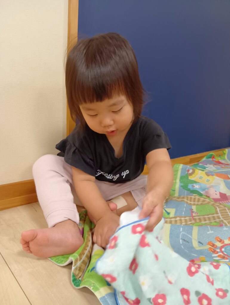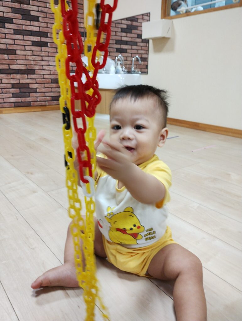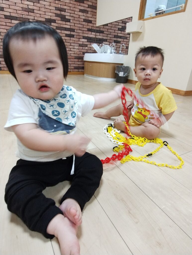 0歳児さんは缶の中からチェーンを引っ張り出して楽しんでいました☺️広い場所で嬉しそうにずりばいをしたり高ばいをしたりたくさん身体も動かしました✨️