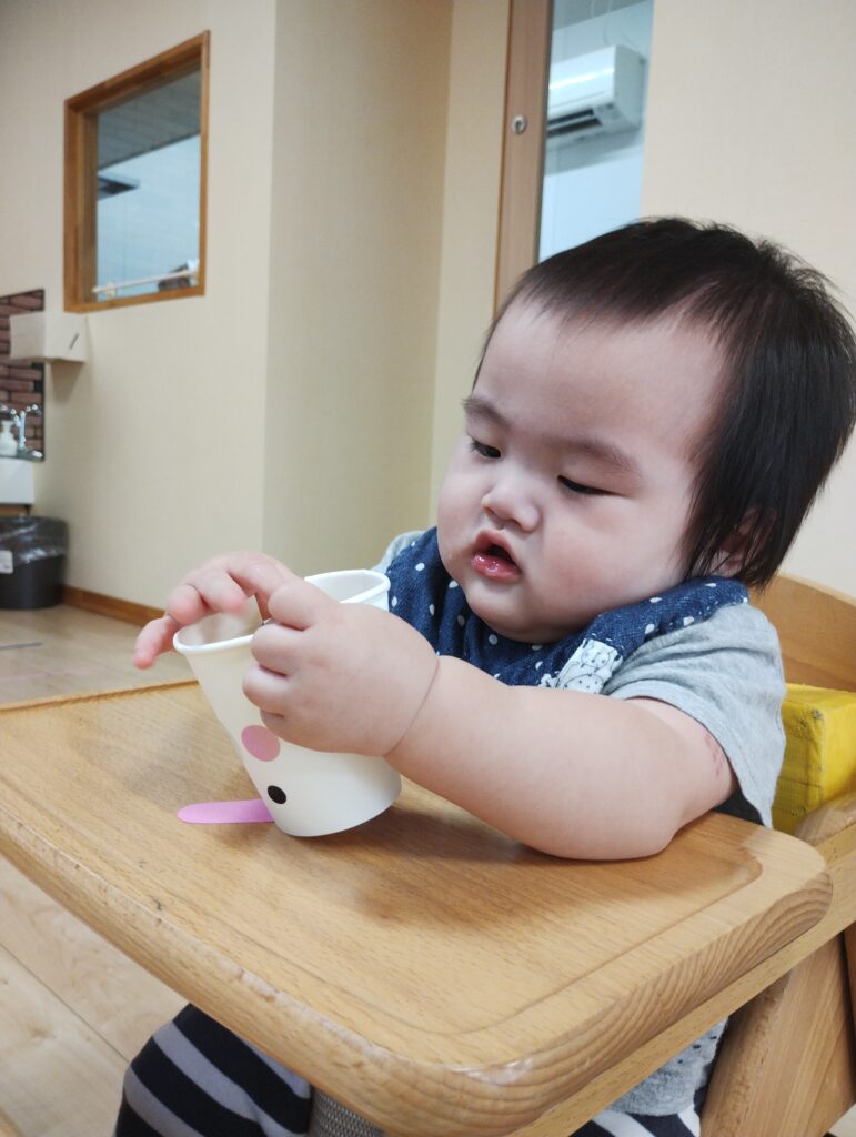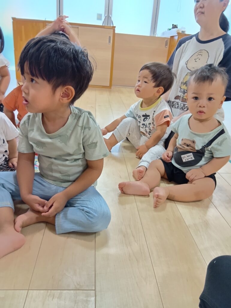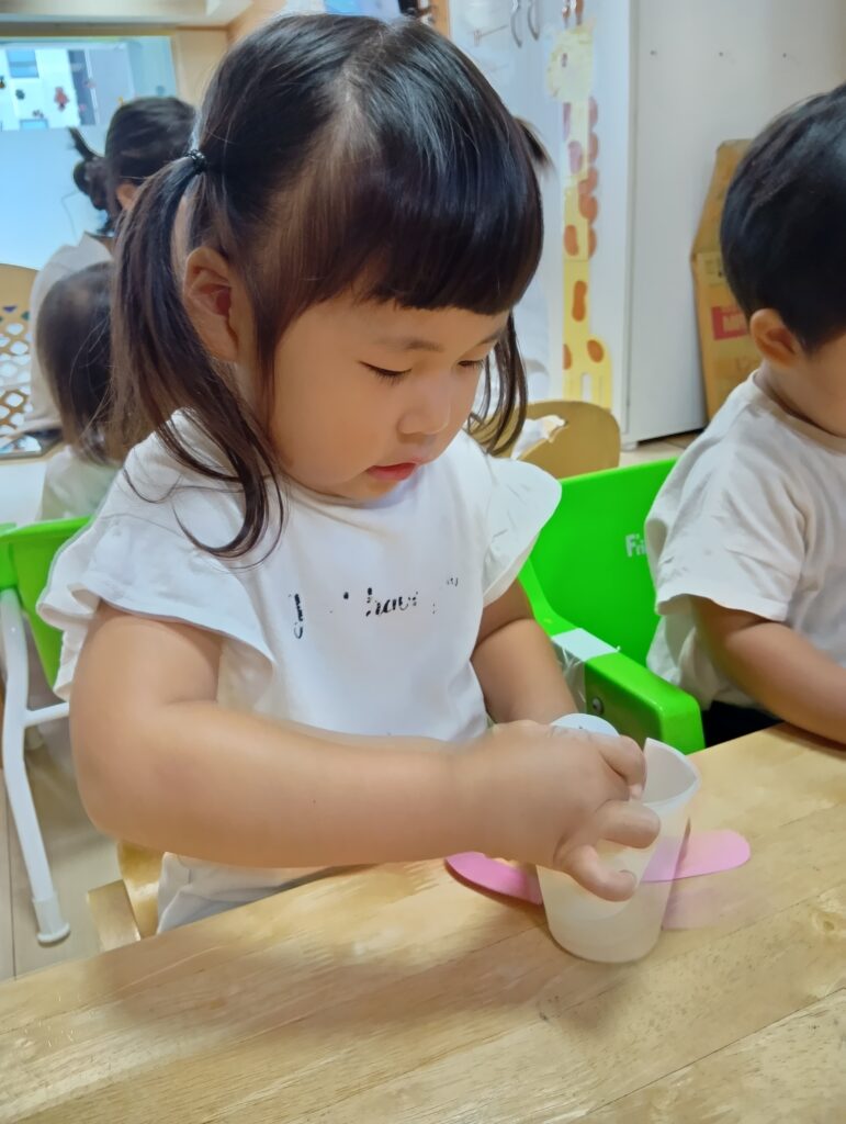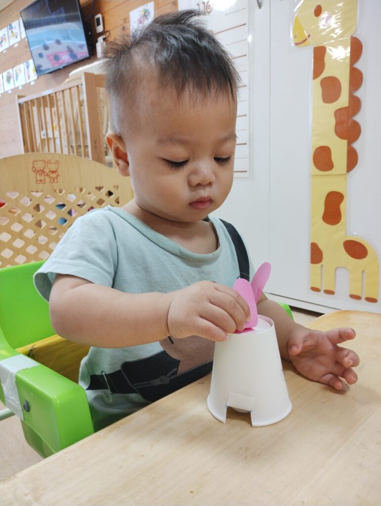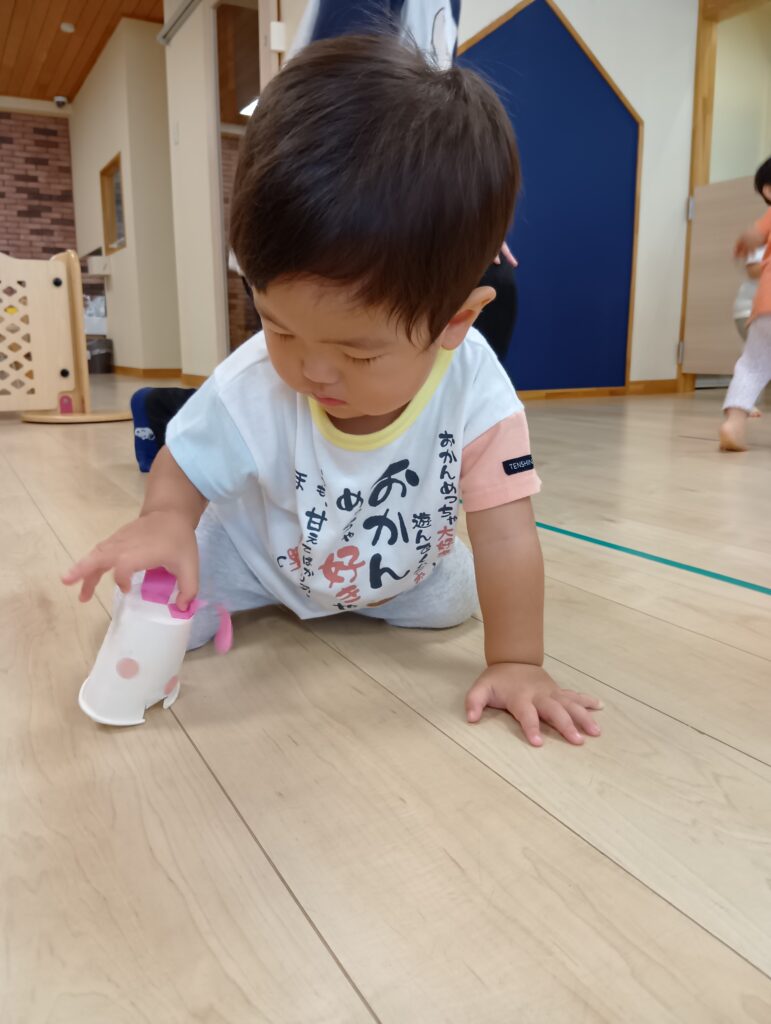 紙コップの中のキャップを回すと、ウサギが動き、驚く子どもたち。初めは保育者が回してあげていましたが、「自分でやりたい!」とチャレンジする姿もありました✨️